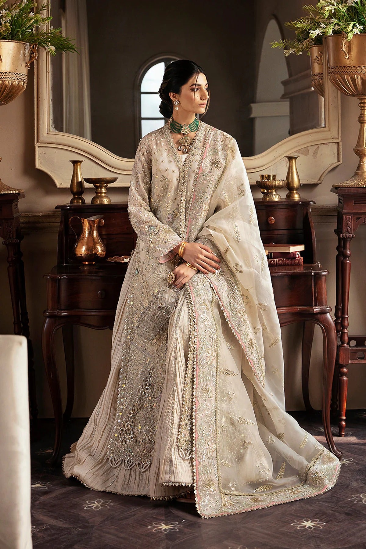 A celestially splendid silhouette, this ensemble feature a detailed Ash White Organza Jacket enhanced with embellishments and cutwork. The splendid organza dupatta is accentuated with Embroidered Borders, paired with Crushed Sharara Pants, curating a stunning look and embodying an aura of subtle serenity