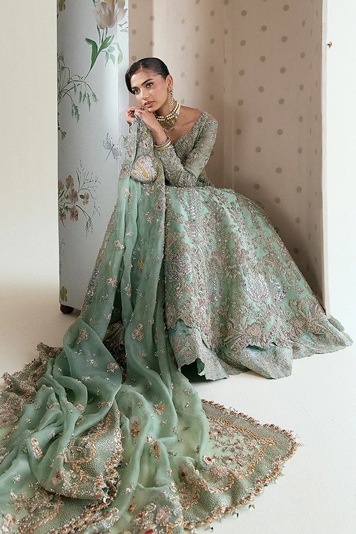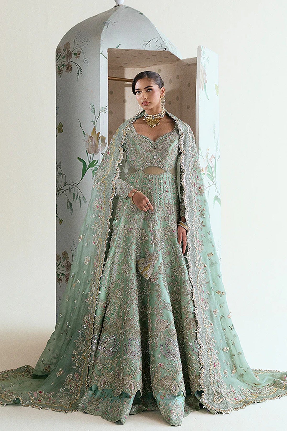 - Sage green pishwas with sweetheart neckline, shoulder cutout, and 10-panel design featuring moroccan, turkish, and south asian suzani motifs with mirror and pastel detailing