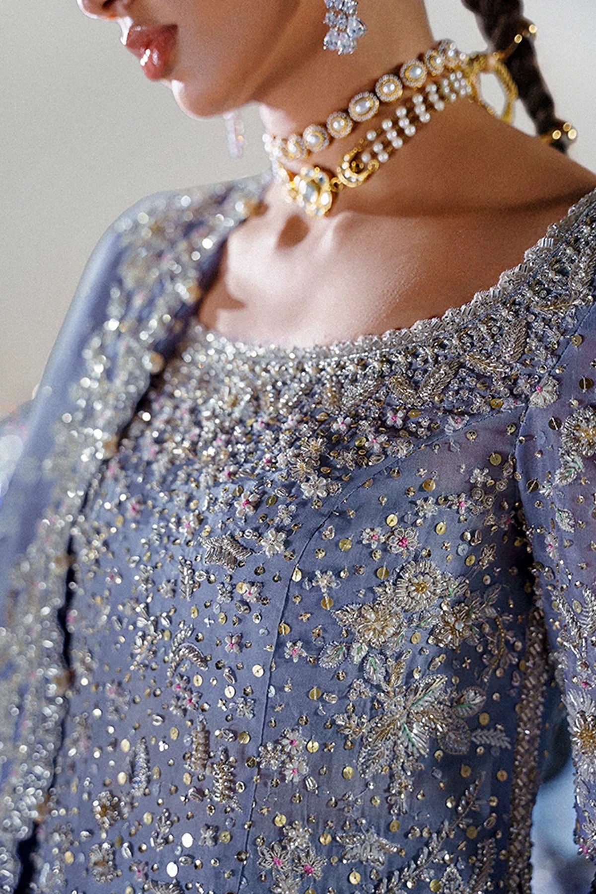 - Matching organza dupatta with floral spray and pearl-enhanced corners