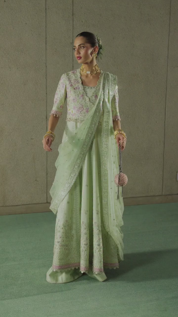 - Double‑drape net dupatta with embroidered borders and mesh spray in middle layer— versatile to style across or to side.
