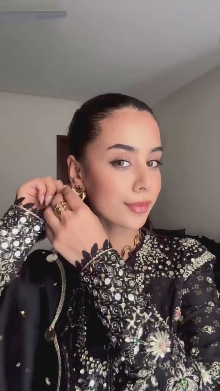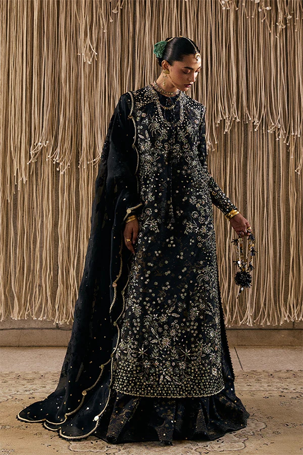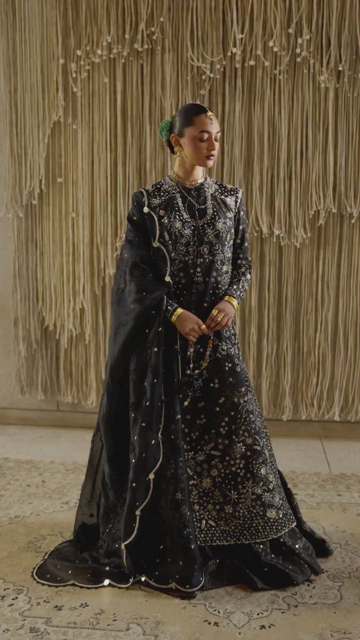 - Organza dupatta in same coal tone, scalloped border, gold sequin coin tassels.