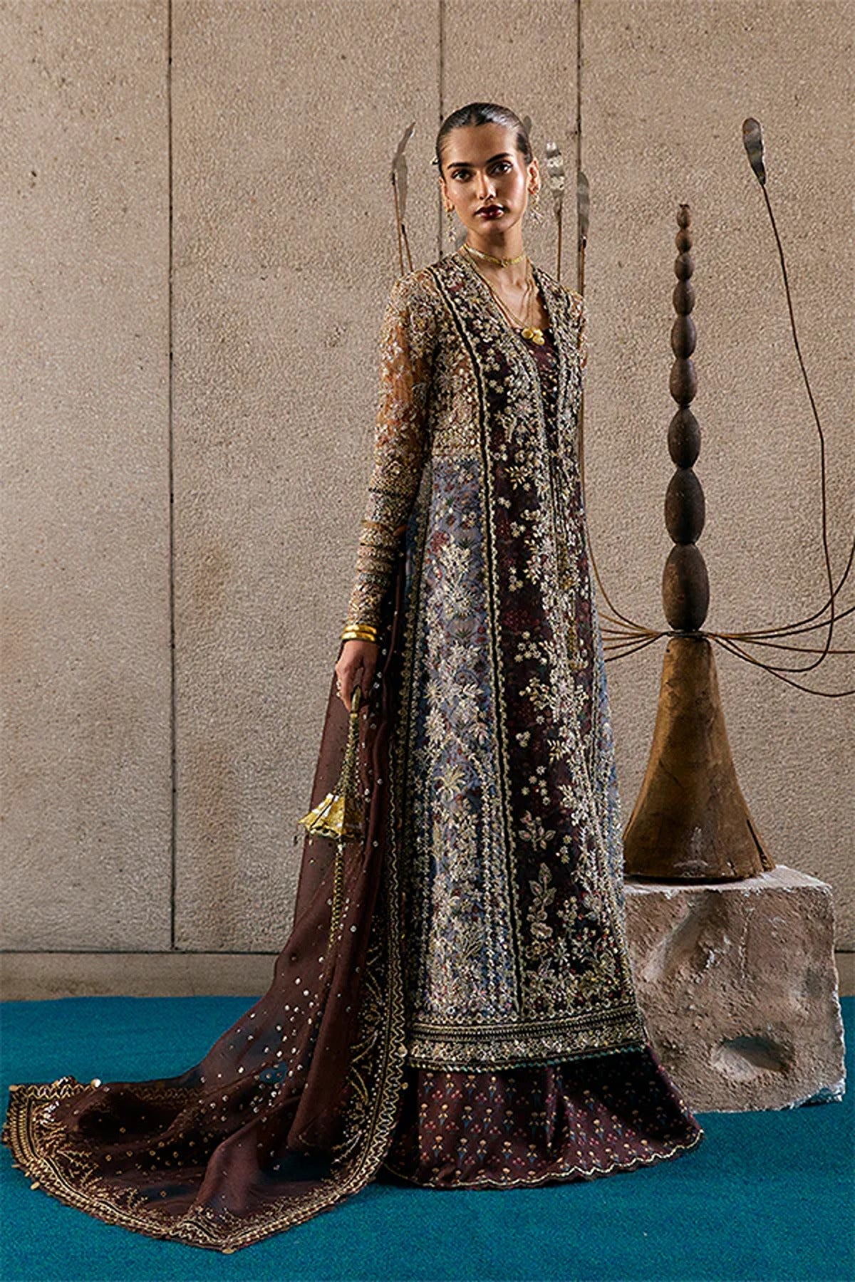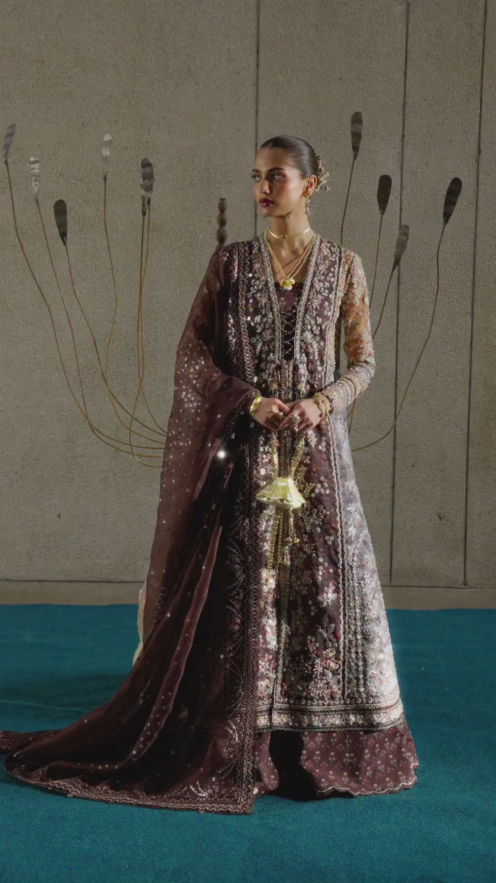 - Sharara in printed grip silk, dark brown tone with scalloped edges.