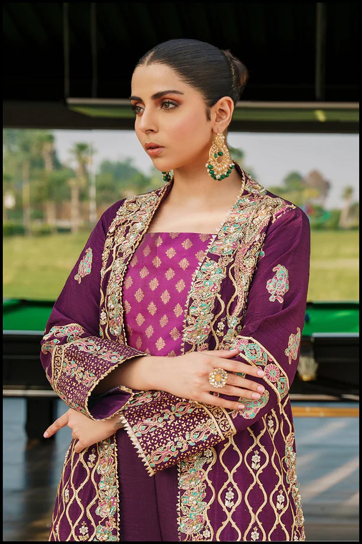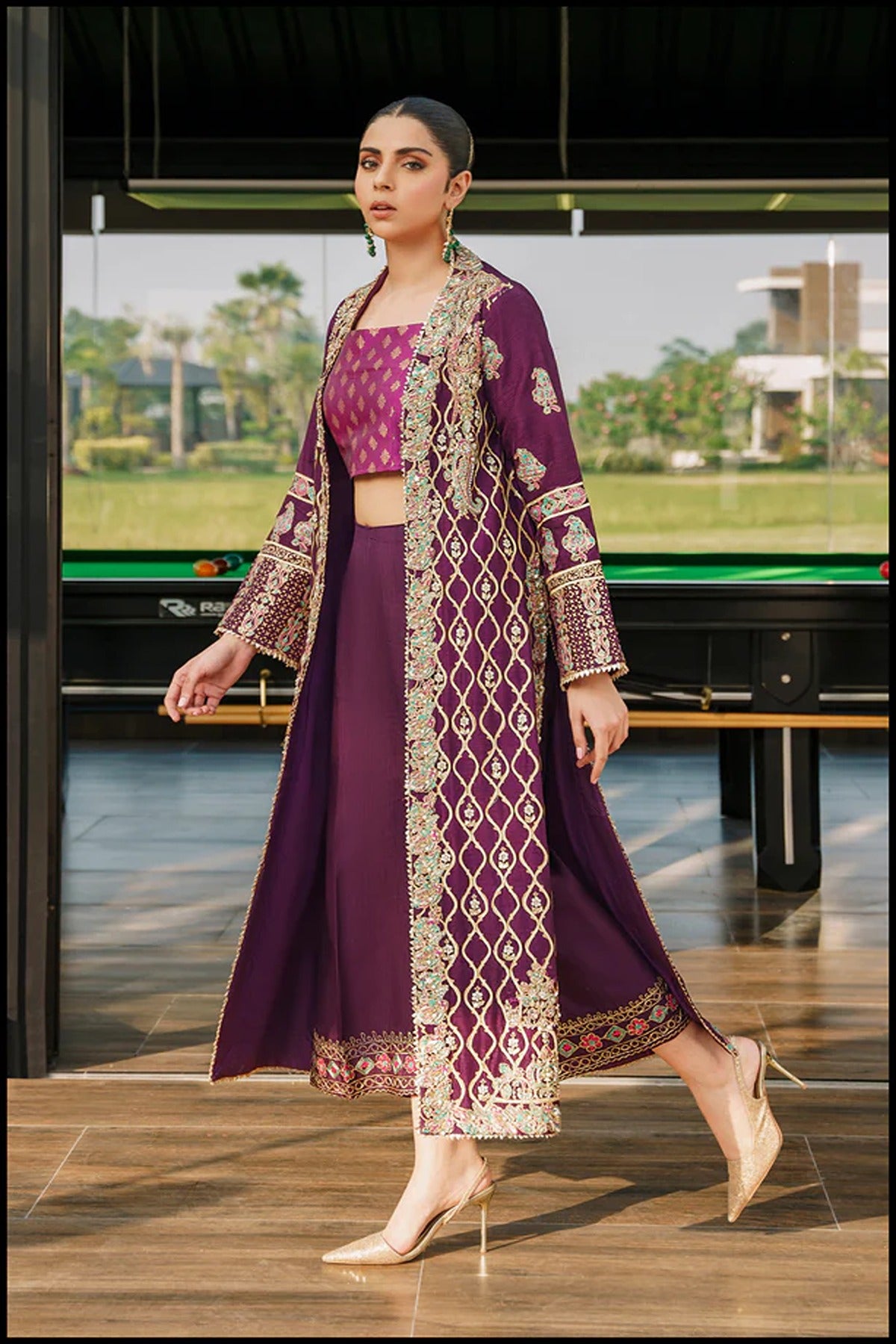 Geomatrical pattern with blick print effect highlighted with our modern style of craftsmanship. Where naqshi and stone work describes the beauty of the glamorous pieces. Its paired with a inner having a front open jacket and silk pants the beautiful jamawar inner describes the sleek look to our collection piece