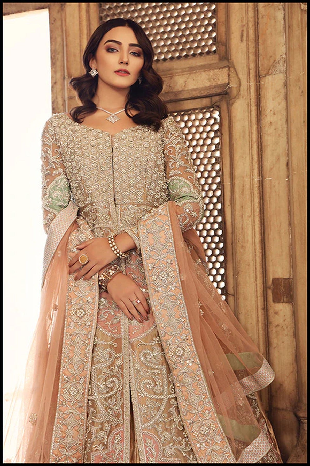 A recollection of enchanting spring. Shades of peach featuring in the pure tissue fabric make up the layers of this ensemble with silver floral embellishments stretching throughout. An earthly pistachio green and a sharp peachy pink add a harmonious contrast to the outfit. The net dupatta commends the pastel colours with its exquisite work on the matha patti paired with an analogous 3 sided lace.
