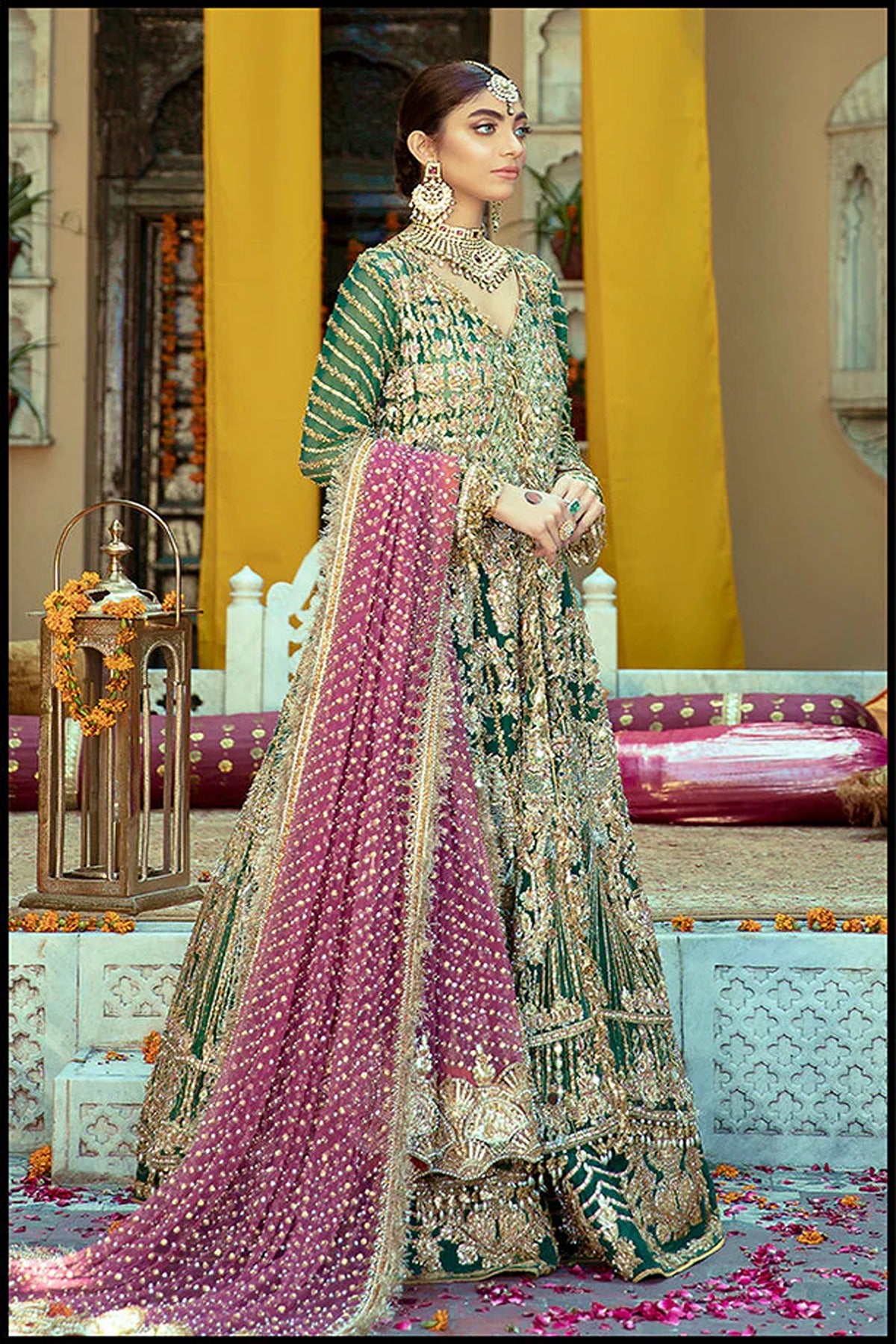- Teamed up with an emerald green lehnga in panels with gold floral motifs and a beautiful pale pink heavily embellished dupatta.