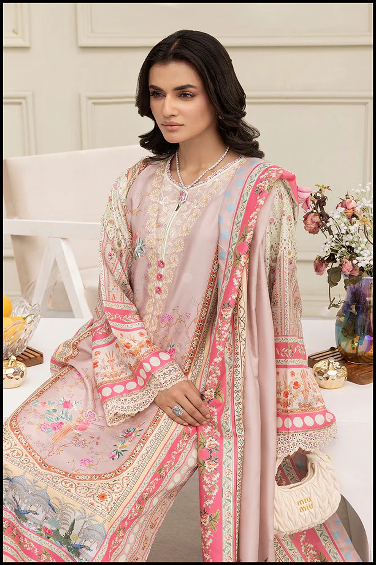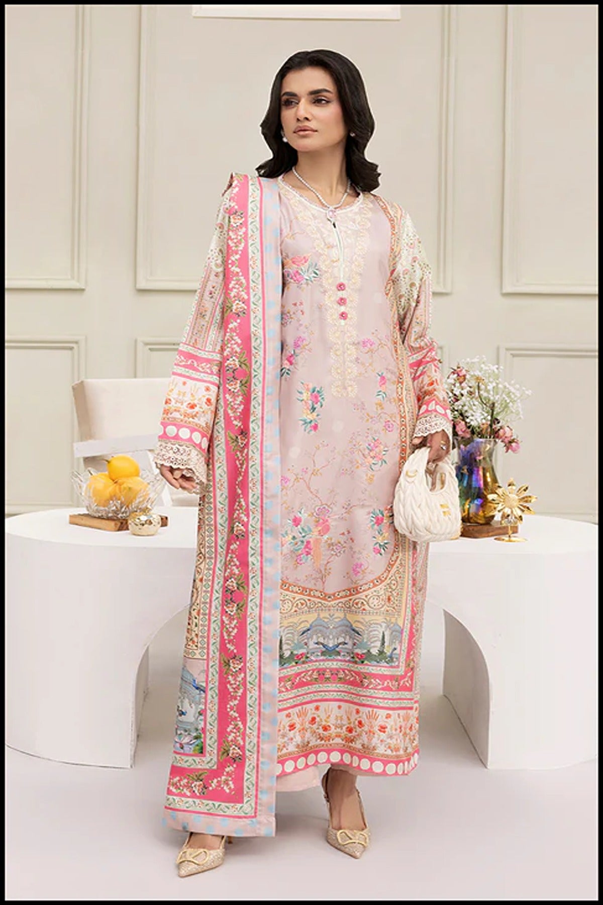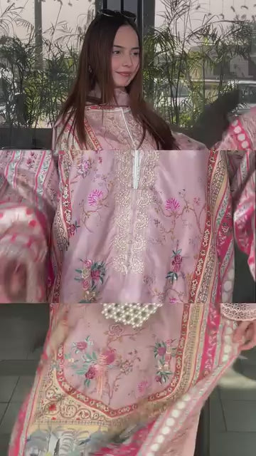 Step into a world of timeless elegance with Blush Reverie, a breathtaking three-piece ensemble crafted from the finest raw silk. Adorned with delicate embroidery in soft pastel hues, this outfit captures the essence of grace and sophistication. The intricately designed kameez features floral and paisley motifs, exuding a romantic charm, while the matching dupatta, lined with an exquisite border, drapes effortlessly for a regal finish. Paired with coordinated trousers, this ensemble is the epitome of understated luxury—perfect for daytime festivities or evening soirees.