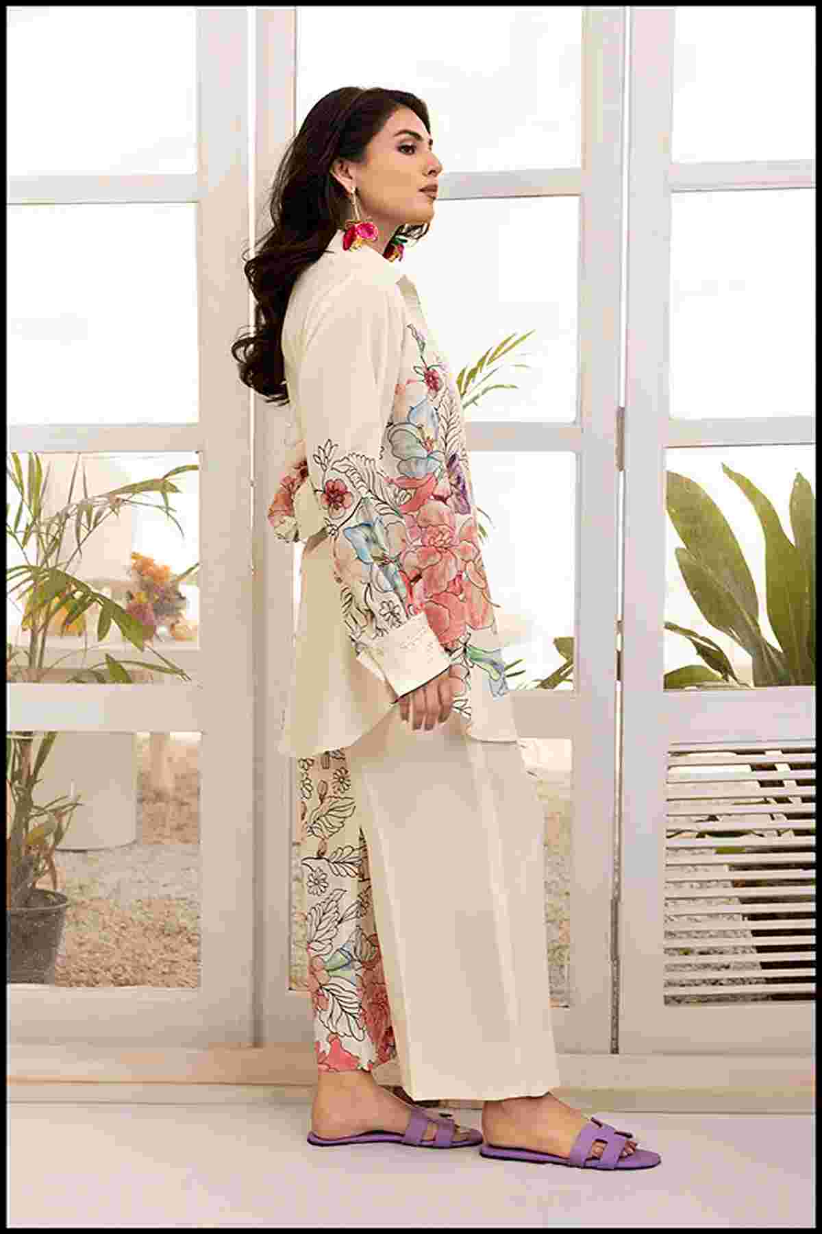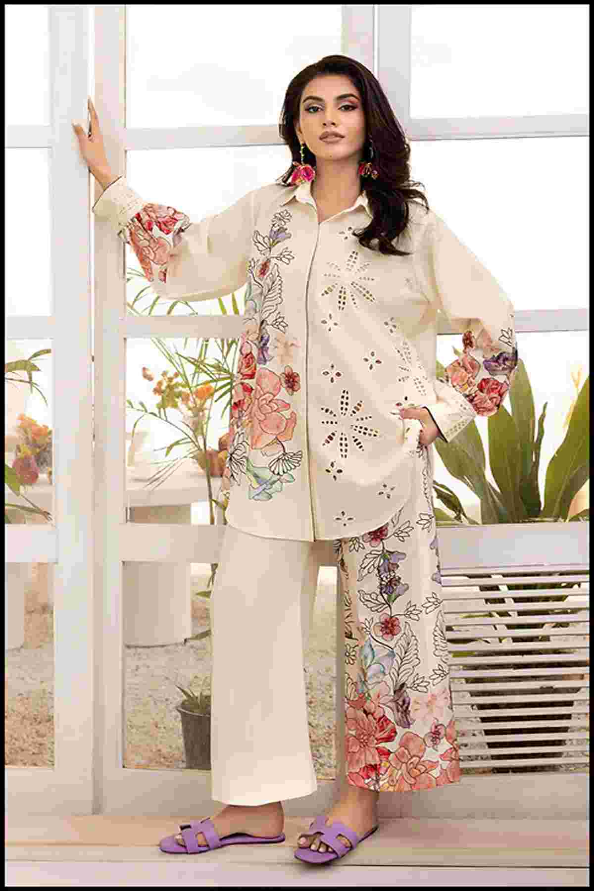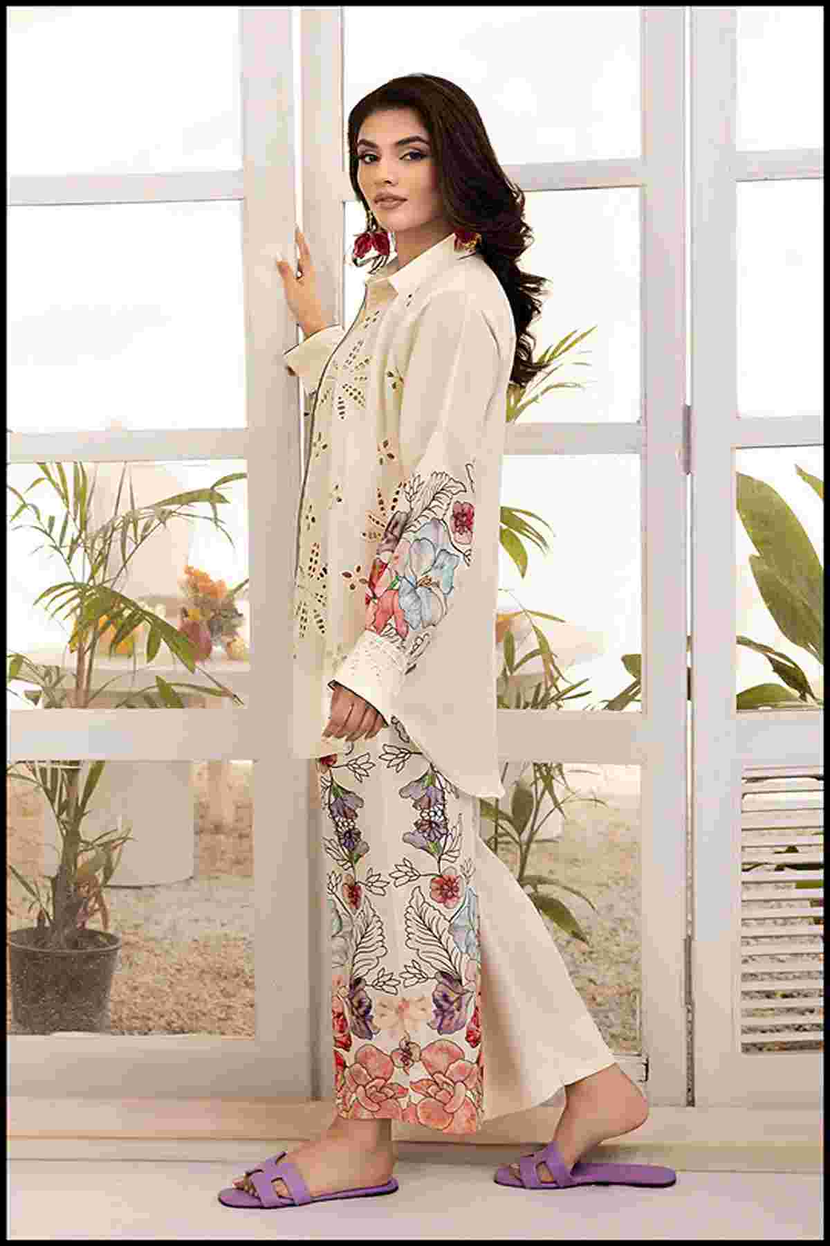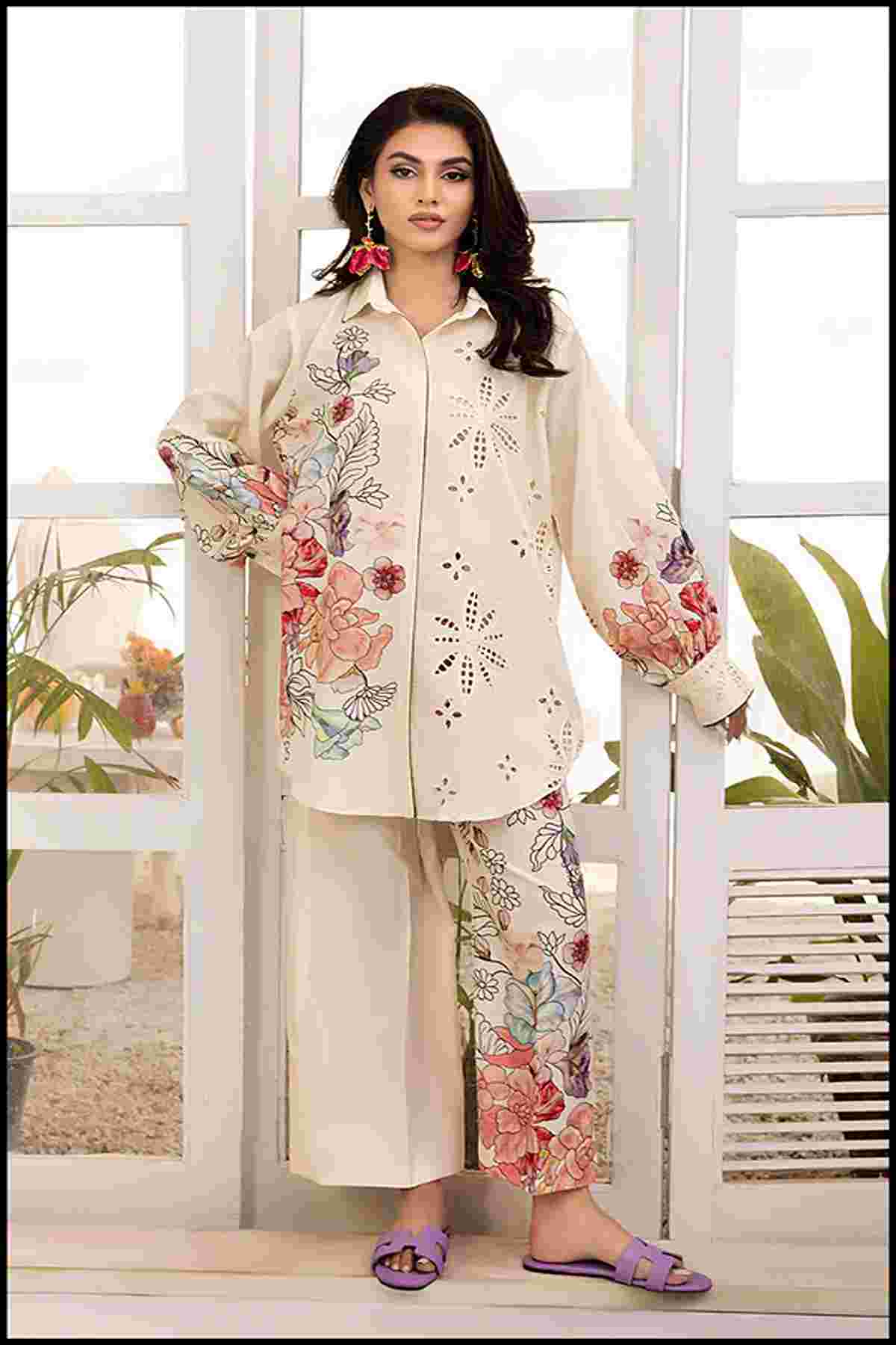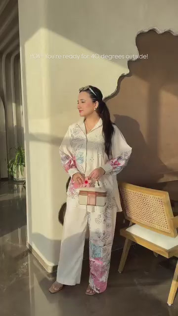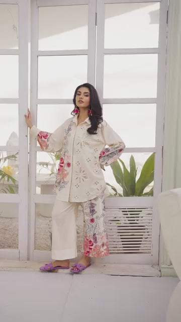 Soft, graceful, and effortlessly chic — Cream Fleur is a breath of fresh air for your summer wardrobe. Set on a creamy canvas, this co-ord set features delicate floral motifs in pastel hues of blush, lilac, and blue, paired with intricate eyelet embroidery for a touch of artisanal charm. The shirt’s relaxed silhouette and matching printed trousers create a look that’s both contemporary and timeless. Whether you’re sipping chai in the garden or heading to a daytime get-together, Cream Fleur brings elegance with ease.