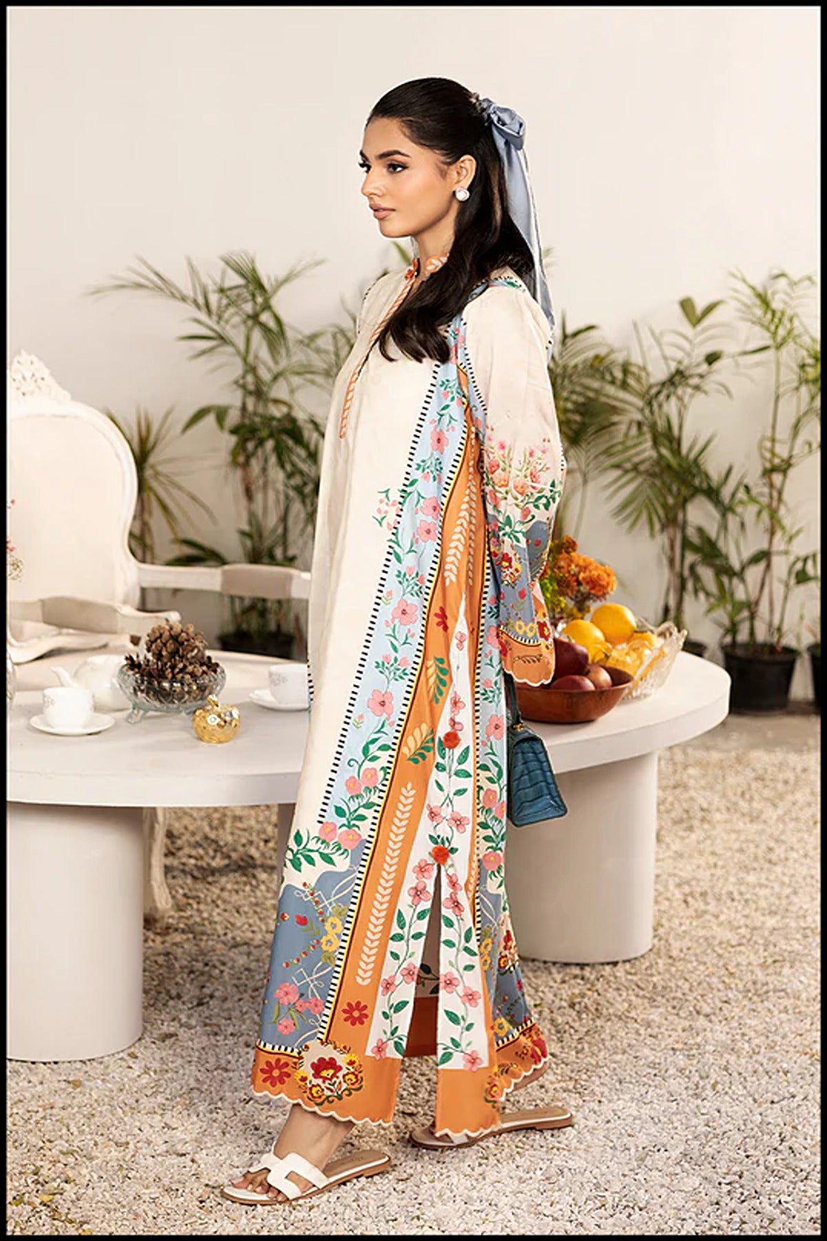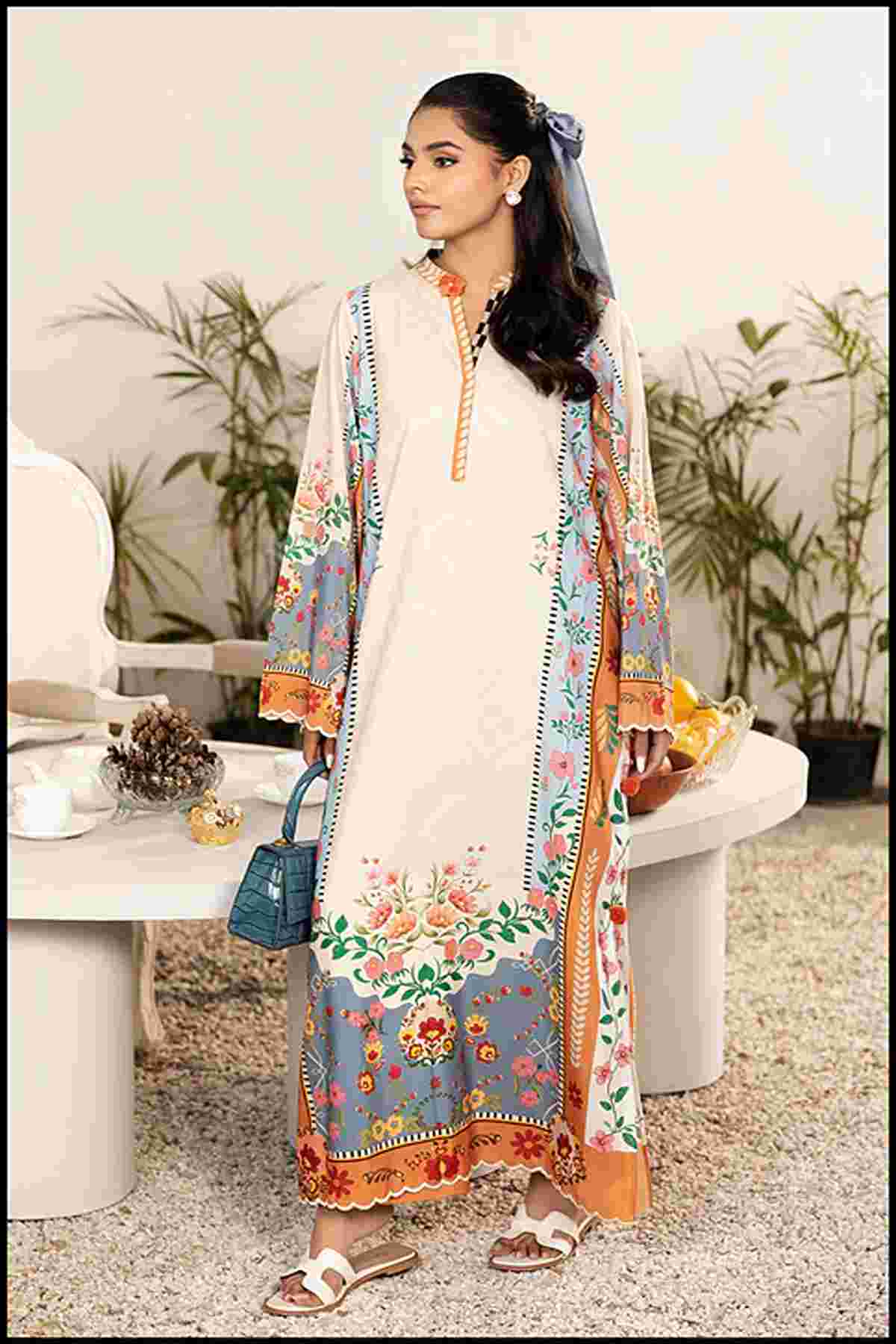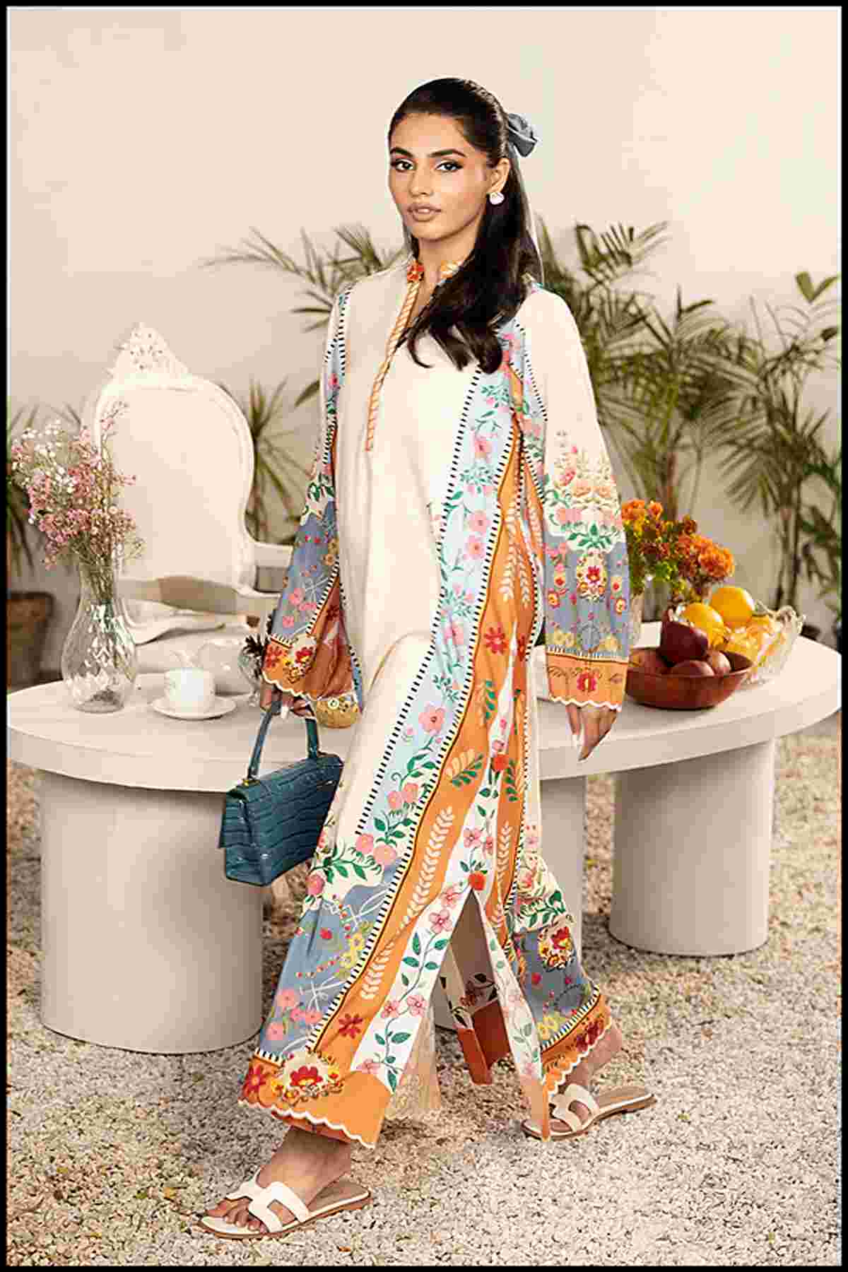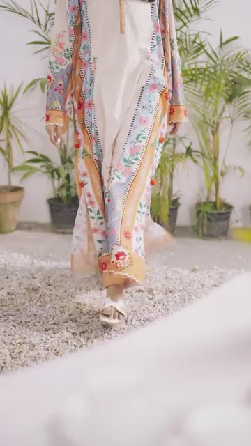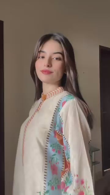 Drift through the day in Seaside slumber— an ethereal lawn silk co‑ord set that feels as light as a summer breeze. A creamy ivory base is gently kissed by watercolor florals and whisper‑soft scallops in dusty peach and cloud‑blue, evoking the soothing calm of seaside waves and pale summer skies. The relaxed tunic, with its airy side slits and delicate button placket, floats effortlessly over wide‑leg trousers finished with picot edging. Perfect for breezy garden gatherings, rooftop evenings, or any sun‑drenched moment when you need to stay cool and composed.