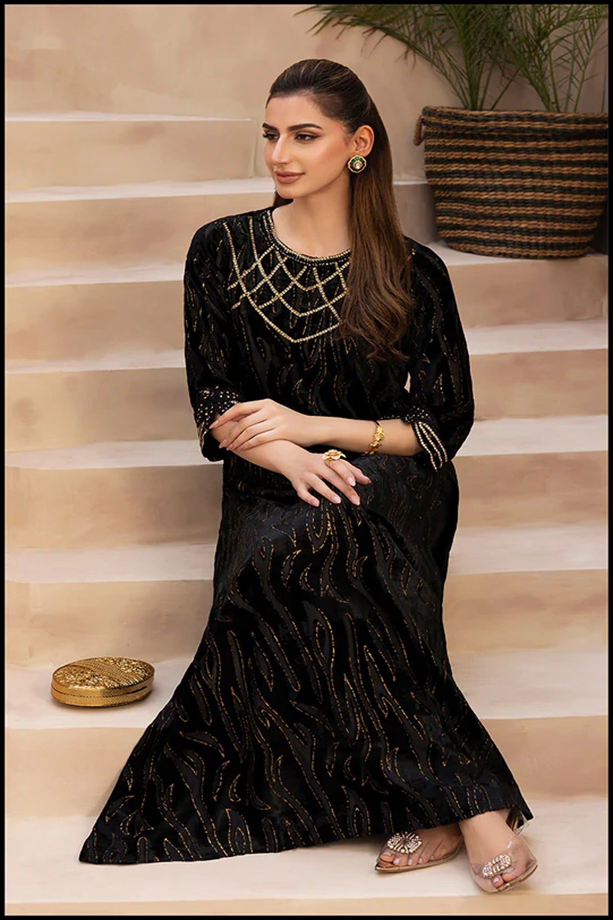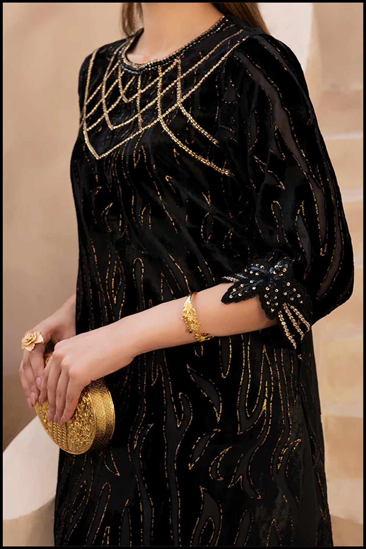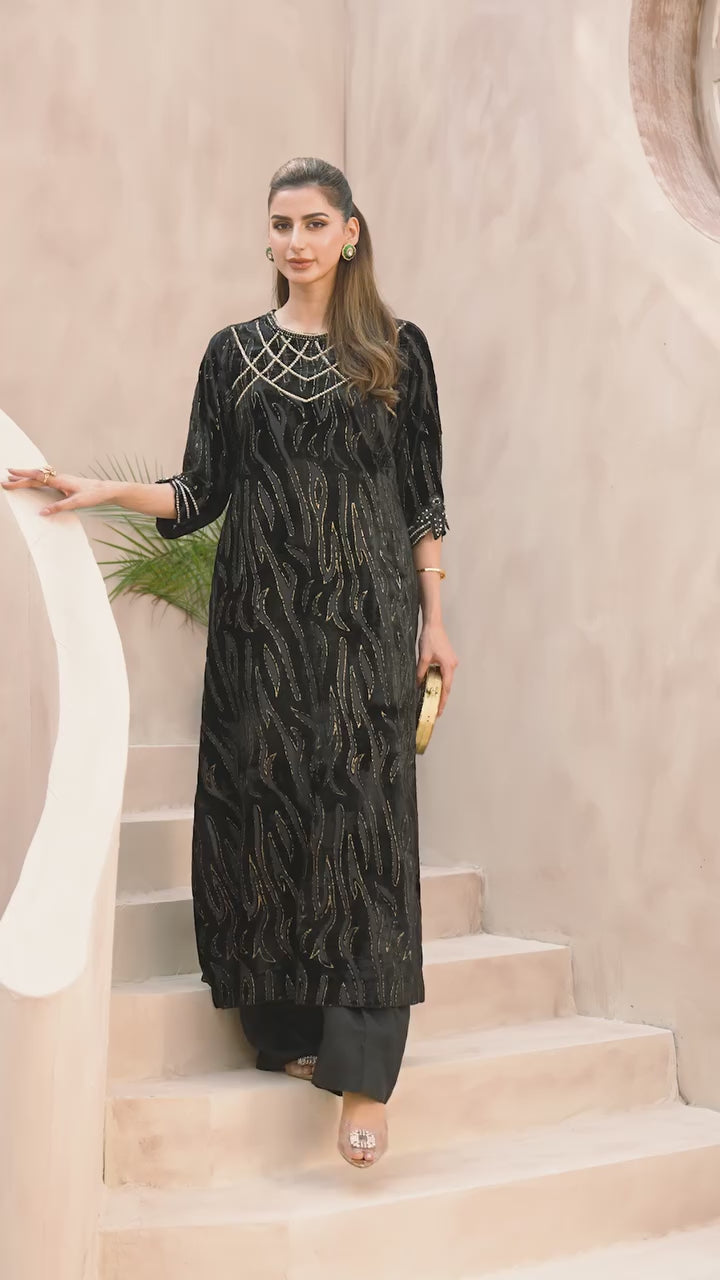 An embodiment of timeless glamour, Swarovski Spell is a festive velvet ensemble that dazzles with every detail. The rich black velvet serves as a luxurious canvas for intricate hand-embellished Swarovski work, creating a mesmerizing interplay of shimmer and depth. The delicately adorned neckline and sleeves exude sophistication, while the sleek silhouette adds a touch of modern grace — making this ensemble a true celebration of elegance, radiance, and festive allure.