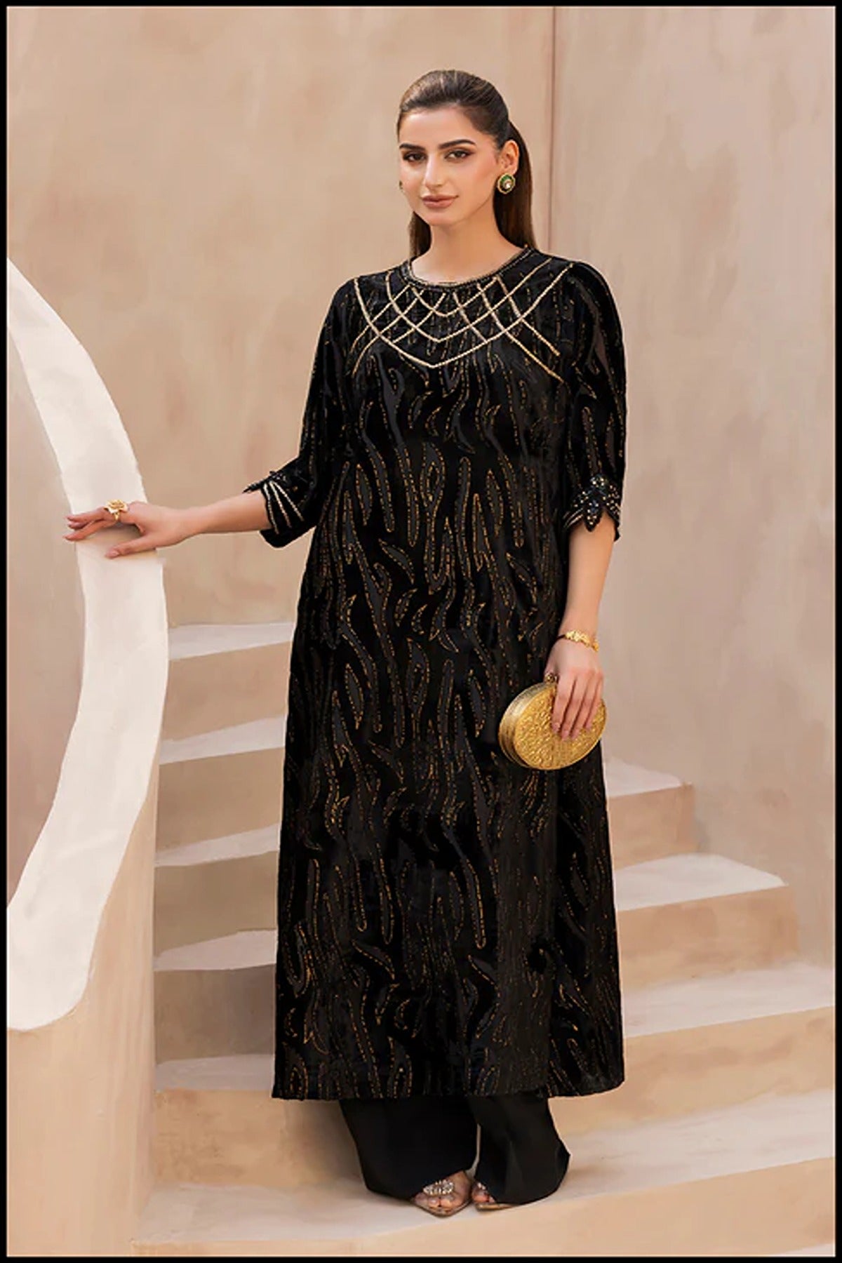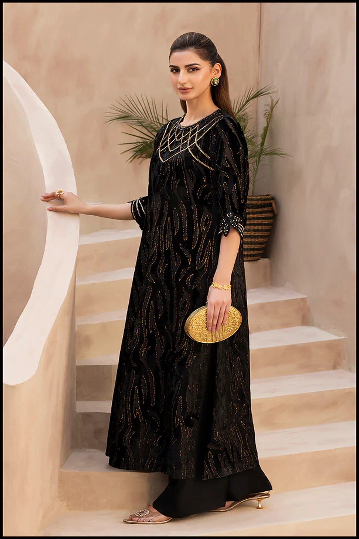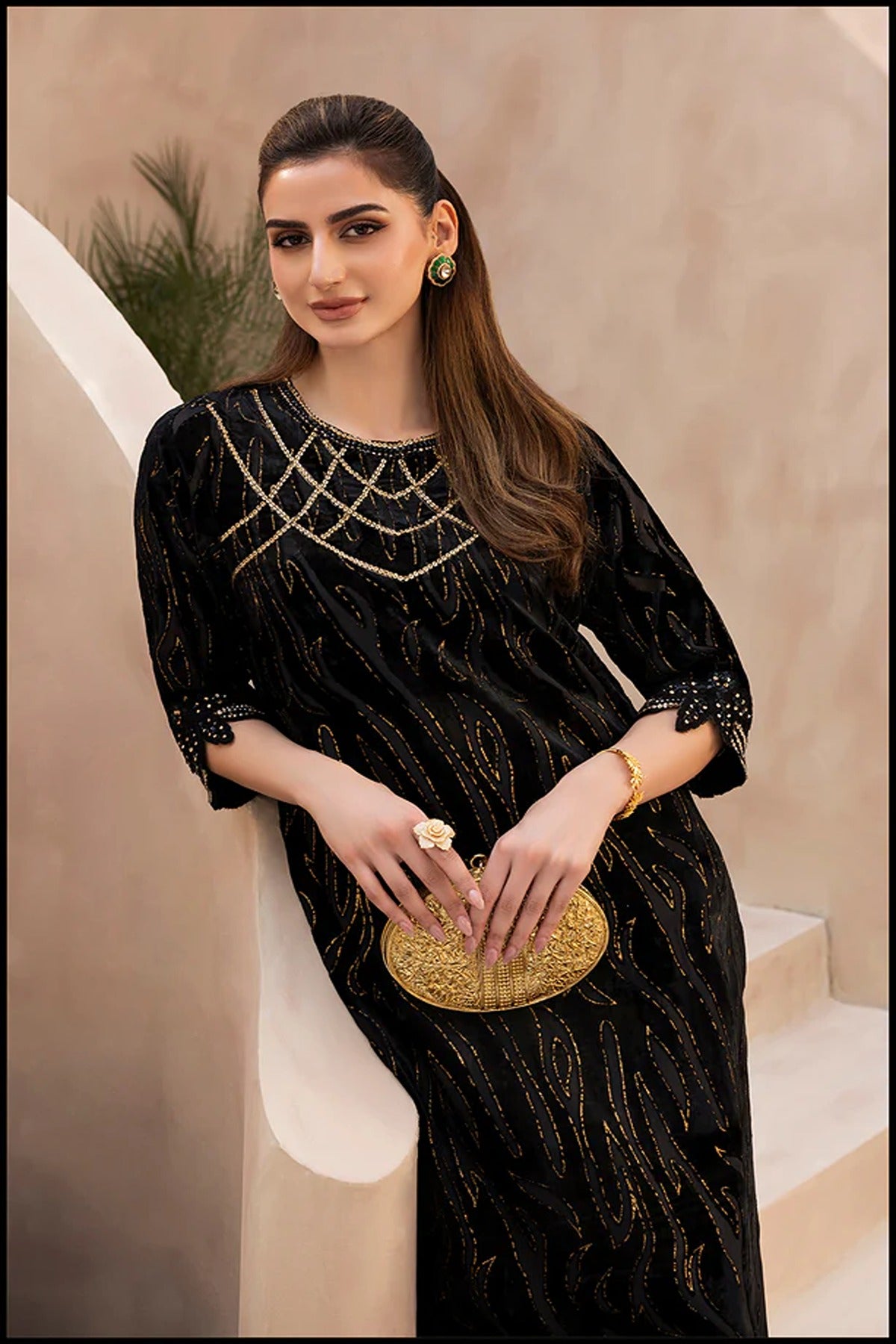 An embodiment of timeless glamour, Swarovski Spell is a festive velvet ensemble that dazzles with every detail. The rich black velvet serves as a luxurious canvas for intricate hand-embellished Swarovski work, creating a mesmerizing interplay of shimmer and depth. The delicately adorned neckline and sleeves exude sophistication, while the sleek silhouette adds a touch of modern grace — making this ensemble a true celebration of elegance, radiance, and festive allure.