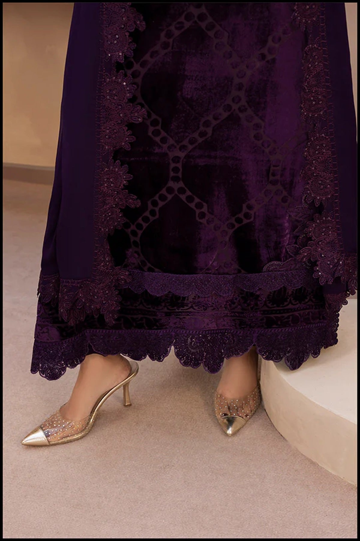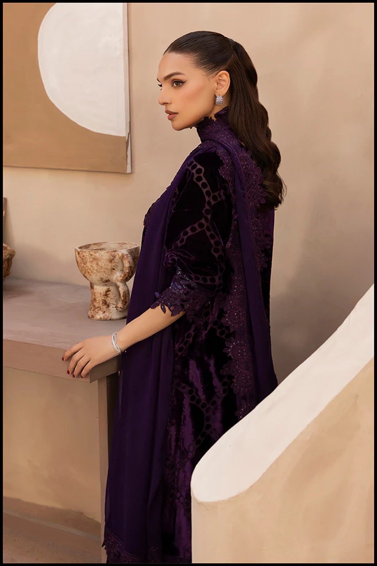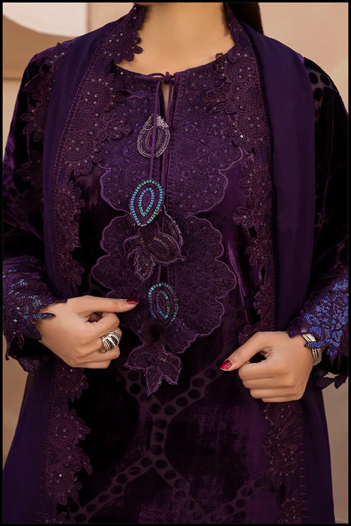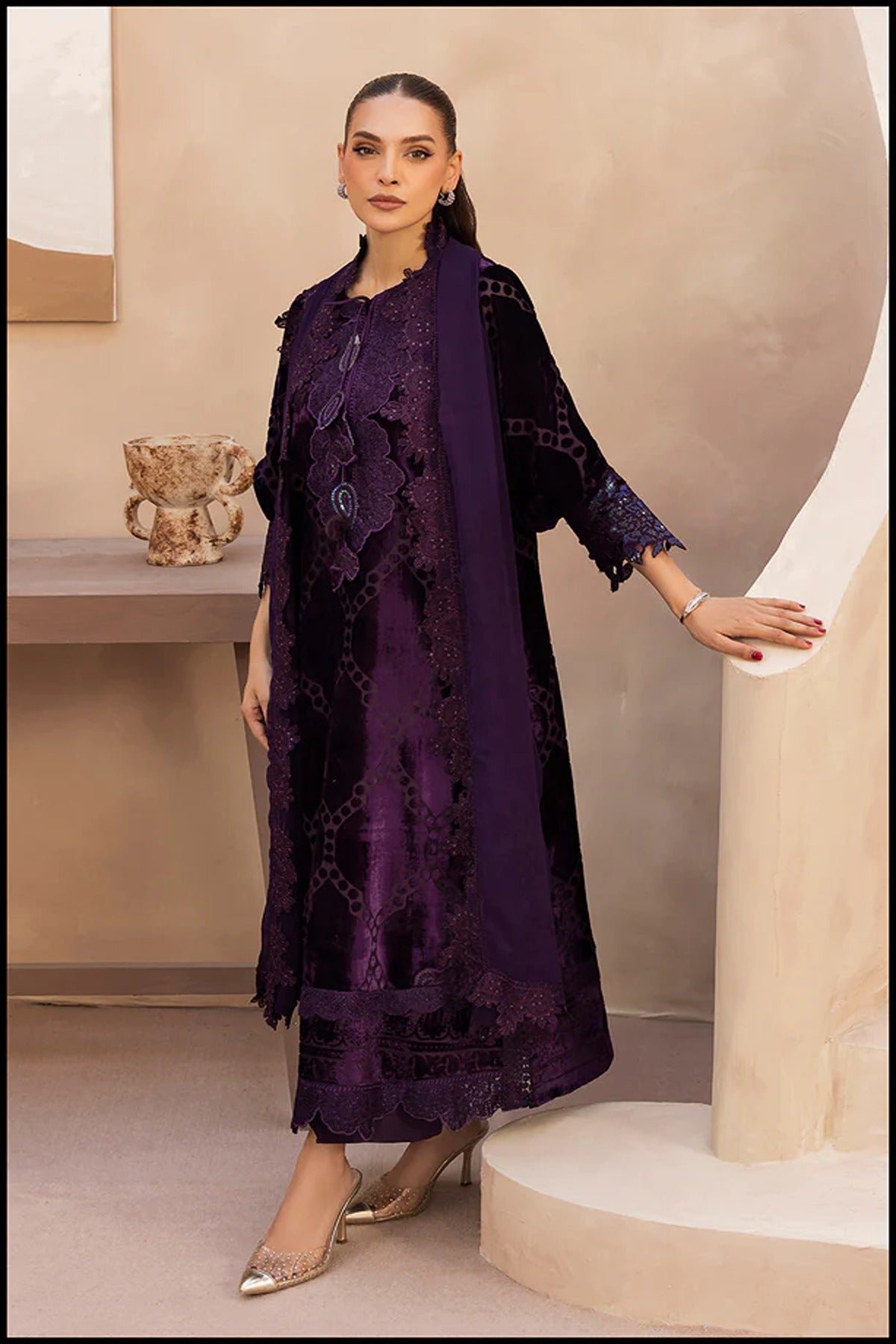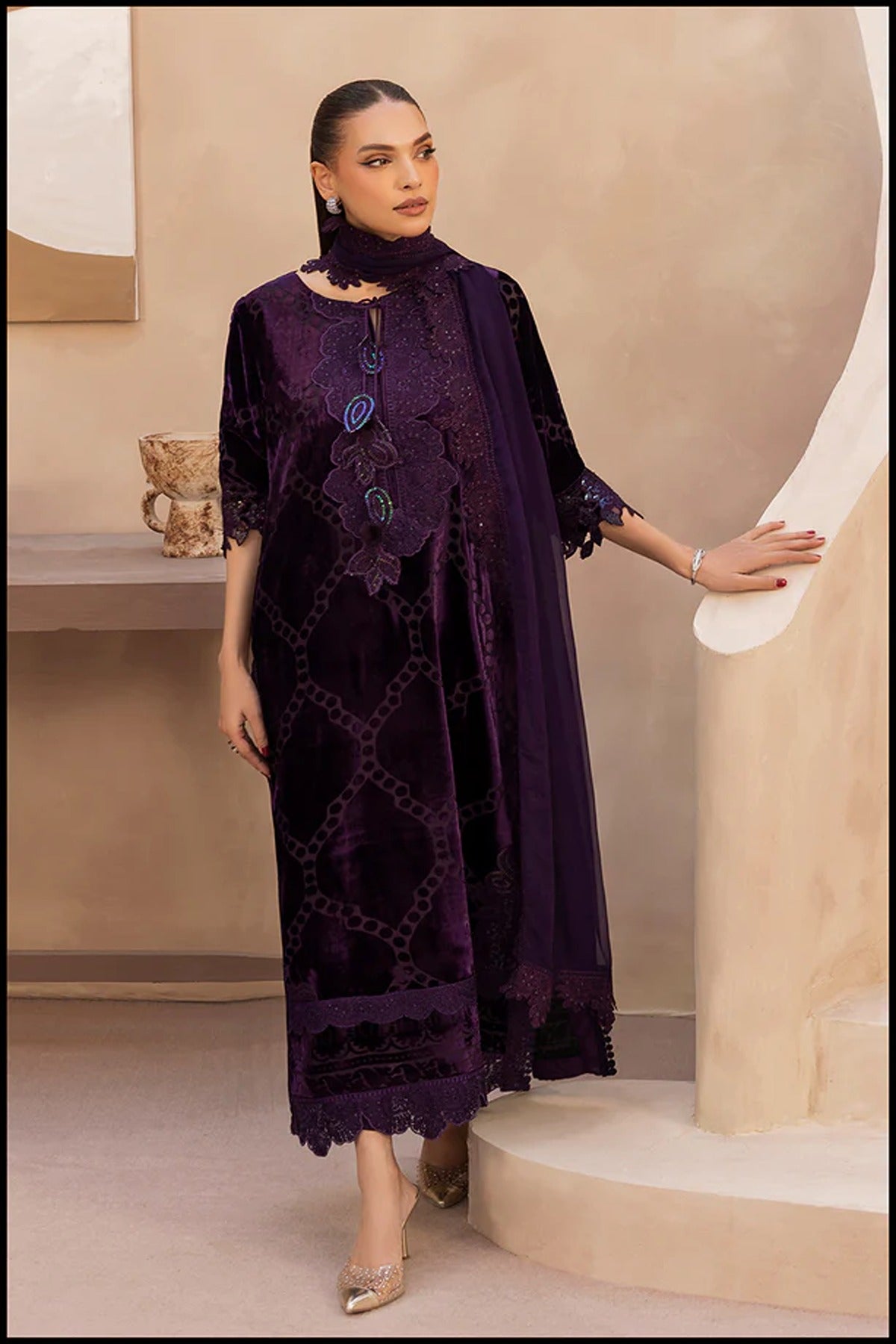 A celebration of elegance and finesse, Twilight Charm is a 3-piece velvet ensemble that embodies regal sophistication. The deep plum hue is elevated by an exquisitely embroidered neckline, adorned with intricate handwork and shimmering accents that add a refined sparkle. The delicate lace detailing and graceful dupatta complete the look, creating a harmonious blend of luxury and allure — perfect for evening occasions where timeless