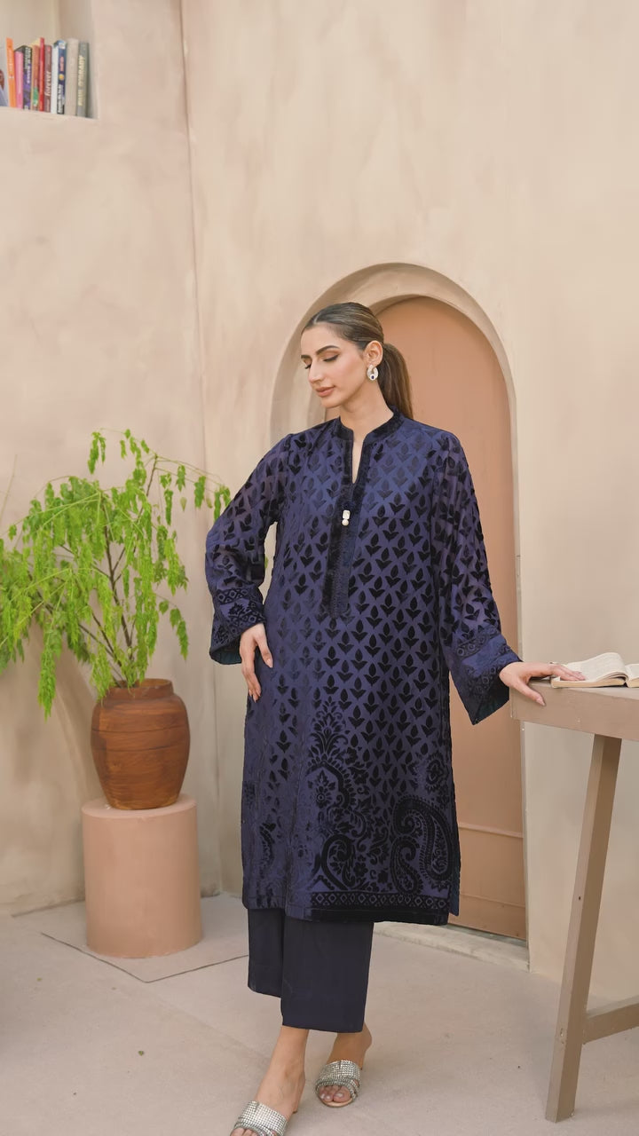 Step into effortless sophistication with Eclipse — a deep navy velvet co-ord set that radiates poise and refinement. The intricate embossed motifs add texture and depth to its plush surface, while the relaxed silhouette ensures timeless comfort and grace. Perfect for winter evenings and intimate gatherings, this ensemble embodies understated luxury at its finest.