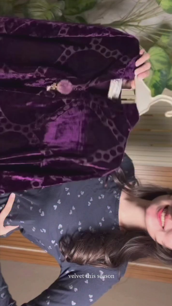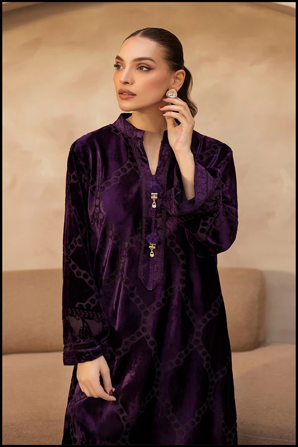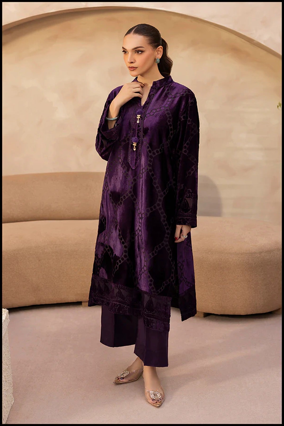Drape yourself in timeless elegance with our Violet Dusk, an effortlessly chic velvet co-ord set that embodies understated luxury. Crafted in a deep jewel-toned purple, this ensemble exudes sophistication with its plush texture, subtle self-pattern, and delicately detailed neckline. The relaxed kurta silhouette paired with tailored trousers offers the perfect balance of comfort and grace, making it ideal for winter soirées, intimate dinners, or festive gatherings.