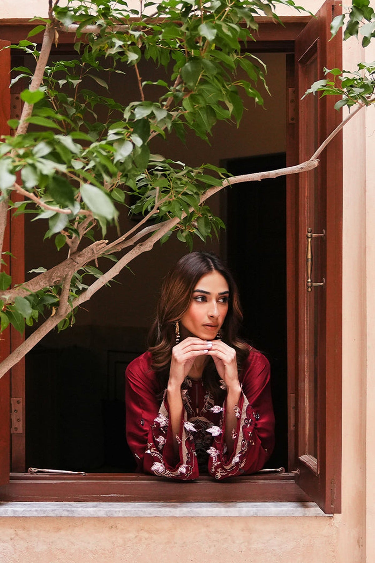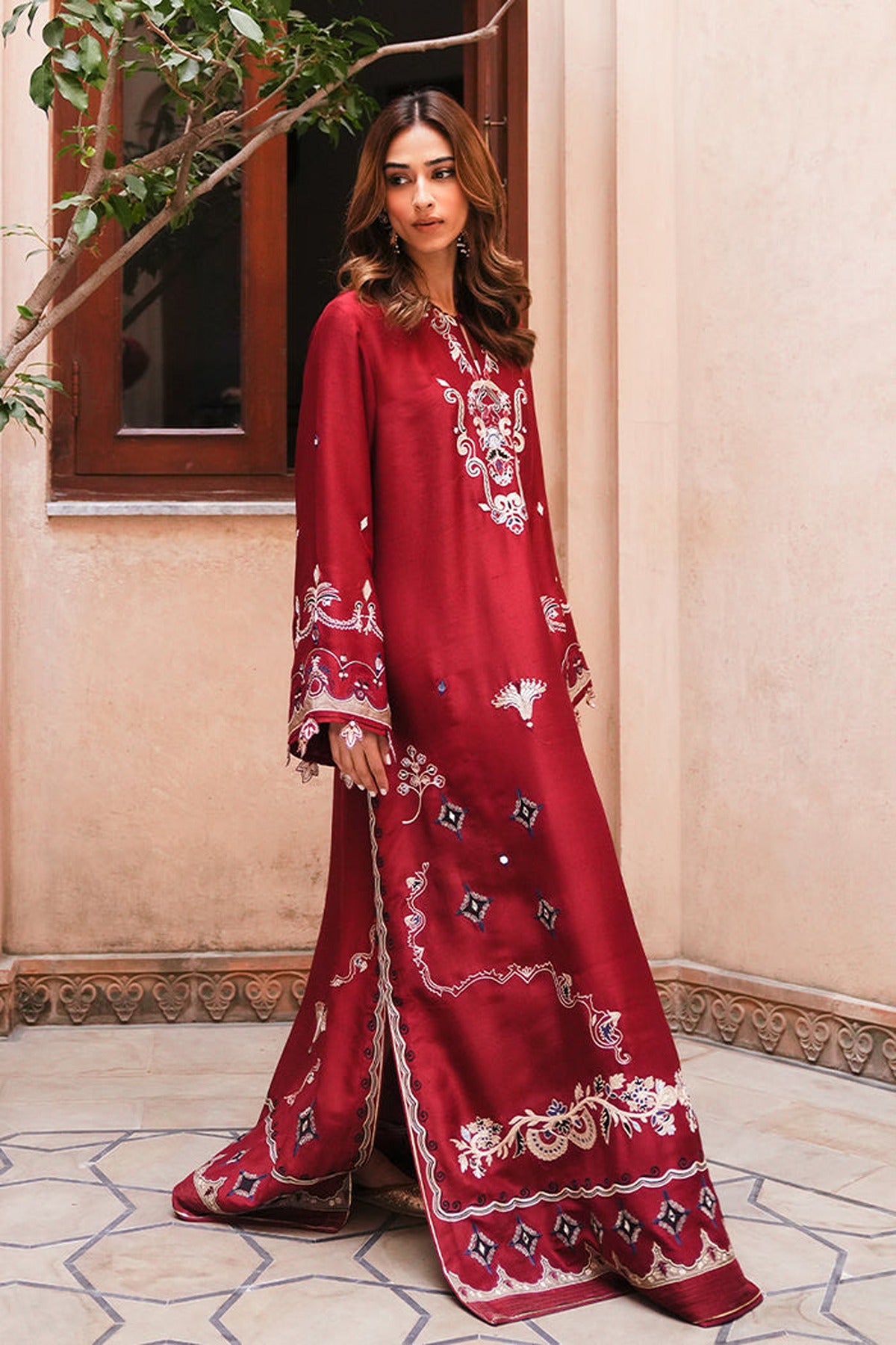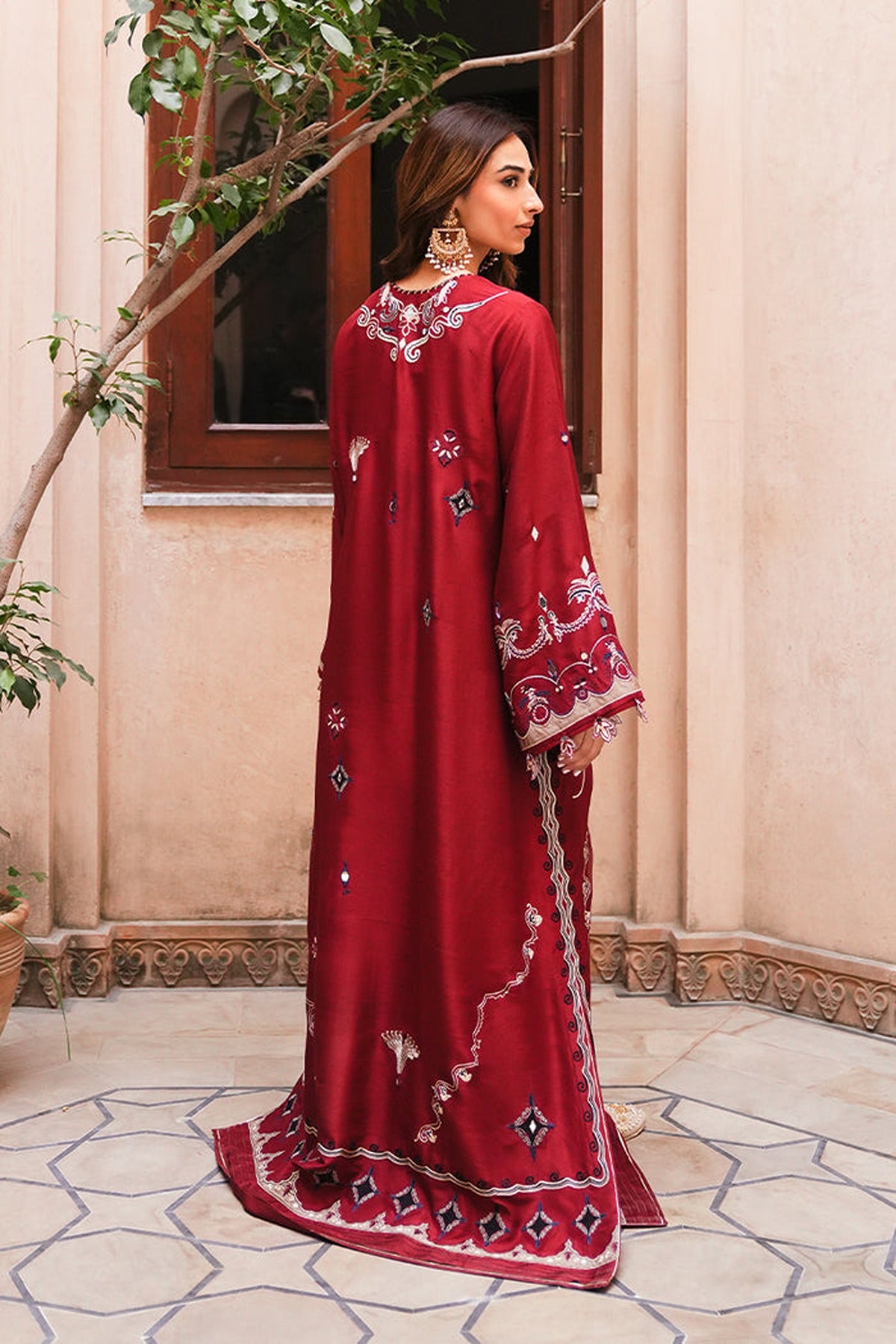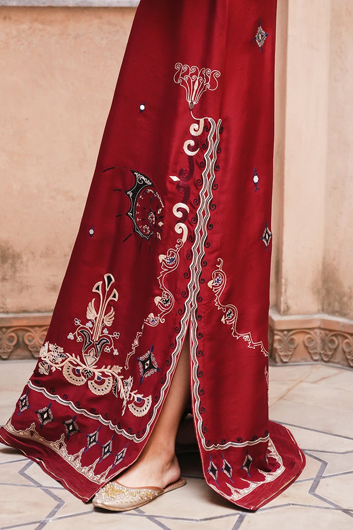 The Rukhsar kaftan is a graceful blend of traditional artistry and modern elegance, crafted from raw silk with intricate machine embroidery in resham, applique work, and ari embroidery. Sleeve hangings add a striking detail, while pleats and pintucks enhance the silhouette. The design is beautifully finished with delicate gotta, bringing a refined touch to the ensemble.