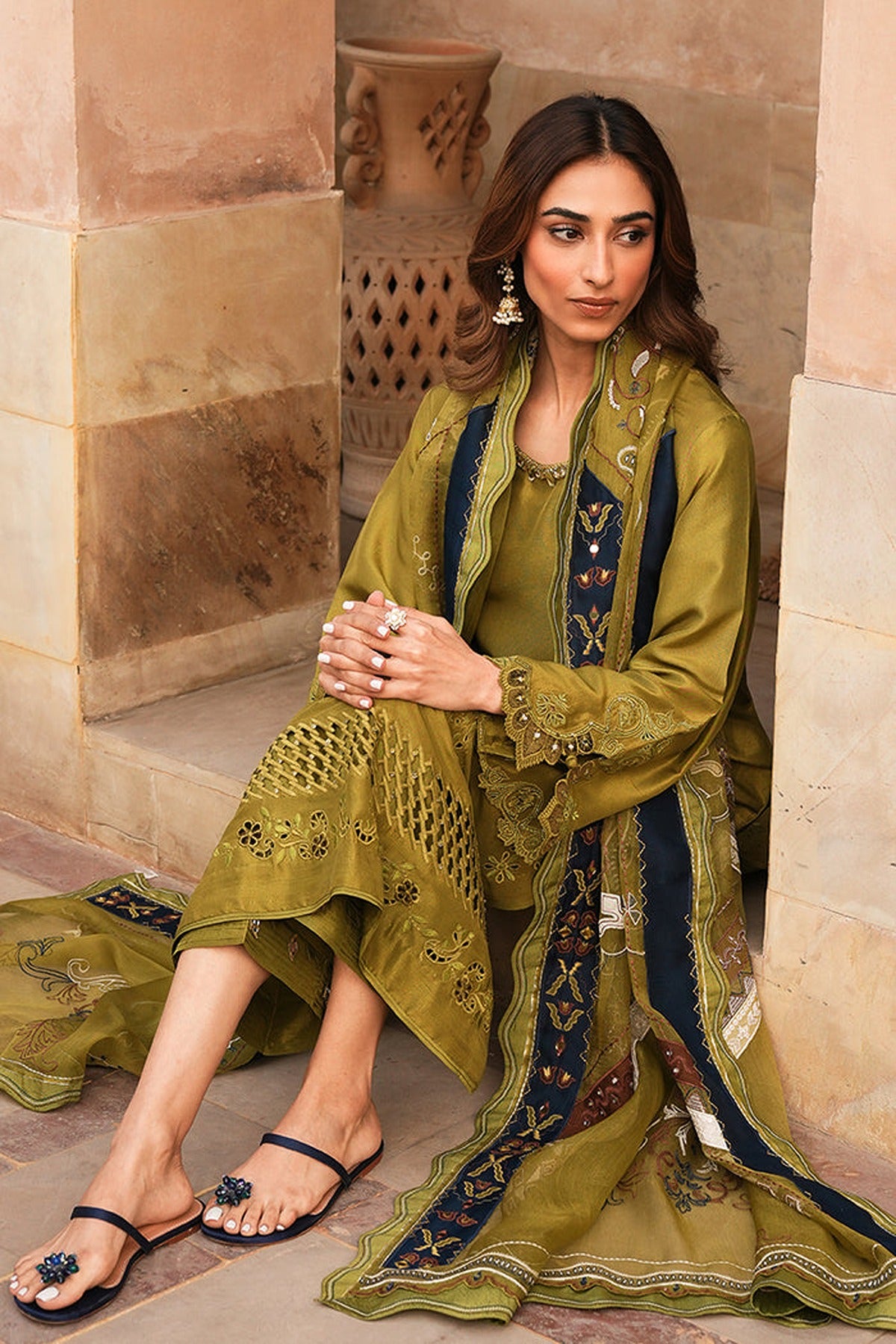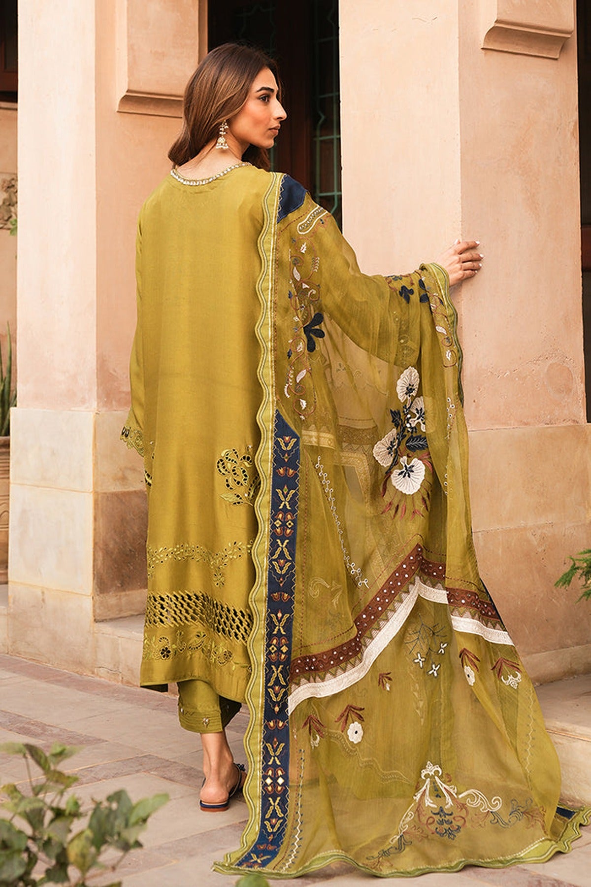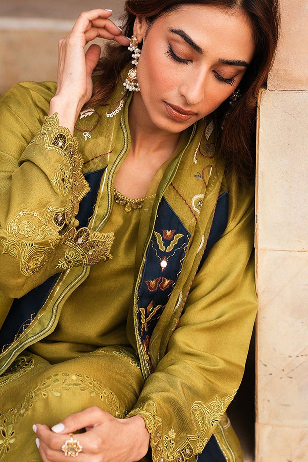 A timeless fusion of intricate details, the Rayya outfit showcases a raw silk shirt with machine embroidery in resham, applique work, and mirror embellishments. Cutwork on the daman and scalloped sleeves with slits add a delicate charm, while handwork on the neckline enhances its elegance. The raw silk izaar features pleats, pintucks, and mirror hangings for a structured yet graceful look. Completing the ensemble, the organza dupatta is adorned with resham embroidery, applique, and mirror work, finished with gotta, scallops, and finely stitched details.