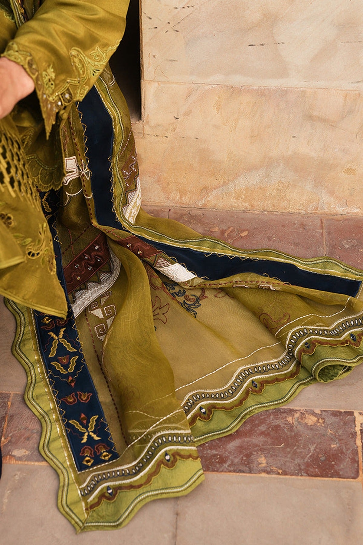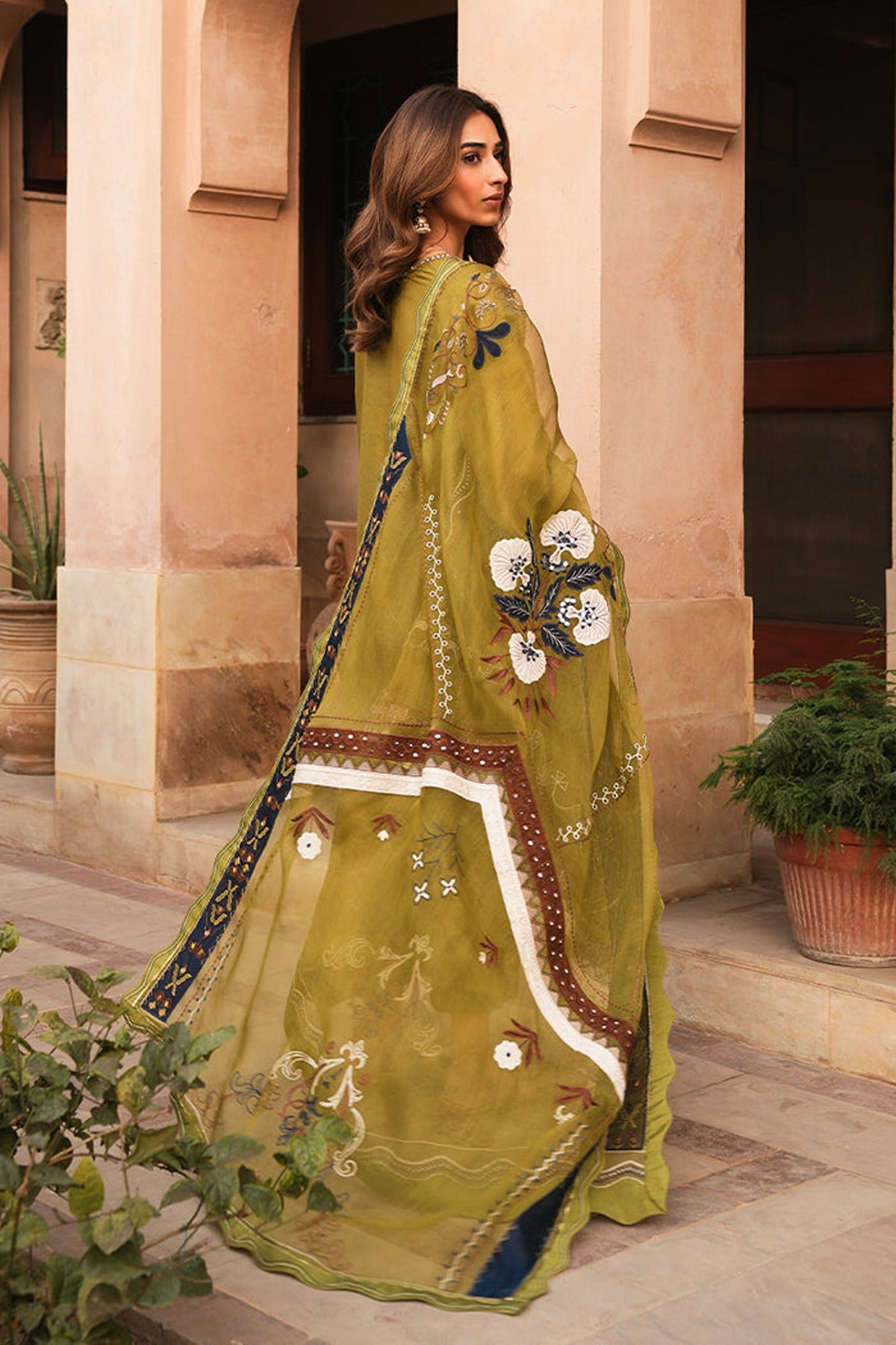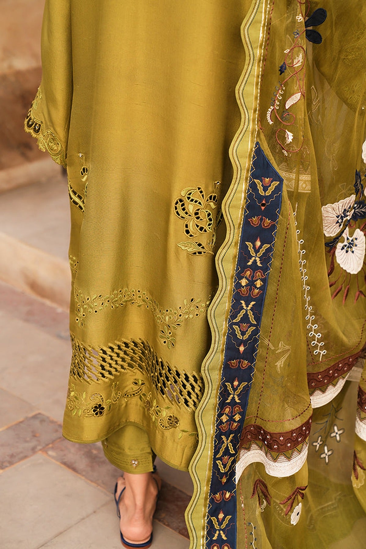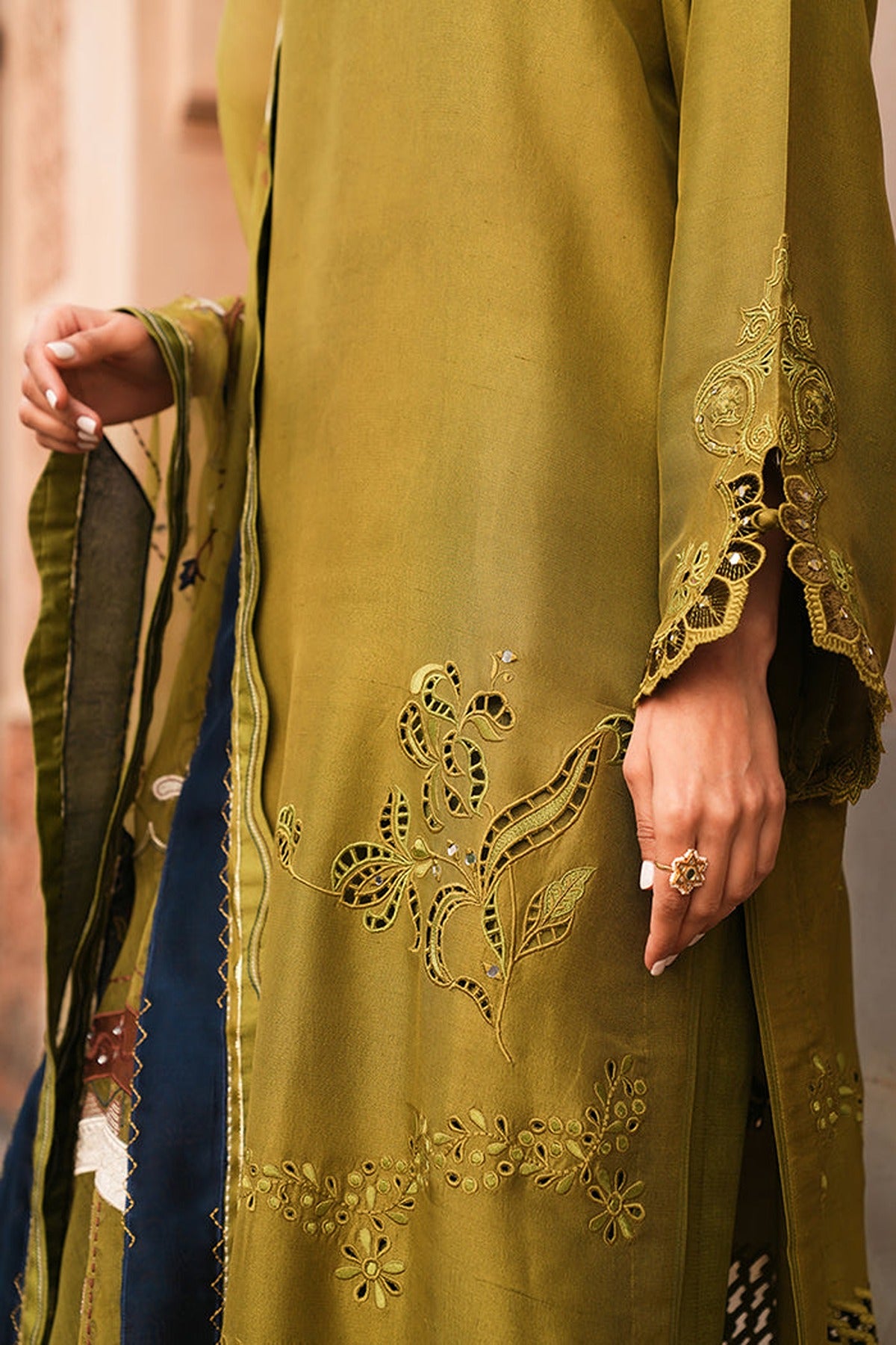 A timeless fusion of intricate details, the Rayya outfit showcases a raw silk shirt with machine embroidery in resham, applique work, and mirror embellishments. Cutwork on the daman and scalloped sleeves with slits add a delicate charm, while handwork on the neckline enhances its elegance. The raw silk izaar features pleats, pintucks, and mirror hangings for a structured yet graceful look. Completing the ensemble, the organza dupatta is adorned with resham embroidery, applique, and mirror work, finished with gotta, scallops, and finely stitched details.