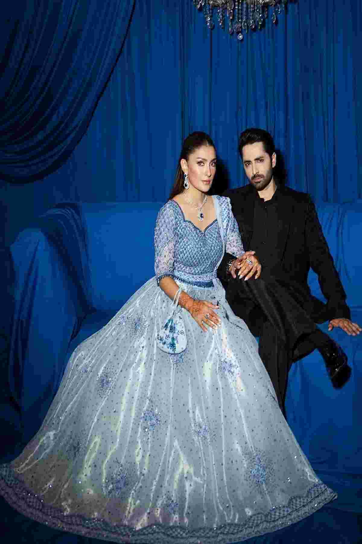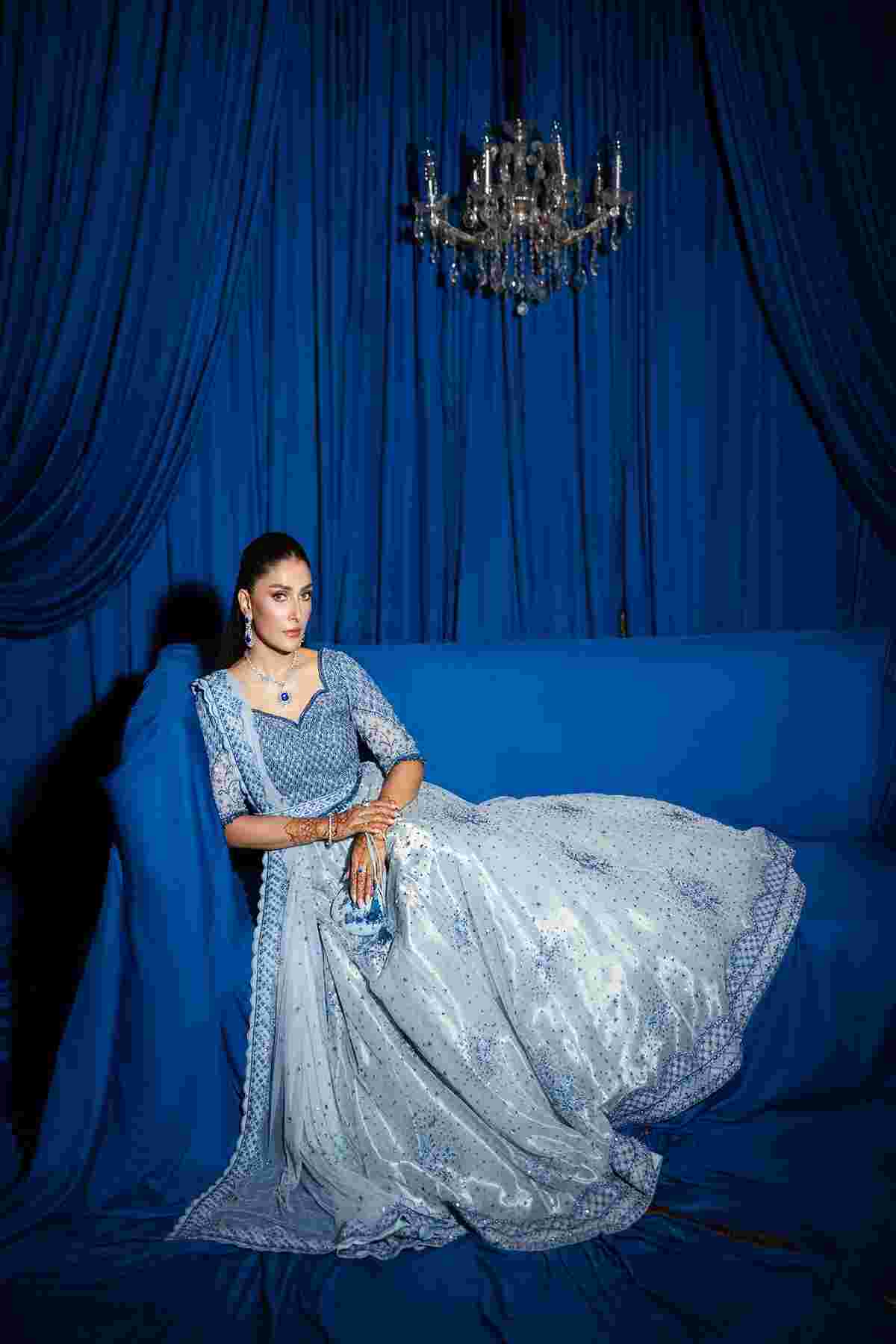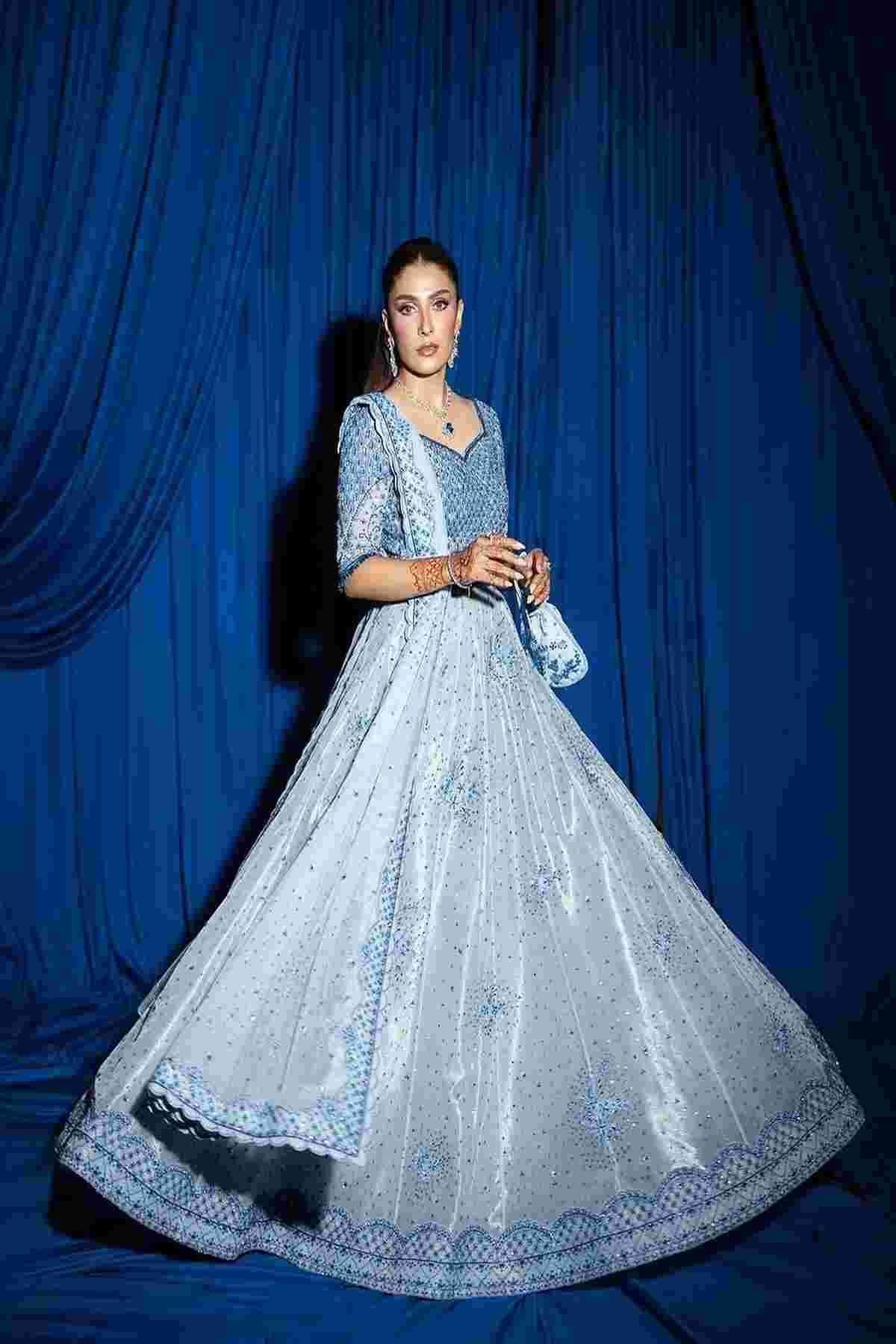 It is paired with a flowing blue French net lehenga, adorned with shimmering sequin work scattered throughout for a radiant effect. Completing the ensemble is a matching French net dupatta, lightly embellished with sequins to enhance the ethereal charm. A perfect blend of sophistication and allure, designed for timeless elegance.