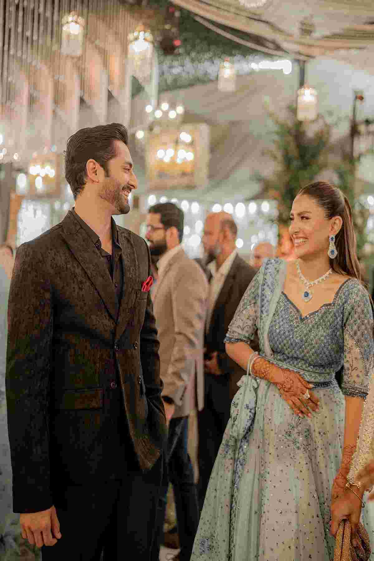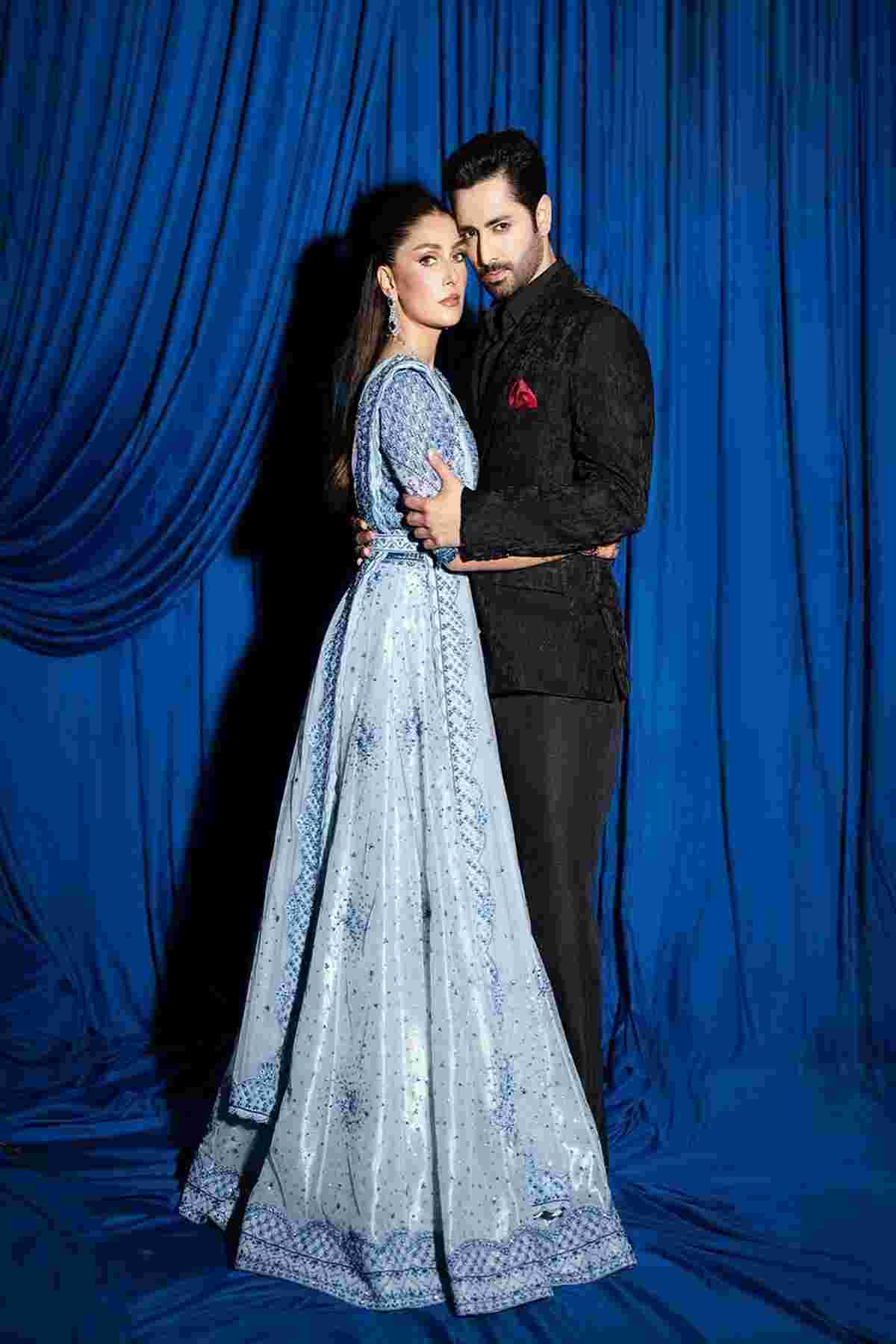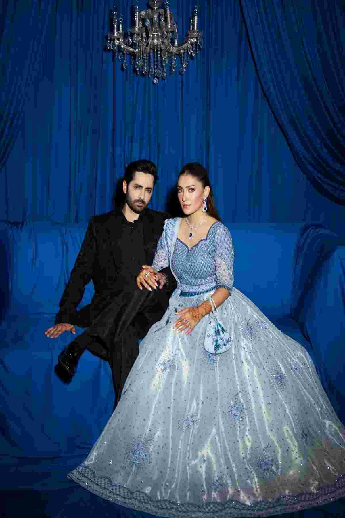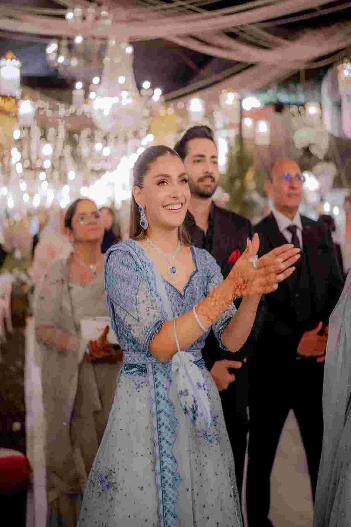 It is paired with a flowing blue French net lehenga, adorned with shimmering sequin work scattered throughout for a radiant effect. Completing the ensemble is a matching French net dupatta, lightly embellished with sequins to enhance the ethereal charm. A perfect blend of sophistication and allure, designed for timeless elegance.