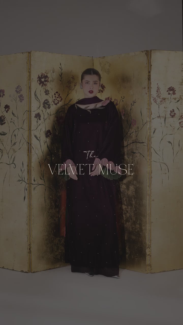- Embroidered and hand embellished velvet long shirt paired with tie and dye chiffon dupatta and raw silk trouser.