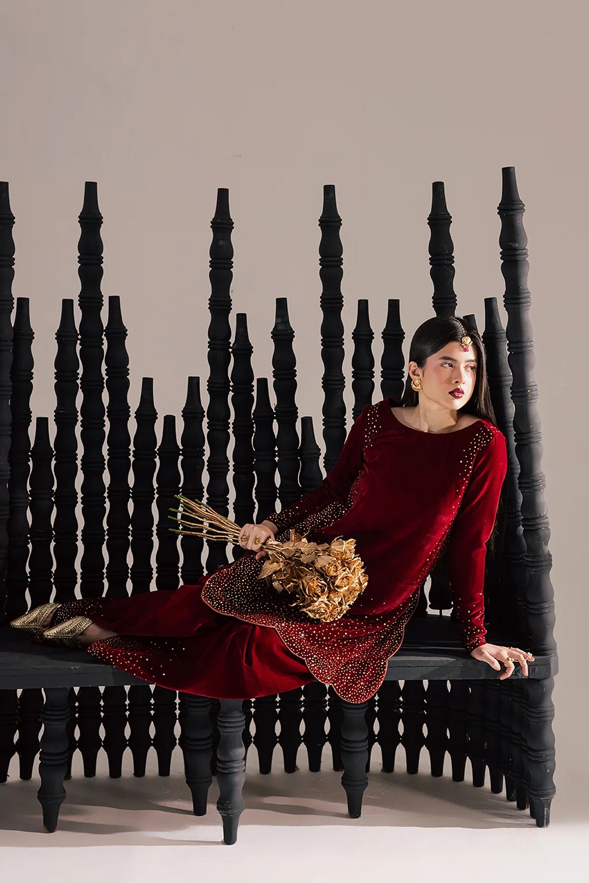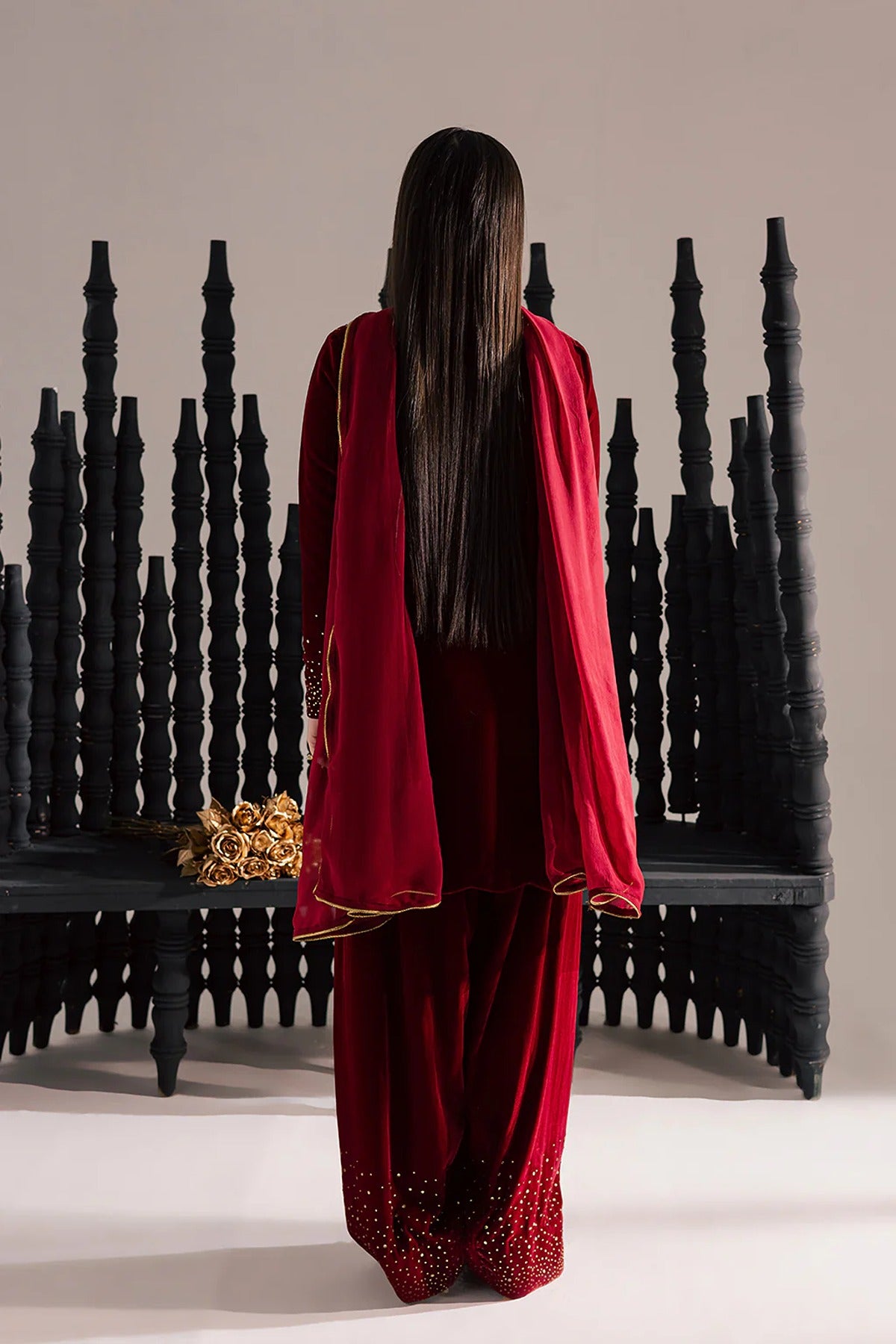 - A premium red hand embellished stonework velvet shirt paired with hand embellished stone work farshi shalwar and chiffon dupatta