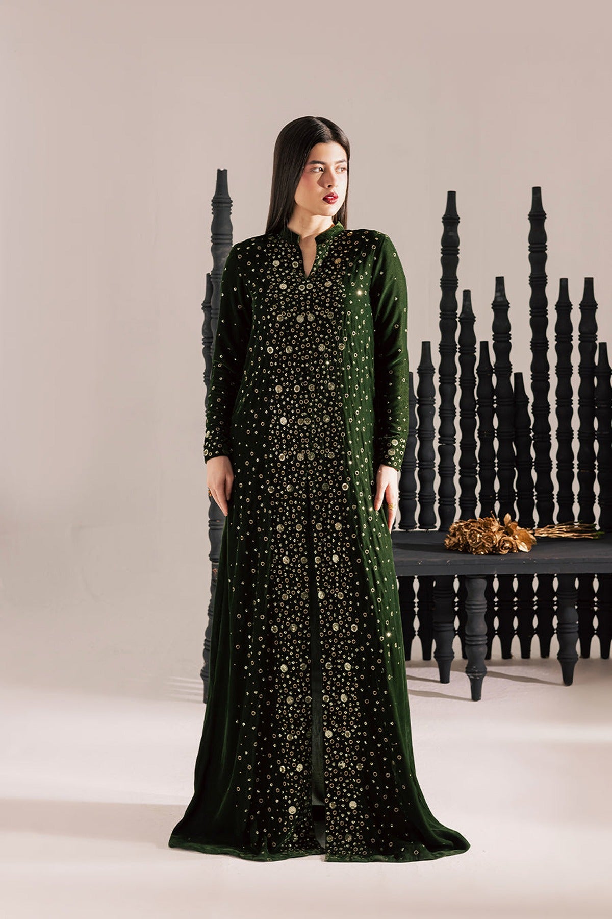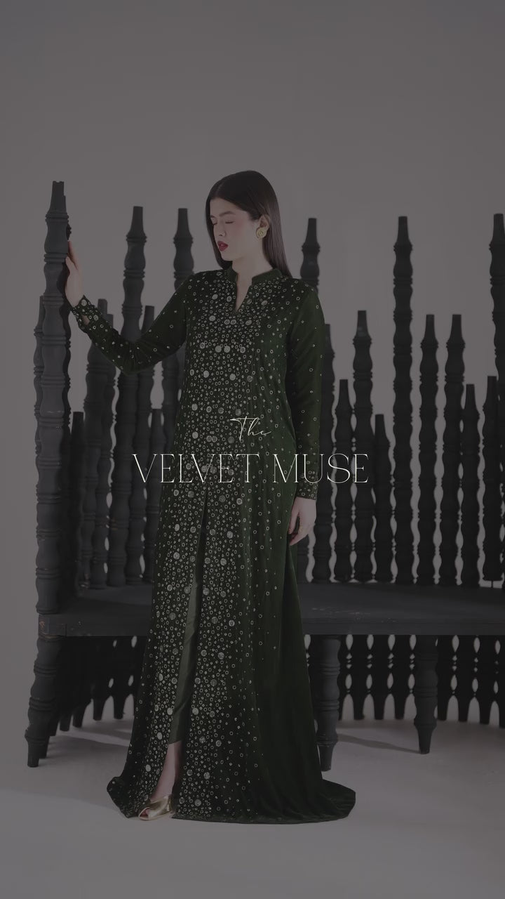 - A luxurious emerald green velvet long shirt, beautifully adorned with intricate embroidery, paired with sleek raw silk pants.