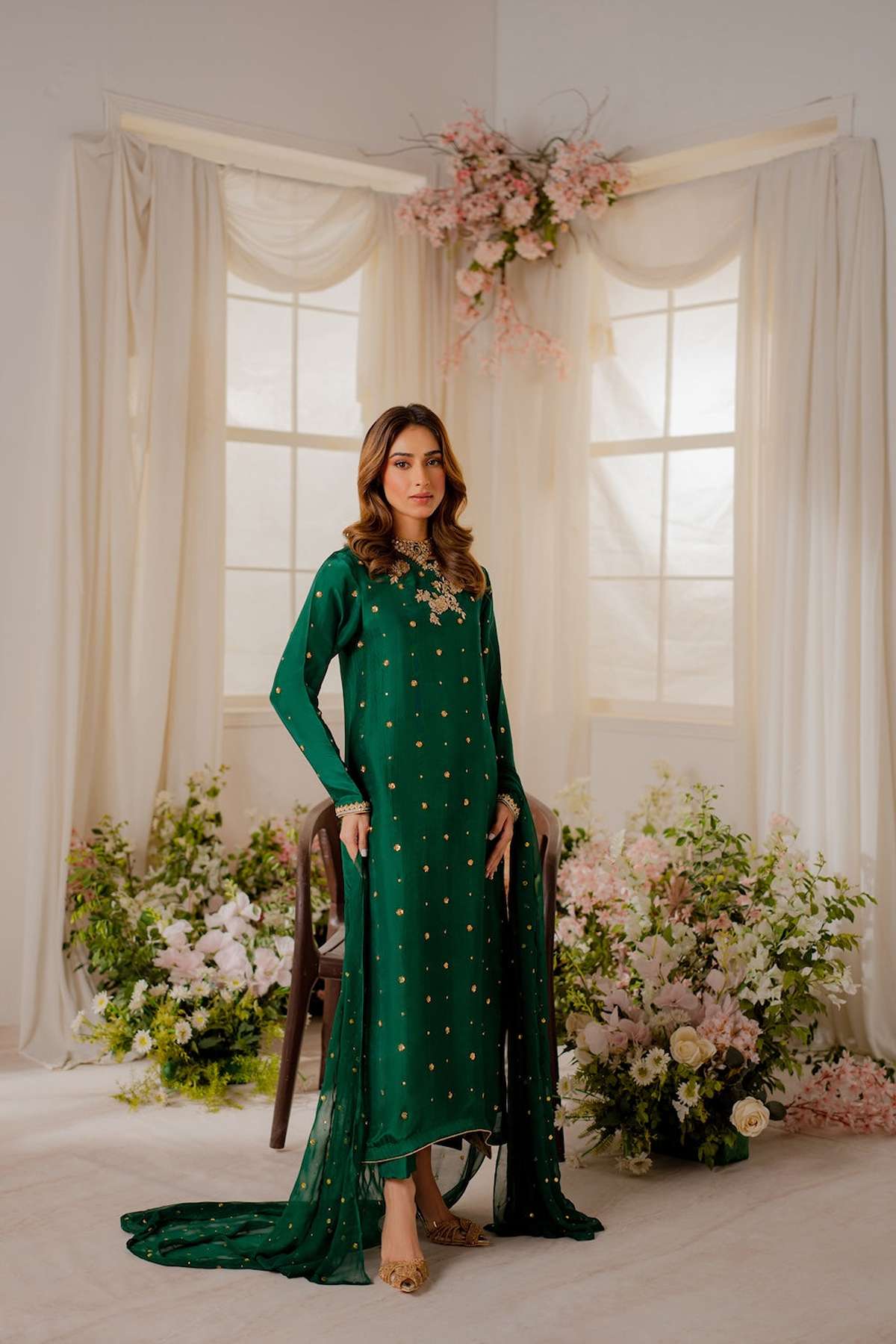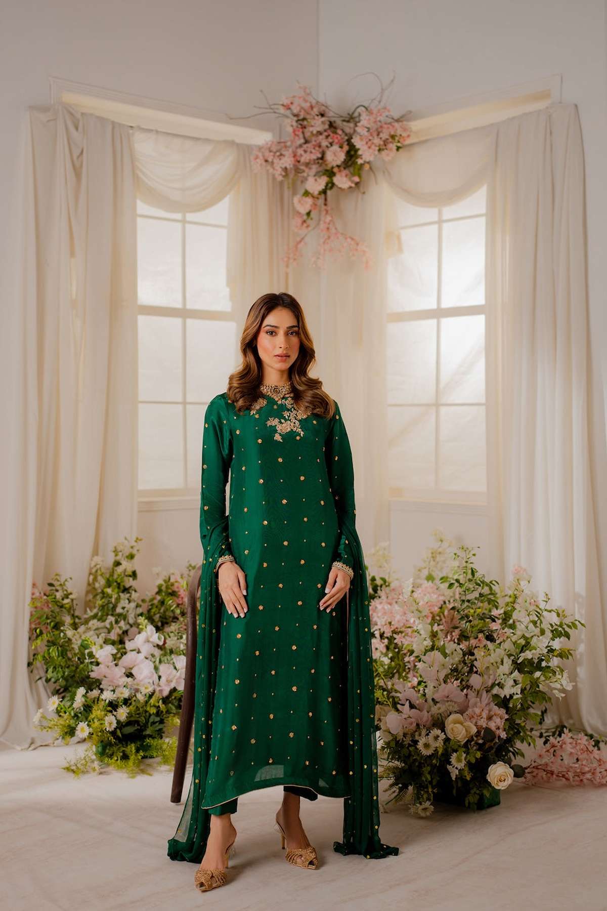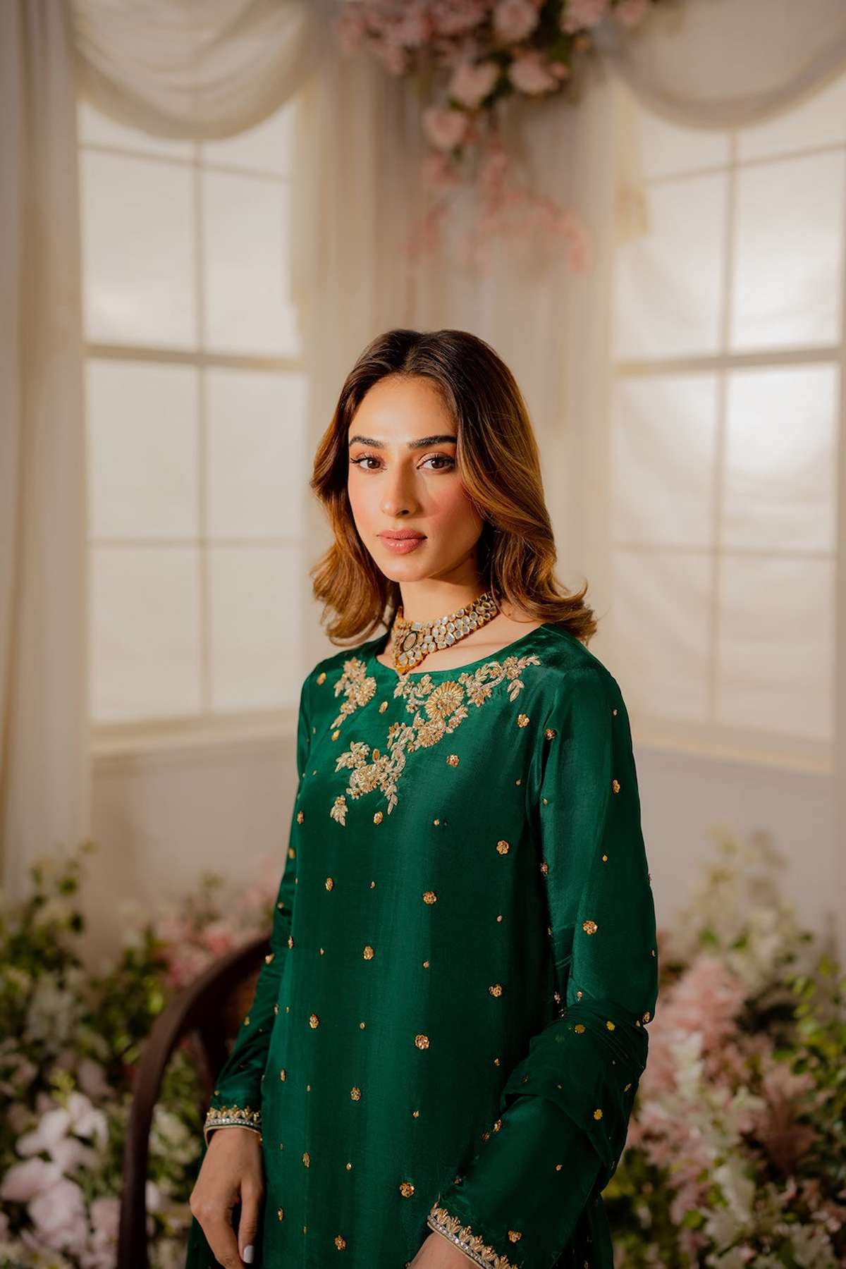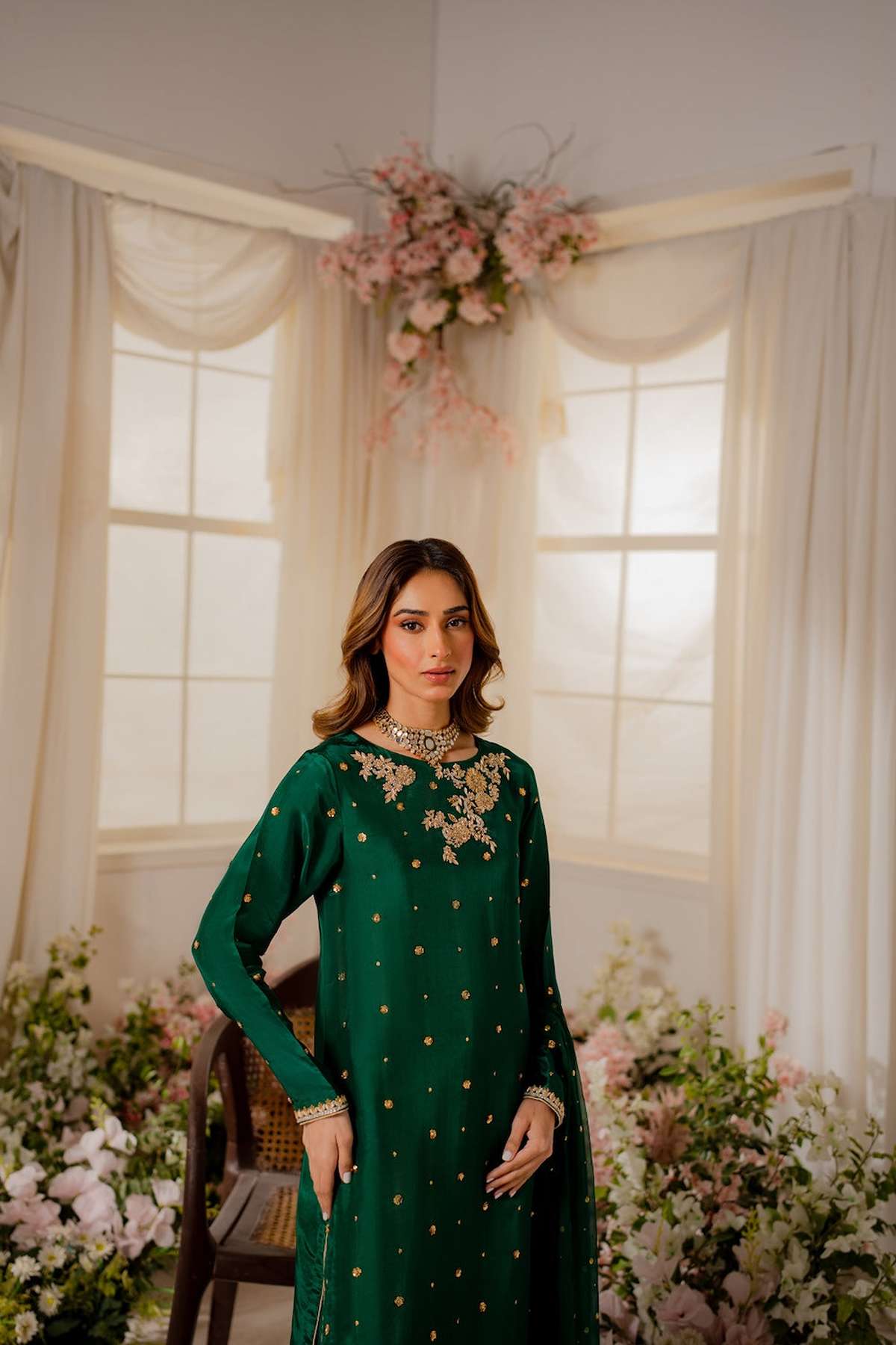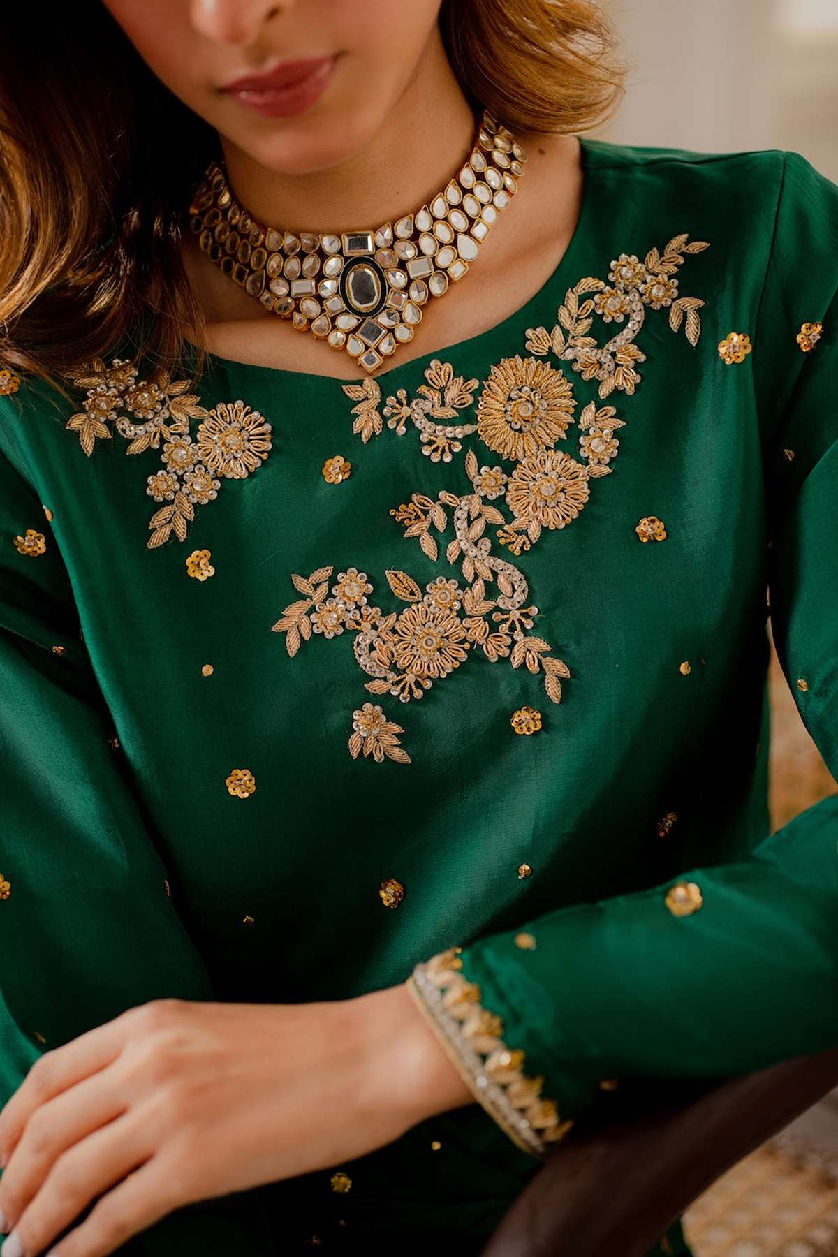 Perfect for special occasions and weddings, our statement emerald green shirt is crafted from pure silk with carefully placed hand ari all over the front with zardozi embellishments. The beautiful ensemble is adorned with delicately embellished motifs.