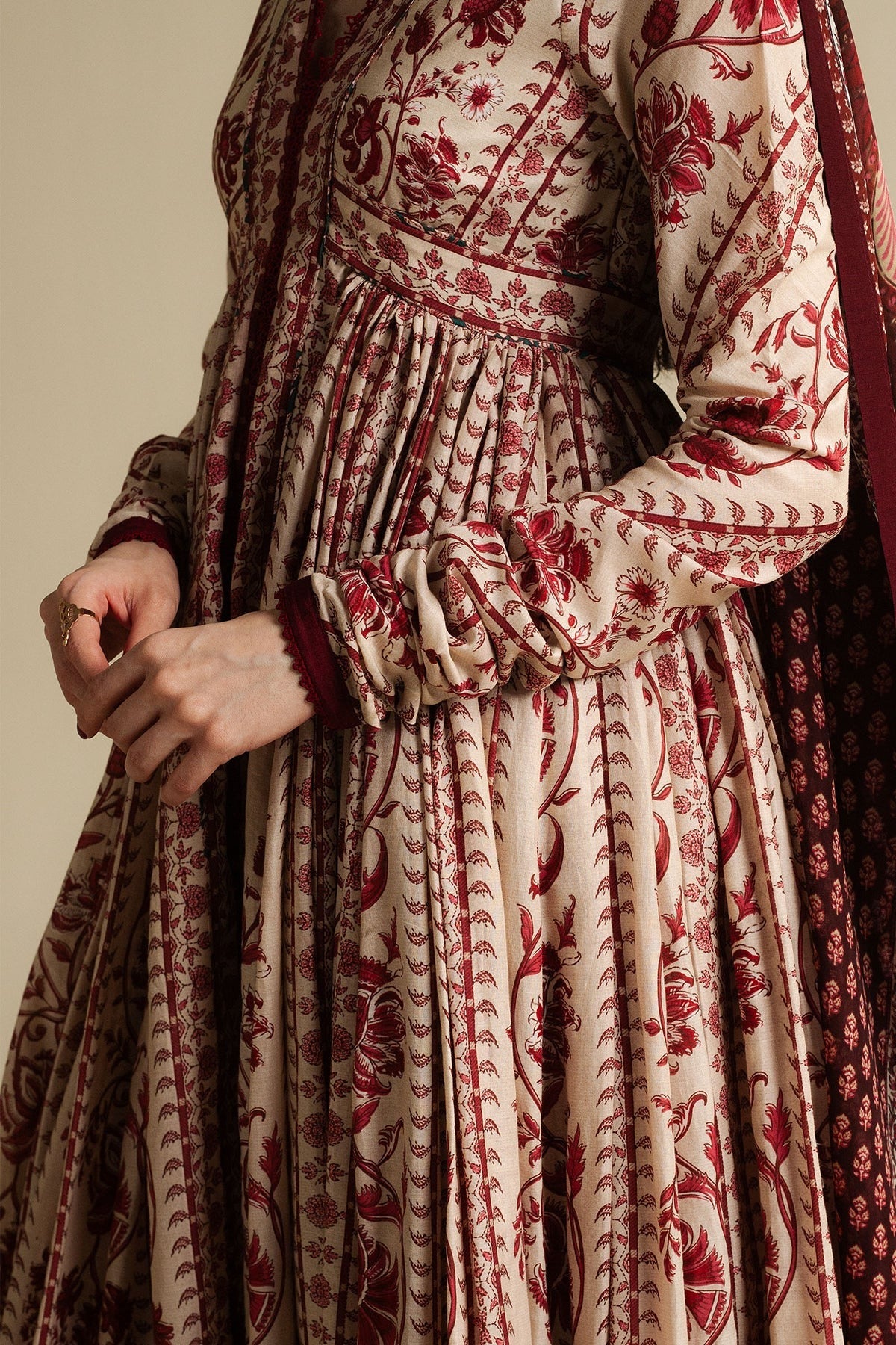 Inspired by age-old Kashmiri shawls, Kashmiri is a classic ivory Anarkali enriched with deep red print. This delicate Pima-Lawn ensemble features floral vines and linear patterns running vertically across the panels, paired with a silk maroon dupatta.