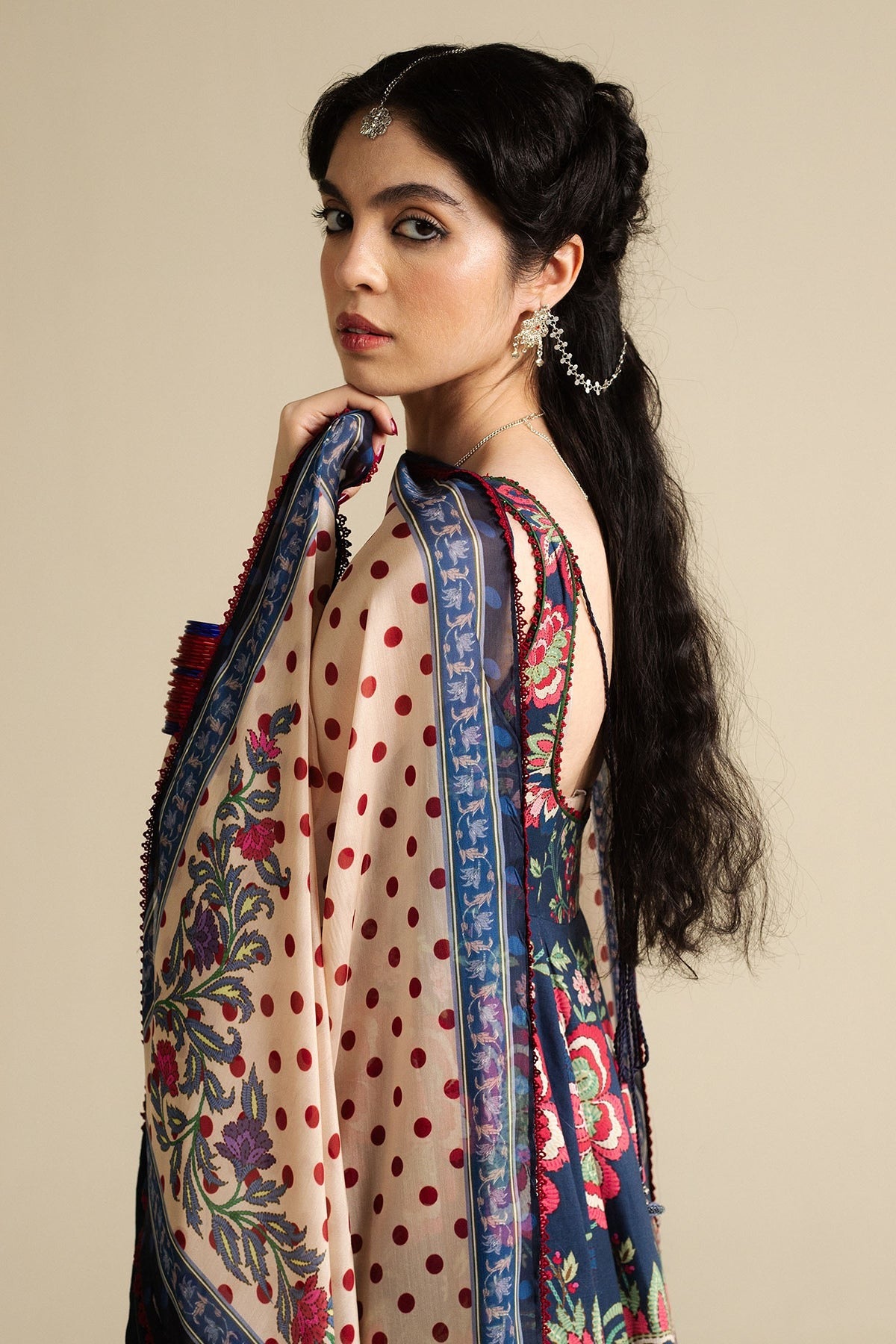 Neelofur is a striking midnight blue Pima-Lawn kalidaar adorned with bold Kashida-style floral arrangements in vibrant reds, greens, and fuchsia. Paired with an the ivory silk polka-dot dupatta.