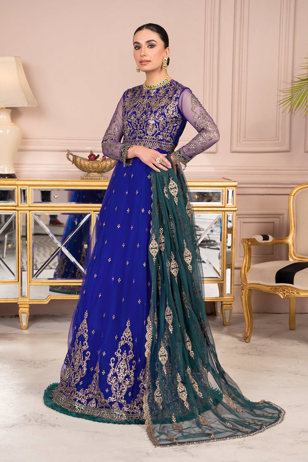 Crafted on a luscious canvas in blue base representing elegant work of art, this ensemble is a vision to praise. It comes paired with a beautifully designed dupatta in shade of green giving it an enhanced aura.