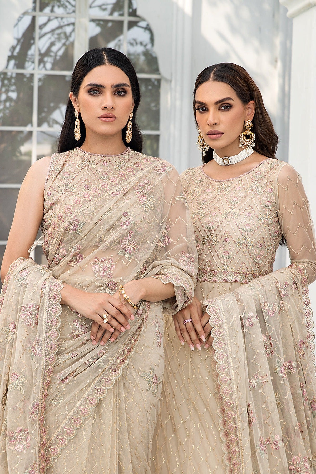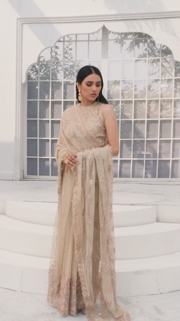 A heavenly skin beige canvas, is set off in blooming floral and patterned embroideries in a versatile color palette. This look is a must to have in the festive season wardrobe as with subtle hues style can never go wrong.