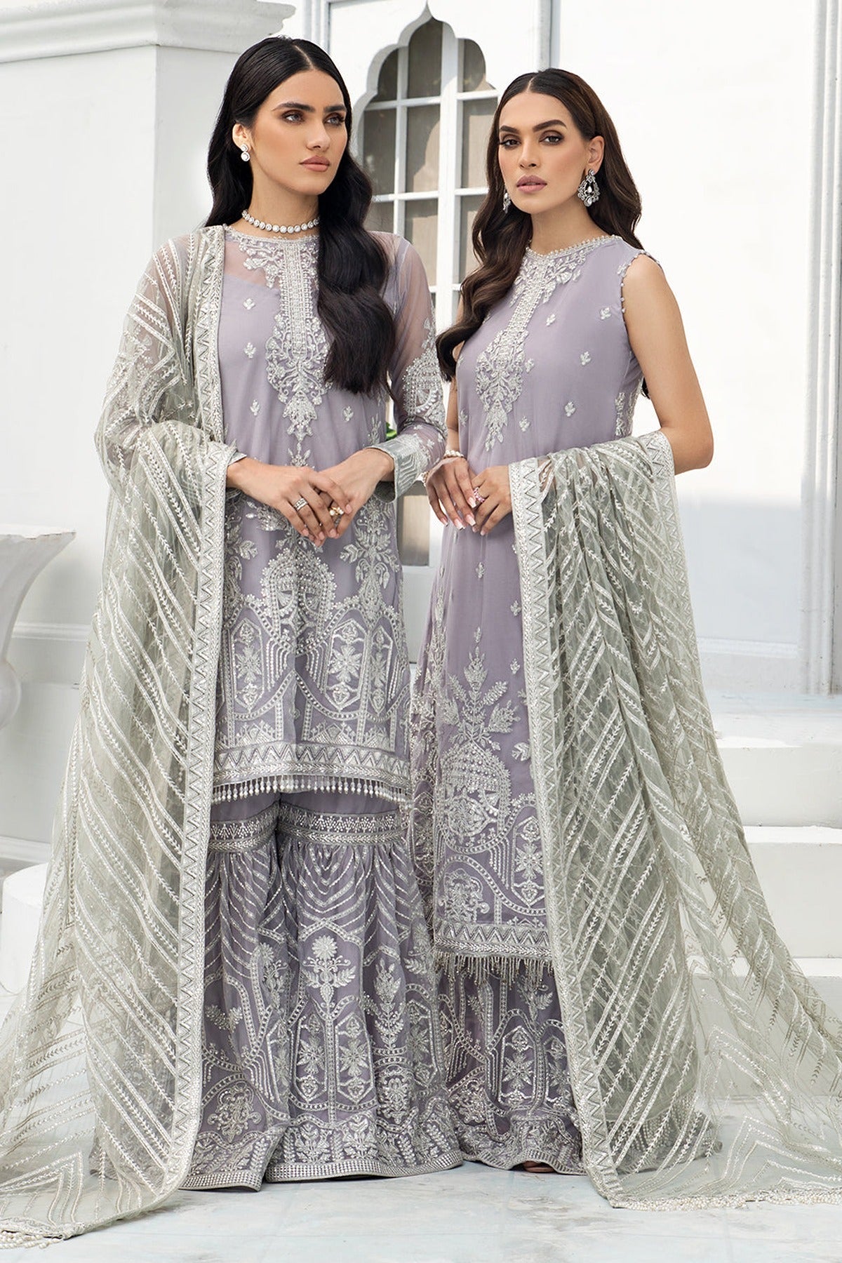 A comforting combination on periwinkle and mint, this is a mesmerizing attire featuring blissful embroideries in silver hued sequins. Paired with a contrast mint green dupatta this ensemble is brought to life and is a must have to up your style game this season.