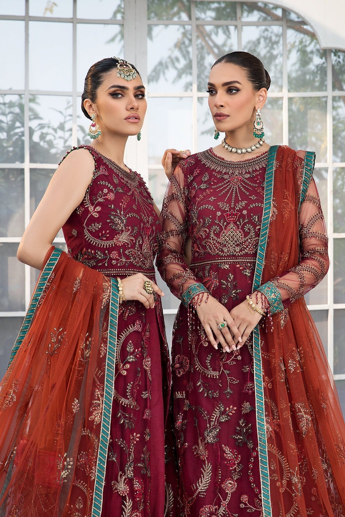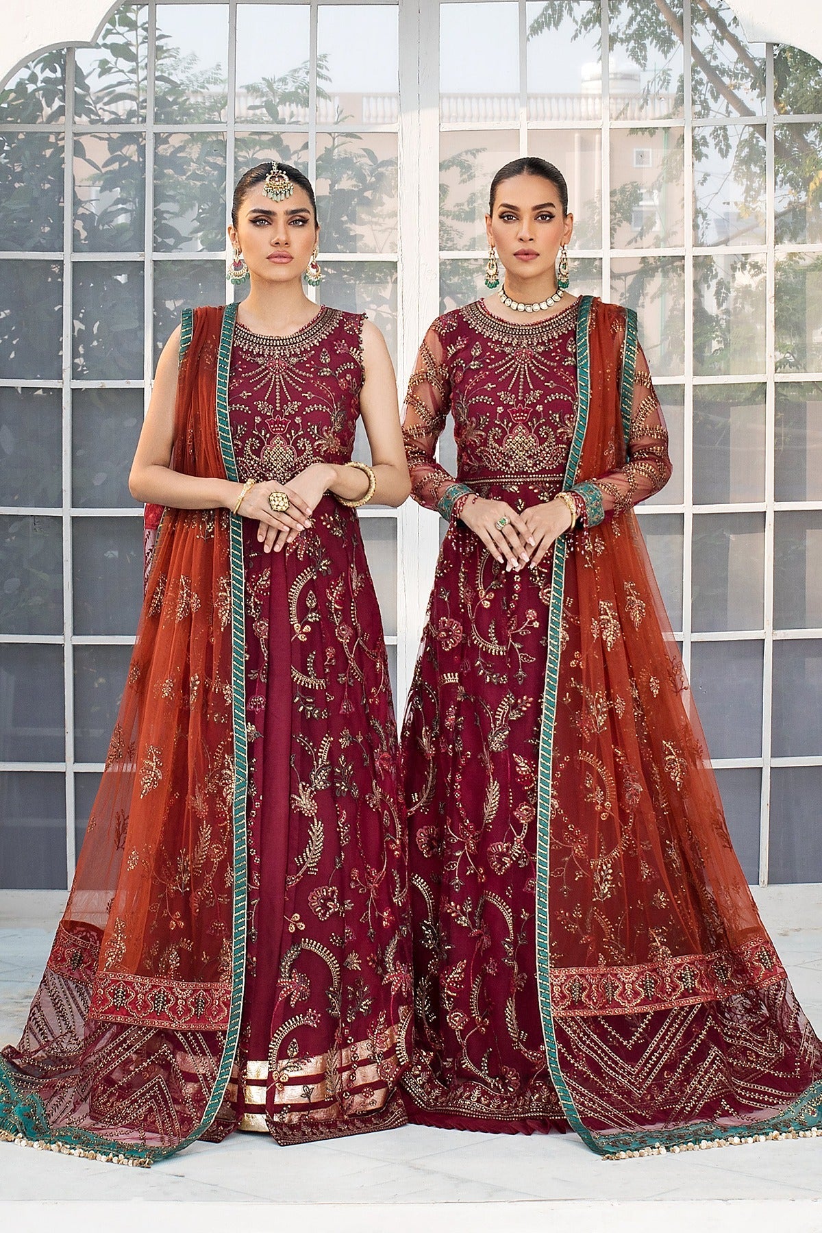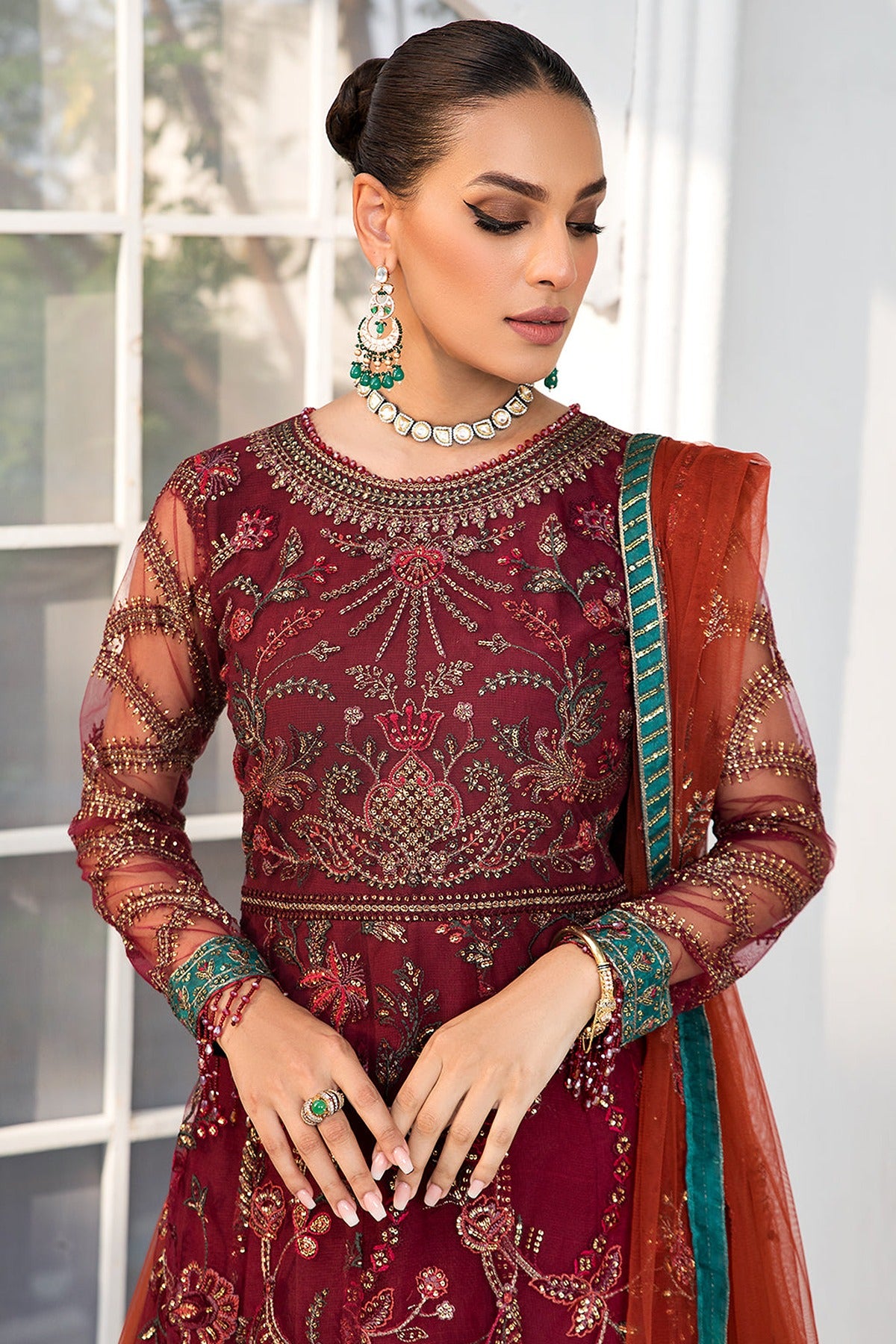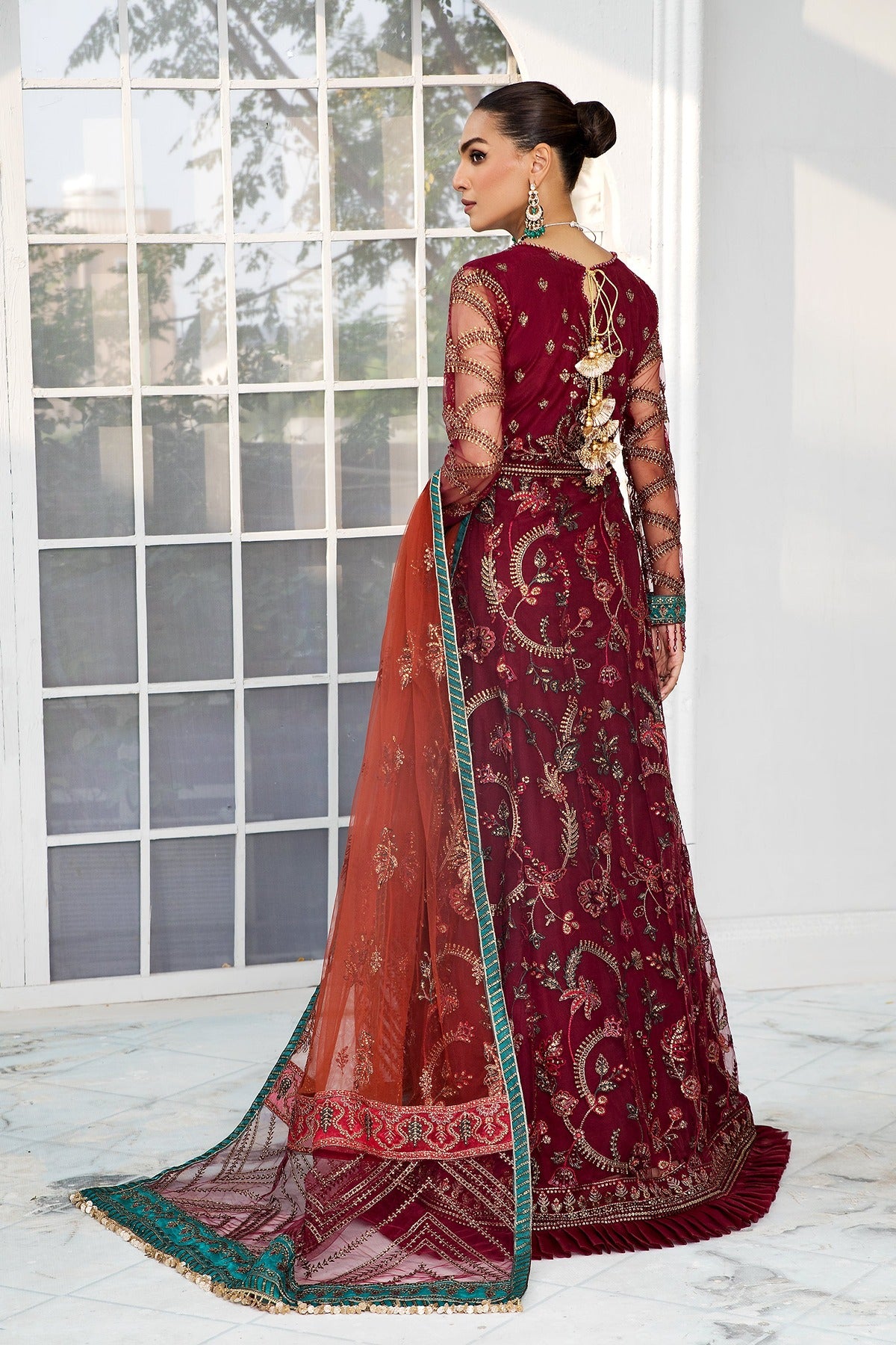Rendered in a maroon shade, this ensemble features a net canvas gracefully adorned in multi-hued embroideries. It comes with a contrasting dupatta in orange giving it an eye catchy appeal.
