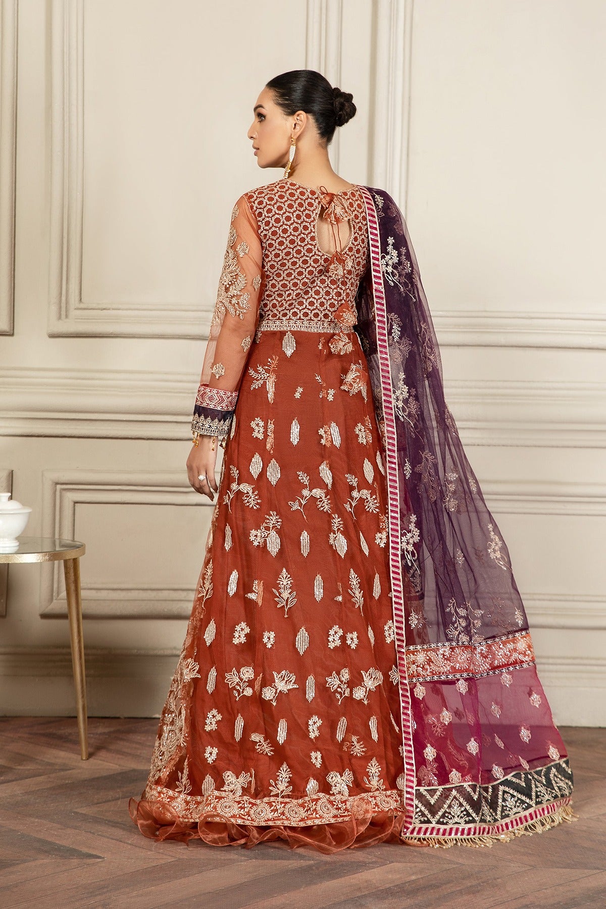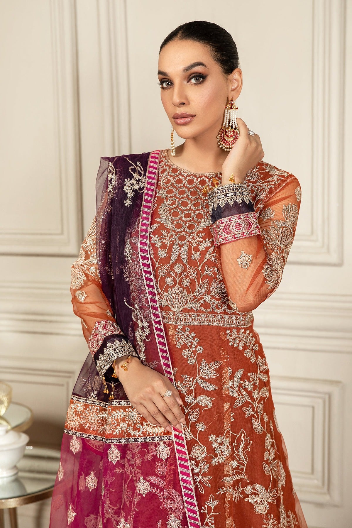 An alluring disposition of dreams, an orange surface attire is a vision to behold, as it comes with sequins heavily embellished on the ethereal base. Pleasingly curated in traditional patterns and motifs of the regal era. This is paired with a contrast purple dupatta and patches of pinks and greens.