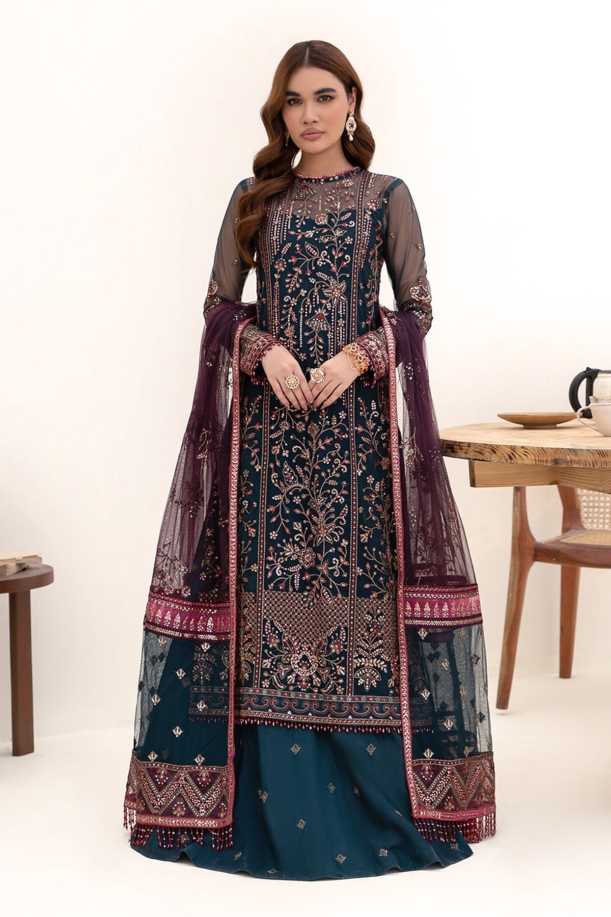 Featuring a bold yet subtle combination of colors and embroideries, this ensemble is a modern piece of art. Heavily embellished with sequins and threadwork, this is a masterpiece to flaunt on your formal occasions.