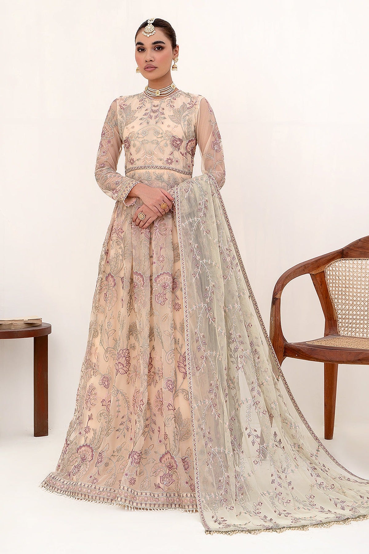This beautiful design is heavily curated with threadwork of accent colors on a light base. Paired with an embroidered dupatta this is a style a statement to carry on your formal gatherings.
