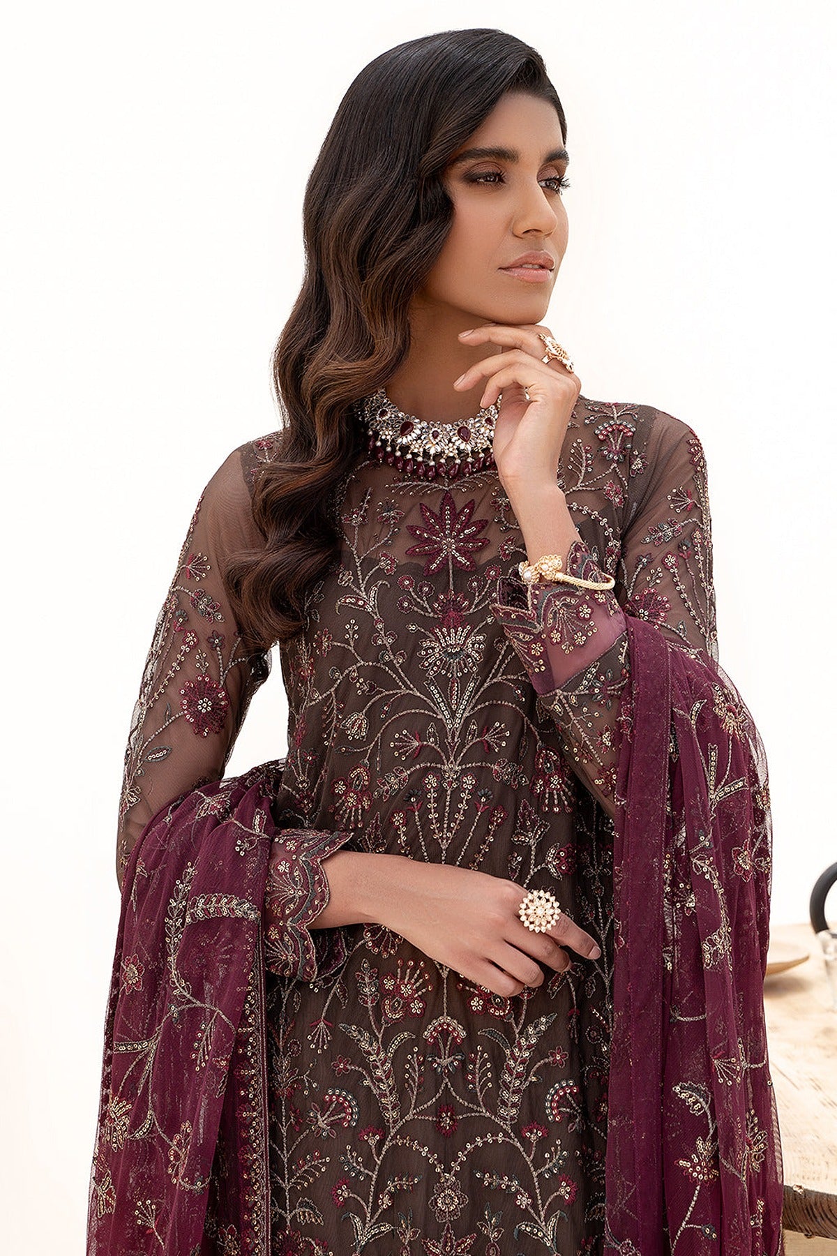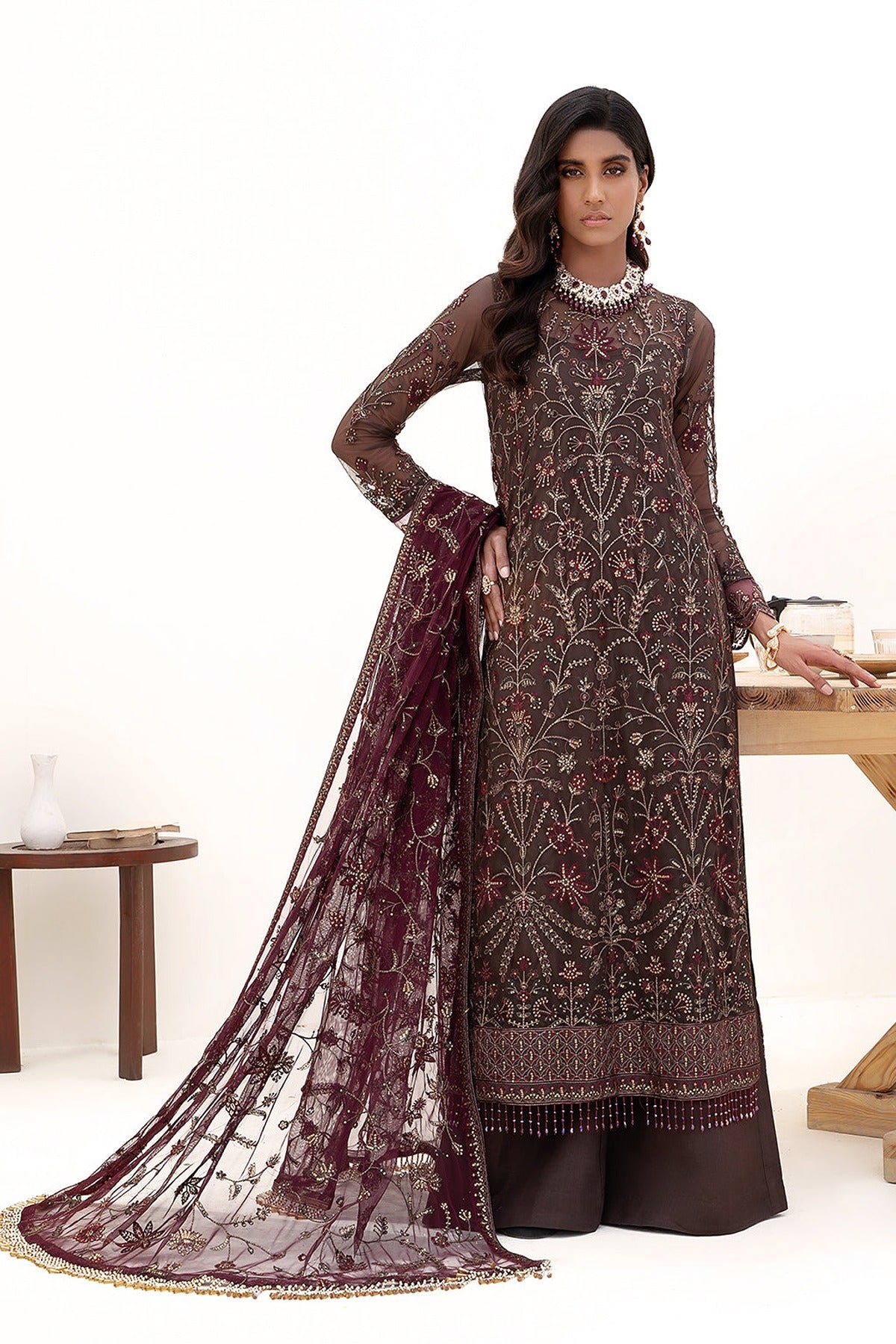This design is luxuriously embroidered into patterns of florals with sequins and threadwork. Featuring an artsy look, this is brought to life with contrasting embroidered dupatta in maroon.