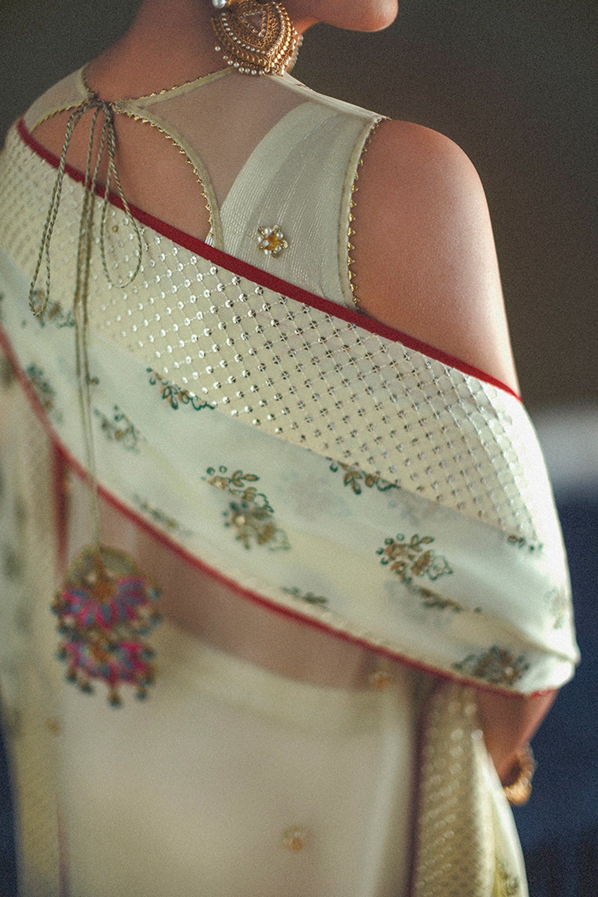 Mahrani - A celebration of timeless femininity, featuring a sleeveless round neck shirt adorned with exquisite hand-embroidered jaal, enhanced with dabka, nakshi, sequins, pearls, crystals, and delicate thread work. Lace inserts run throughout the design, adding texture and softness. It is paired with a flared trouser finished with a hand-embellished border and lappa inserts for a regal touch. The look is completed with a printed medium silk dupatta, bordered with contrast piping for a refined finish. Exquisite tassel detailing at the back neckline brings an element of graceful movement to this poised and elegant ensemble.