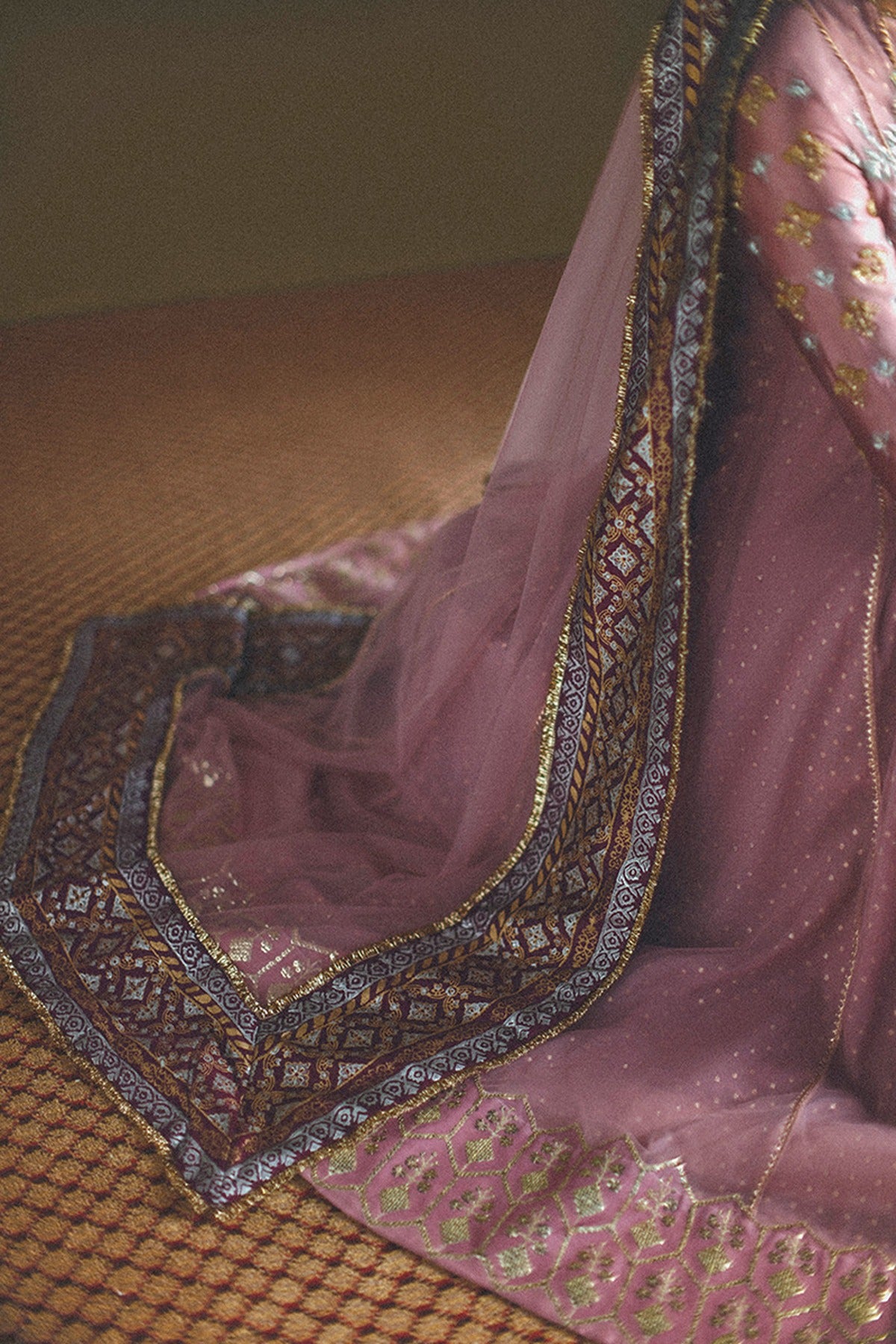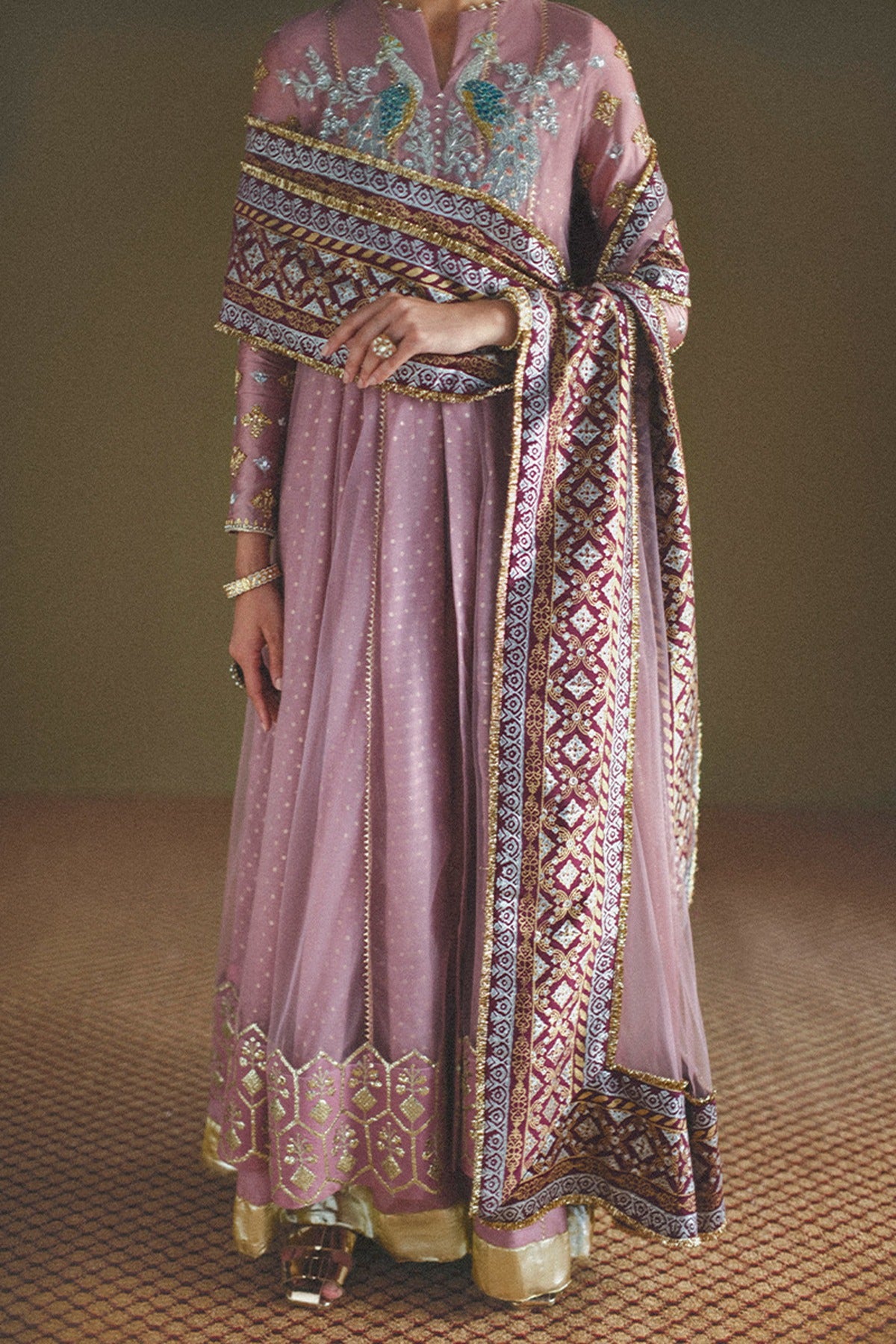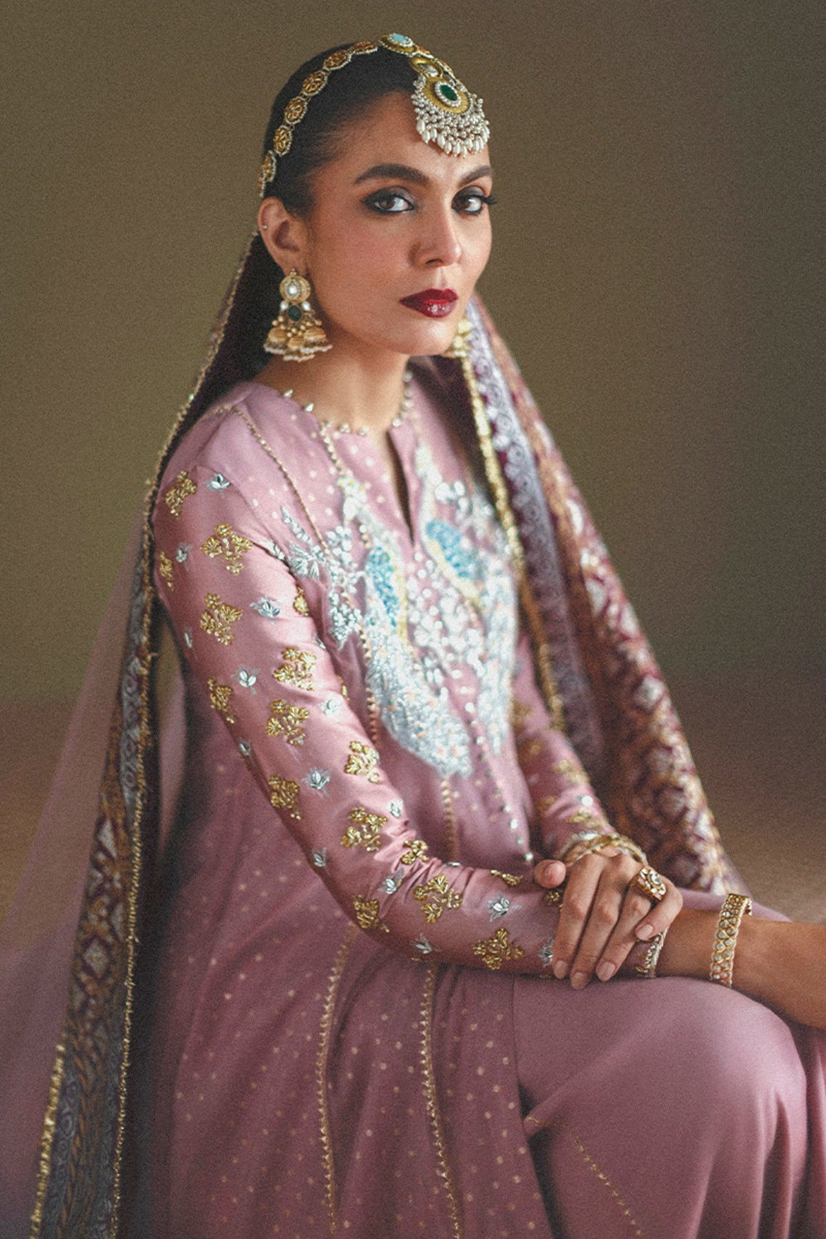 Morni - A tribute to regal tradition, Morni features a flowing kali dar pishwas adorned with exquisite hand-embroidered and embellished motifs on the shirt and sleeves. Intricate detailing with cut dana, nakshi, dabka, sequins, pearls, and crystals creates a rich tapestry of craft. The hem is elevated with a striking sequin pattern and delicate lace inserts throughout. Paired with a beautifully flared sharara enhanced with lappa and lace detailing, the ensemble is completed with a net dupatta finished with a block-printed border and soft lace trims. A timeless silhouette that blends heritage with festive splendor.
