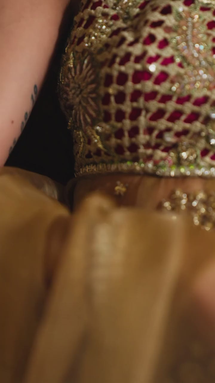 Gold Raani - A soft beige hue with a regal fuchsia accent, Gold Raani is a true masterpiece of craftsmanship. The organza shirt features a front slit with a halter-style bodice, intricately detailed with cutwork and exquisite hand embellishments that radiate luxury. Paired with a voluminous shimmer sharara showcasing a crushed flare and lappa pati accents, the ensemble flows with grandeur and grace. An optional organza dupatta, finished with gota-embellished borders, adds a touch of festive finesse, while a matching embellished pouch can be added for the perfect finishing detail.