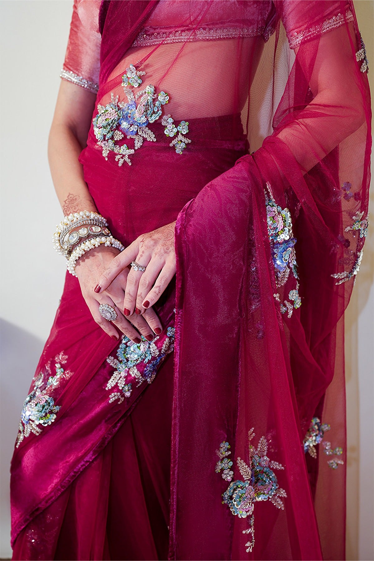 Mastani - In a dreamy blend of tea pink and deep plum, Mastani is a vision of refined grace. The velvet blouse features a deep V-neckline with delicately hand-embellished edgings, radiating timeless sophistication. Paired with a net sari adorned with hand-embellished floral bunches throughout and finished with a wide velvet border, this ensemble is the perfect balance of elegance and allure.