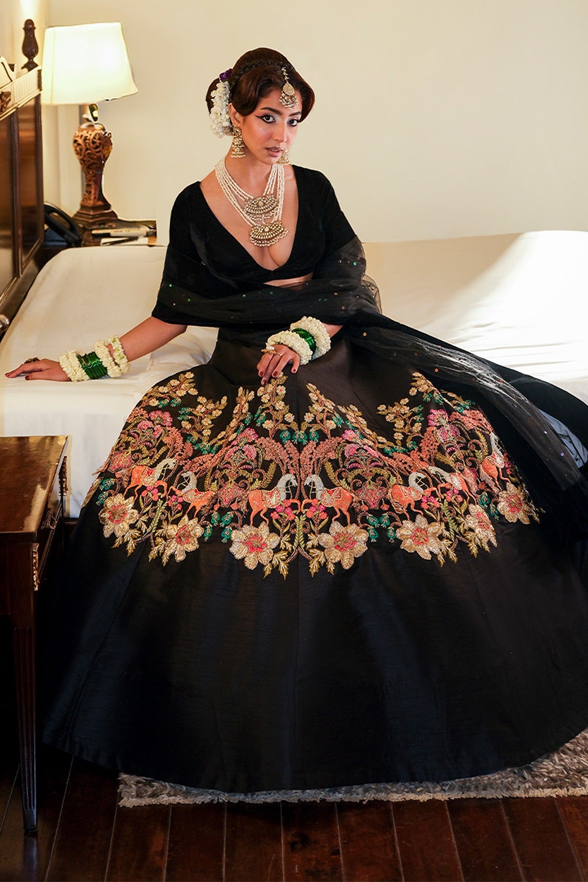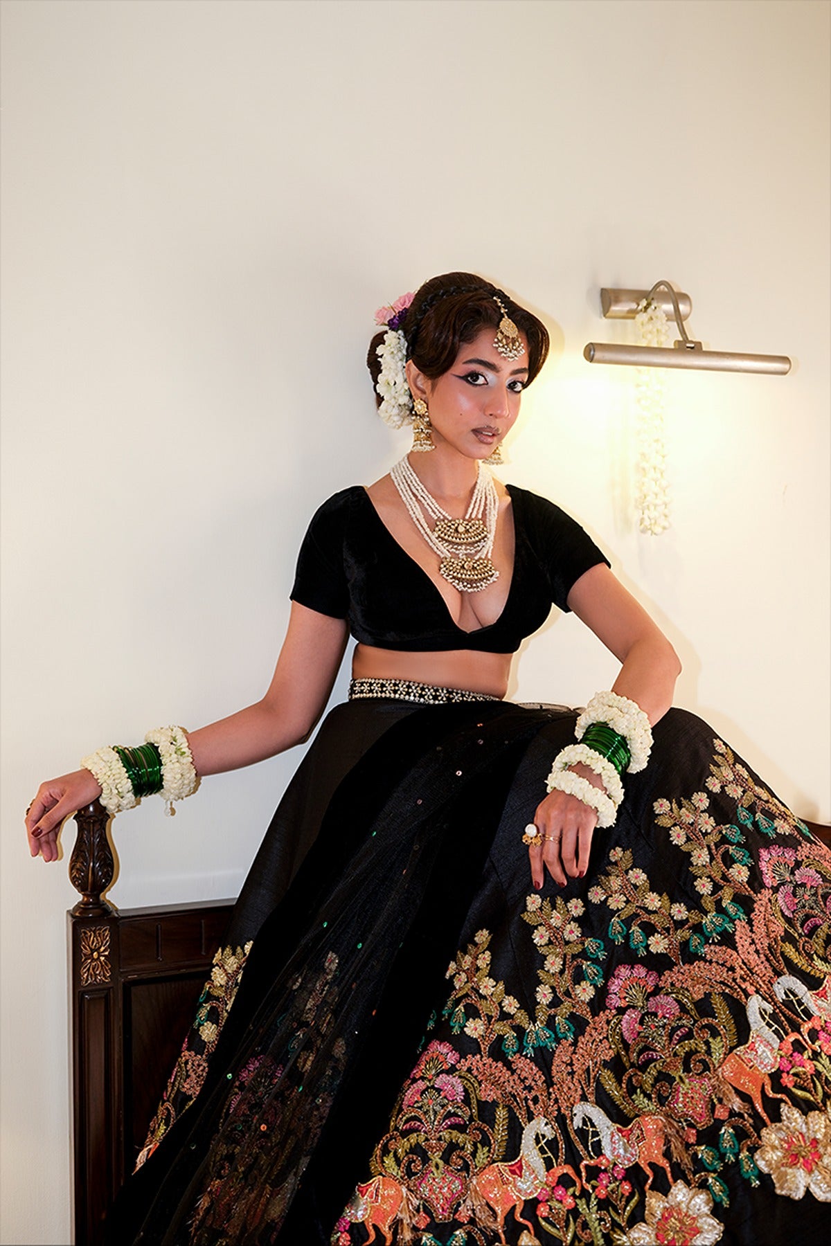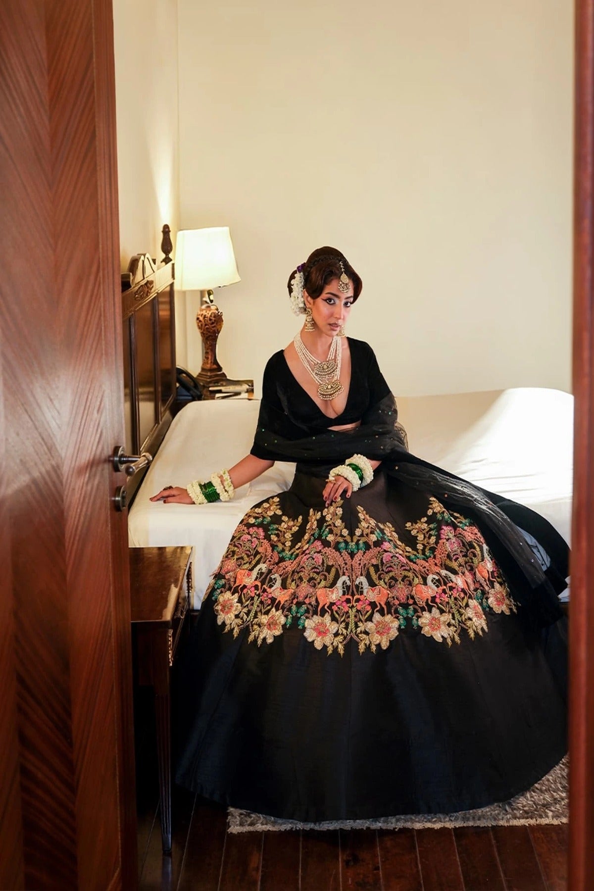 A striking black ensemble, Midnight Haseena pairs a deep-neck velvet blouse with short sleeves and a full-flared raw silk lehnga, brought to life with intricate multicolored embroidered panels crafted to perfection. The look is completed with a net dupatta, lavishly adorned with a heavy multicolored sequin spray, making this outfit a true statement of bold elegance.