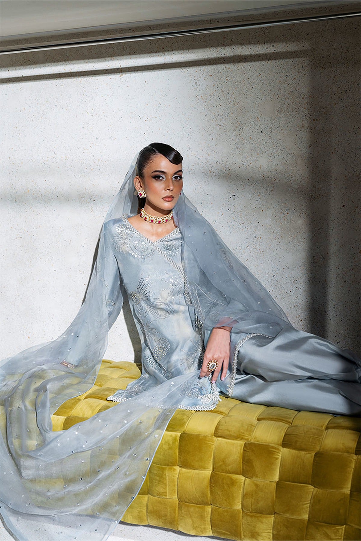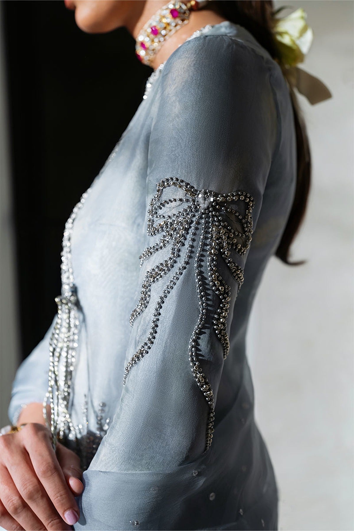 Blooming — where tradition meets modern elegance. This mid-thigh Angrakha-style shirt with side slits is paired with a classic shalwar and a flowing organza dupatta. The neckline and front panel are intricately embellished with crystals, pearls, beads, and delicate sequin work, complemented by tie-dye lining and detailed tassel accents. The sleeves are adorned with meticulous embellishment, finished with a charming bow detail and samosa lace. The shalwar features tuck pleats and samosa lace at the hem for added finesse, while the dupatta completes the look with a shimmering, heavy sequin spray.