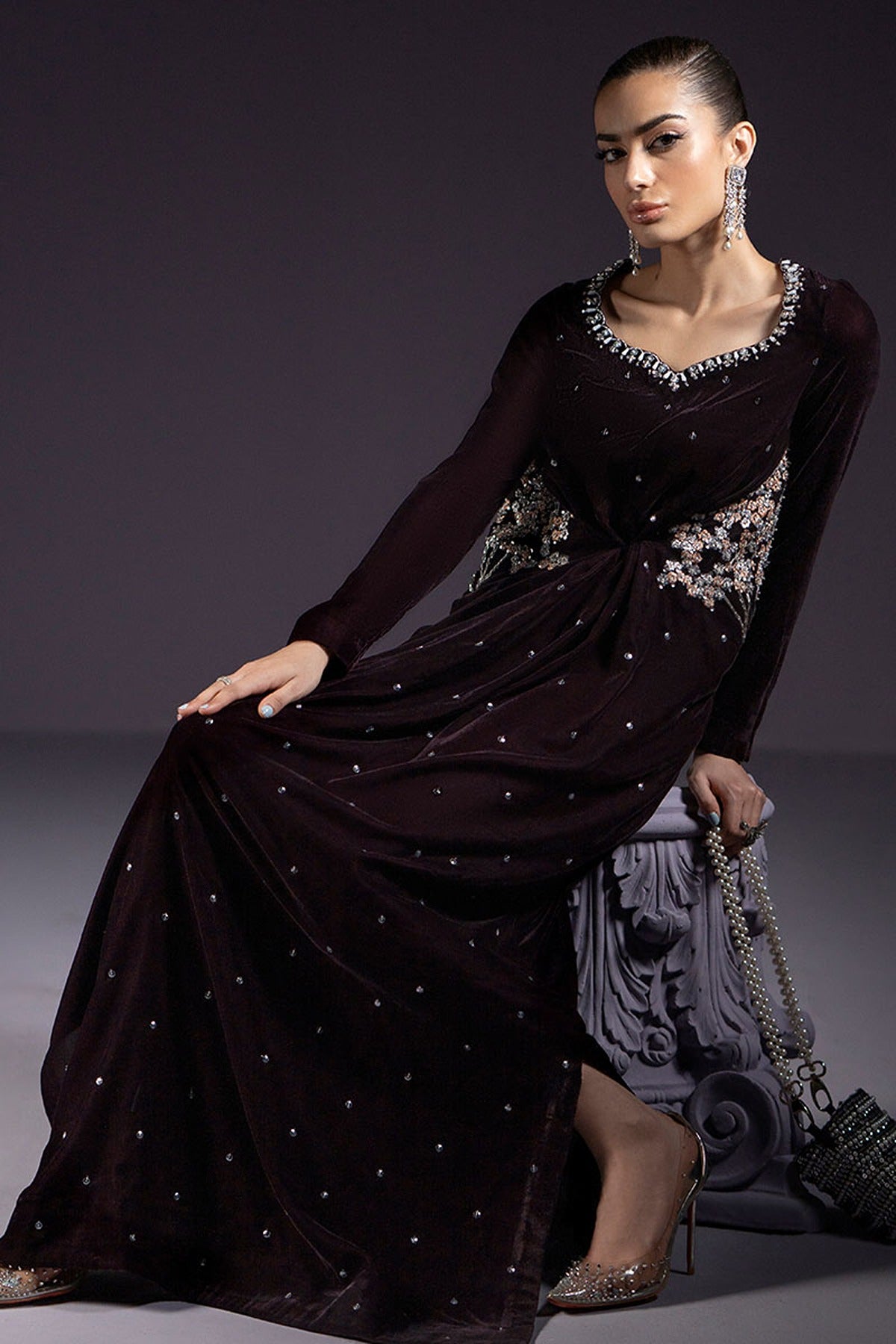 Indulge in luxury with this exquisitely deep purple shirt, adorned with intricate floral embellishments that elegantly cinch the waist. The subtle sequin spray throughout imparts a sophisticated allure, ensuring every step you take is illuminated with sparkle. The enchanting blend of rich color and detailed craftsmanship makes this outfit a timeless statement of refined glamour. Completing the opulent look is an embellished bag, adding an extra touch of elegance.