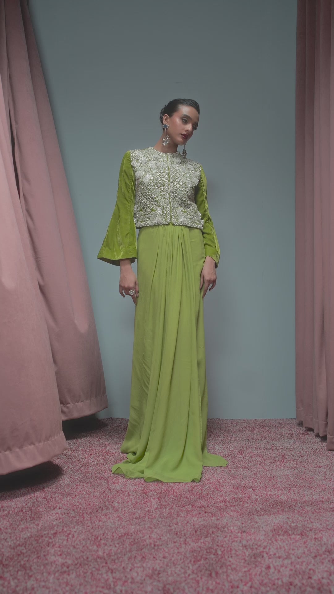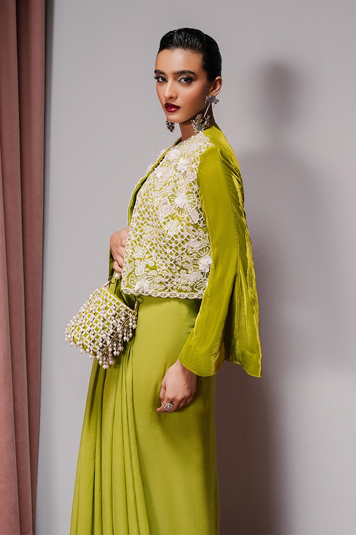 A captivating ensemble that brings together edgy elegance and contemporary flair. This set features a short velvet jacket in striking neon green, beautifully adorned with intricate all-white embroidery, shimmering beadwork, and accents of pearls, sequins, and crystals for a truly radiant finish. Paired with a softly draped chiffon skirt, the outfit flows gracefully, adding movement and charm.