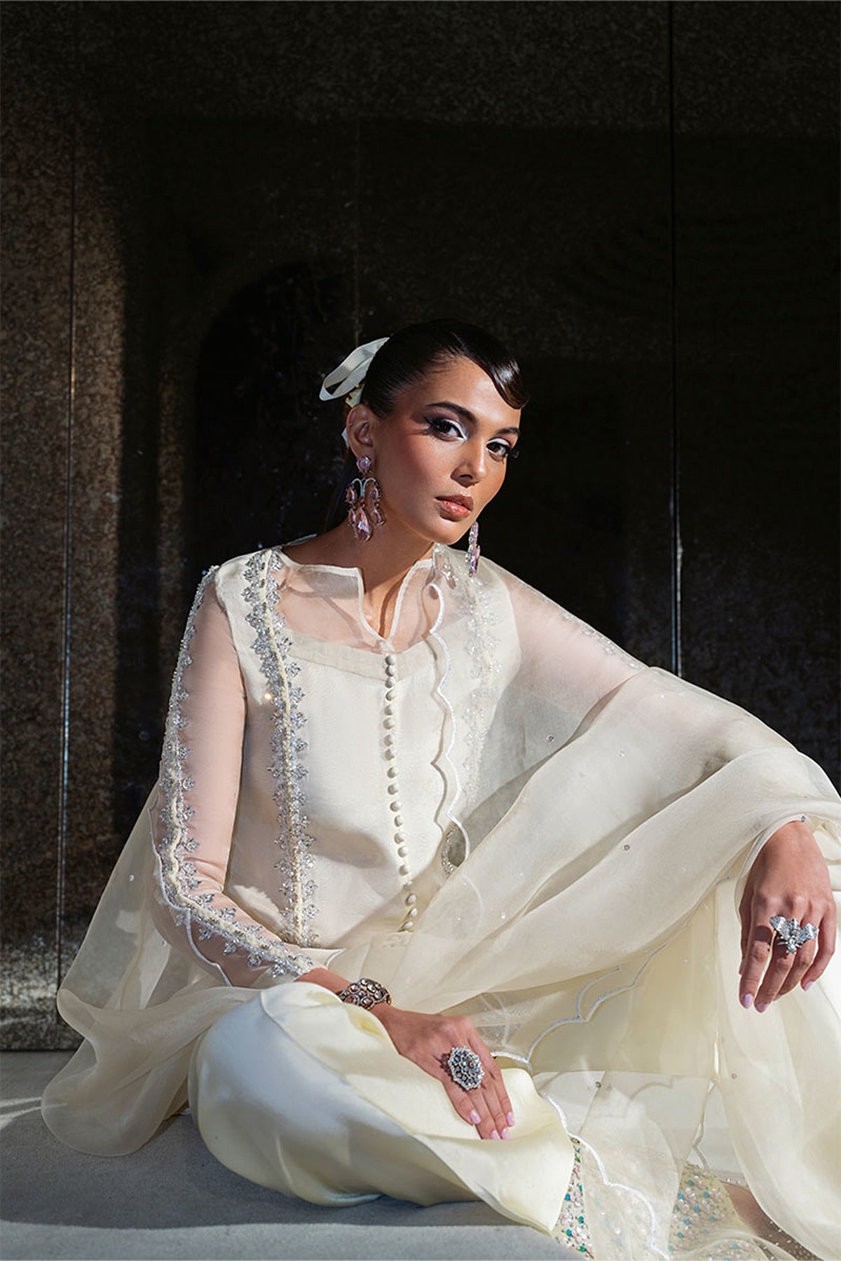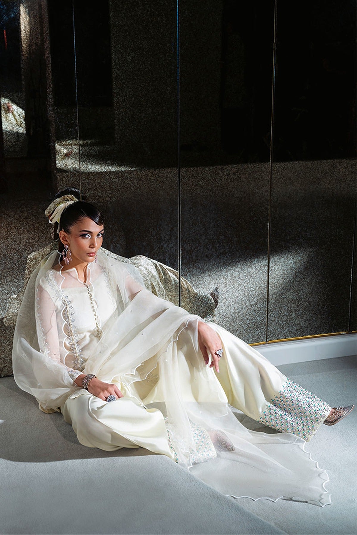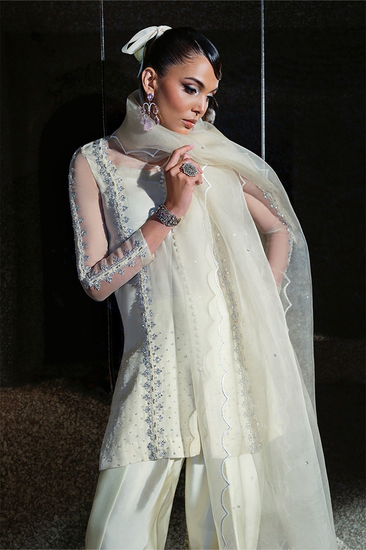 Shirt with Shalwar Cham Cham – in the softest shade of lemon, where every detail dazzles. The shirt is adorned with hand embellishments — crystals, sequins, stones, and Swarovski’s — finished with braid accents and loop button detailing. Paired with a delicately embellished shalwar and a scalloped organza dupatta dusted with sequin spray. Elegant. Playful. Unmissable.