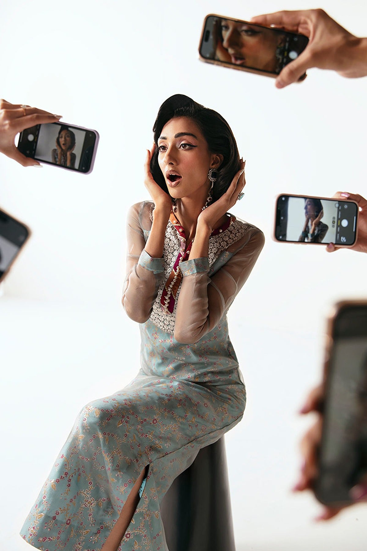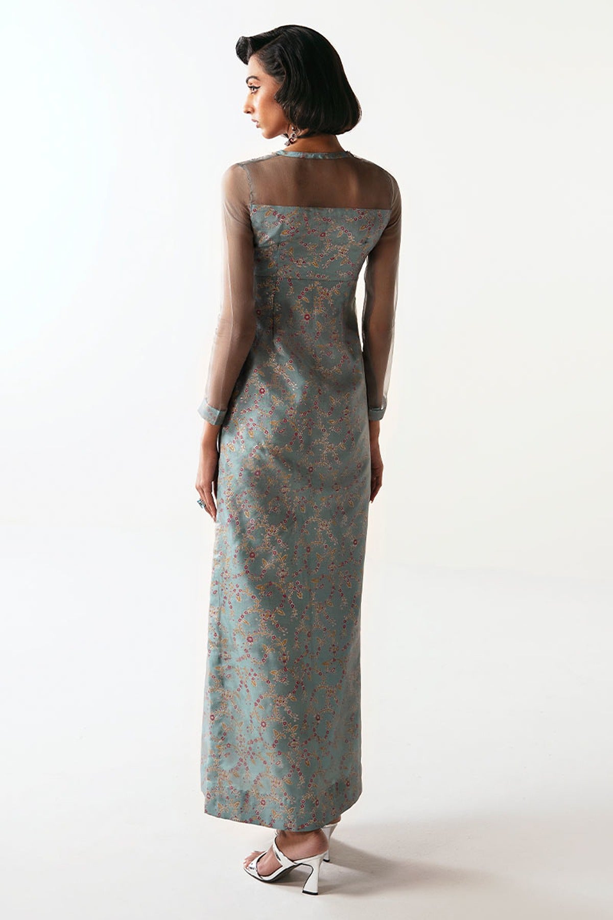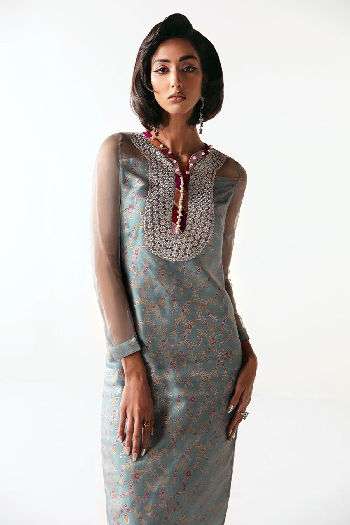 Elevate your style with our 'Dove', a symphony of elegance and contemporary flair. This three-piece ensemble features a sky gray, embroidered organza long shirt with side short slits, complemented by a block-printed lining for added sophistication. Paired seamlessly with a cigarette trouser, this outfit exudes modern charm. The ensemble is completed with an organza dupatta, enhancing your look with an ethereal touch.