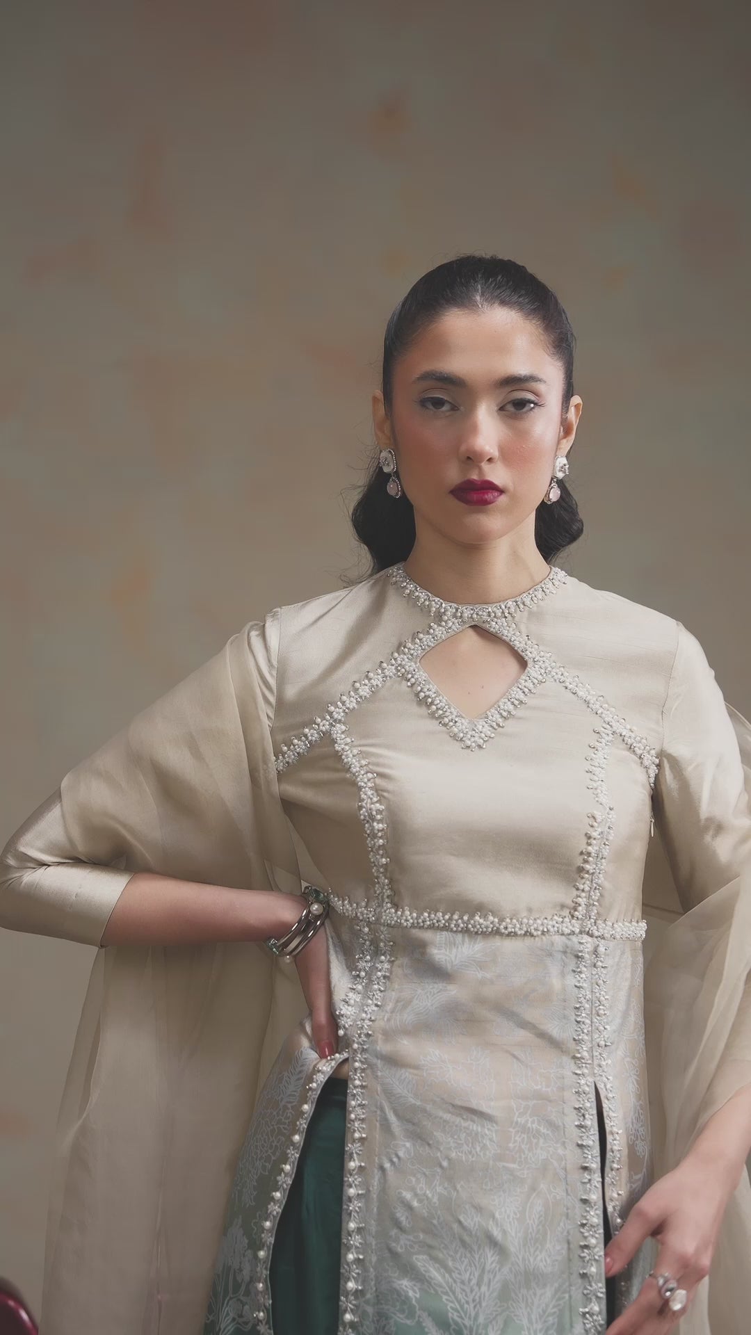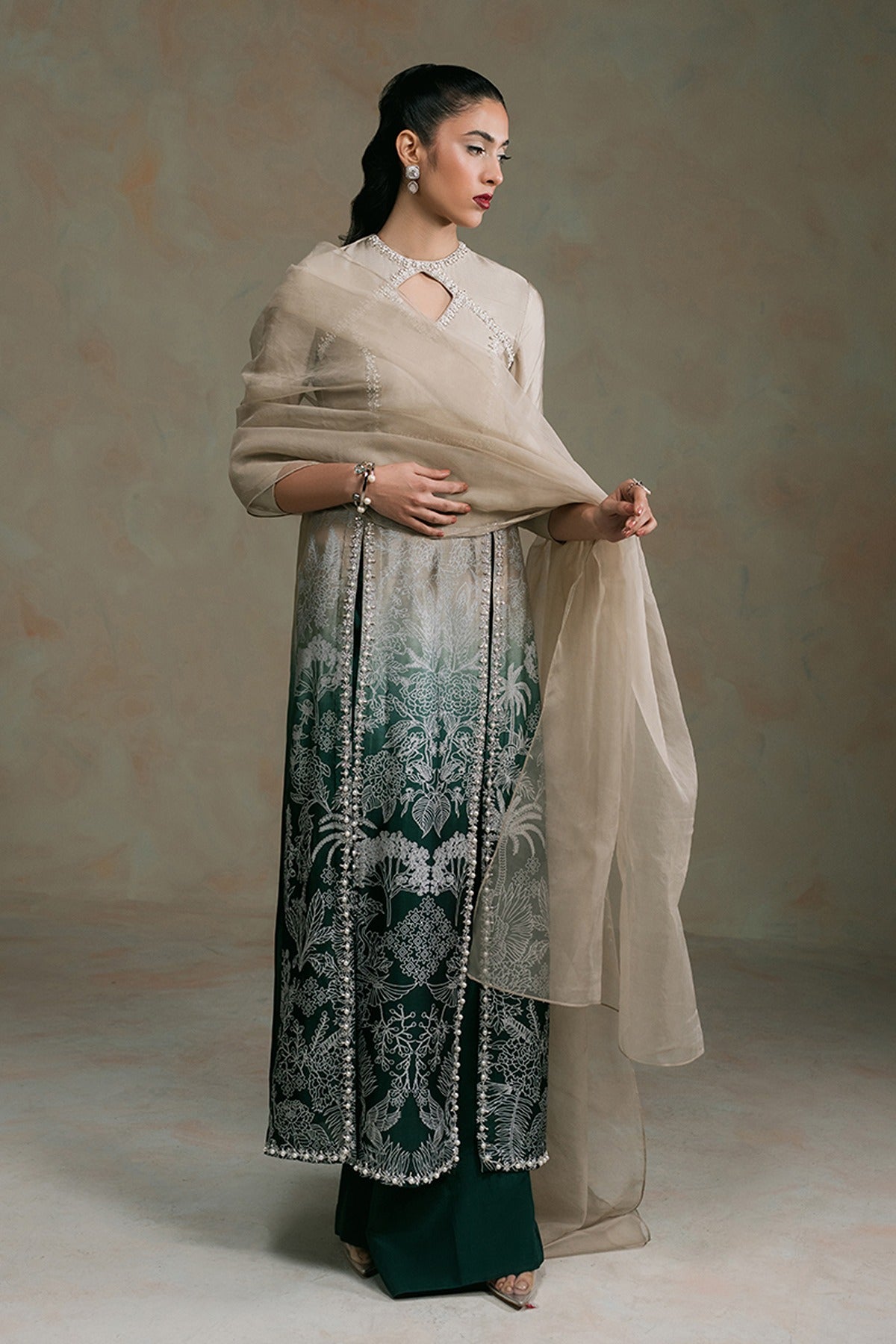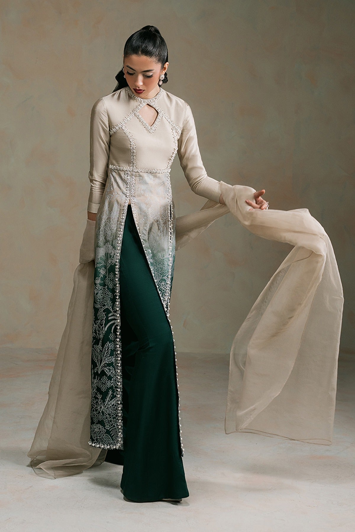 Ever After - Draped in an ethereal ombré hue, Ever After is a vision of grace and sophistication. Crafted from luxurious tissue silk, the panelled shirt features waist-high slits, exuding effortless charm. Each printed panel is meticulously adorned with hand-embellished borders, brought to life with Swarovskis, pearls, and sequin work, adding a touch of refined brilliance. The intricately embroidered and embellished bodice, accentuated with a delicate cut-out detail, elevates the look, making it a true statement piece. Paired with a chic boot-cut trouser and a flowing organza dupatta, this ensemble is a perfect harmony of tradition and modern elegance.