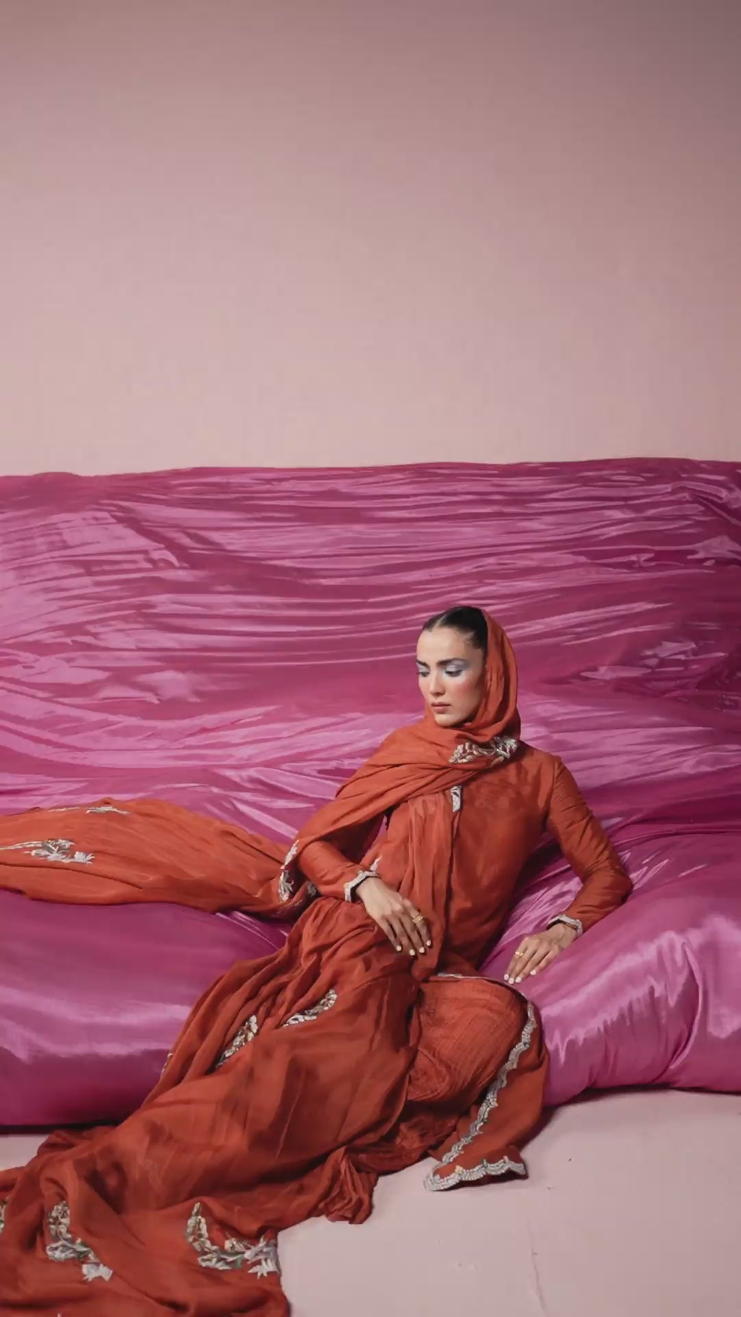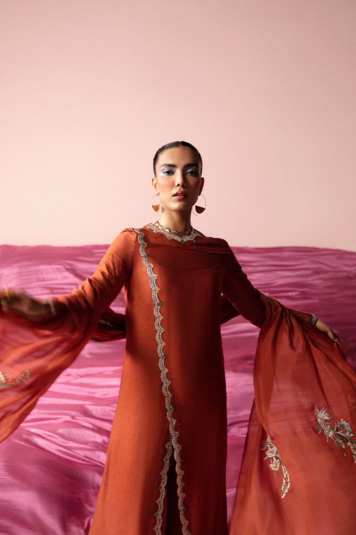 Feeling Floral" in rust, a quintessential ensemble to elevate your style. This set features an asymmetric cotton net dress with a front slit, full sleeves, and crushed Thai silk pants. The dress boasts intricate machine embroidery on the neckline, front edging, and sleeves. Complete with a medium silk dupatta adorned with pretty floral motifs.
