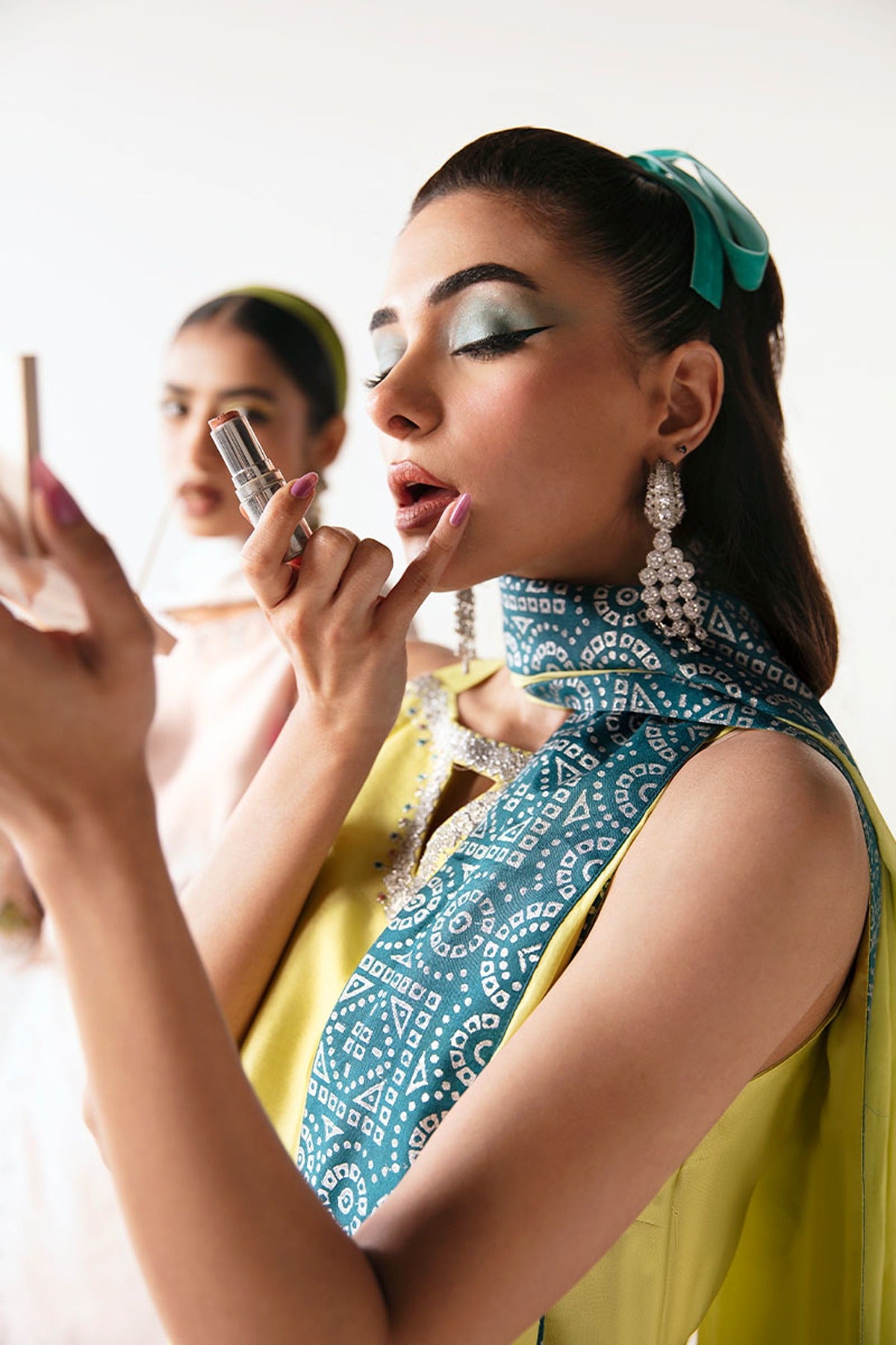 Adorned in the resplendent hues of lime yellow, 'Finch' epitomizes sartorial elegance. The sleeveless cut of the embroidered short tissue silk shirt harmonizes with the opulence of flared panelled trousers, meticulously crafted from Thai silk, featuring a mesmerizing metallic silver block printing design. Completing this ethereal ensemble is a silk dupatta, adorned with teal-colored block-printed borders, invoking an aura of regal sophistication