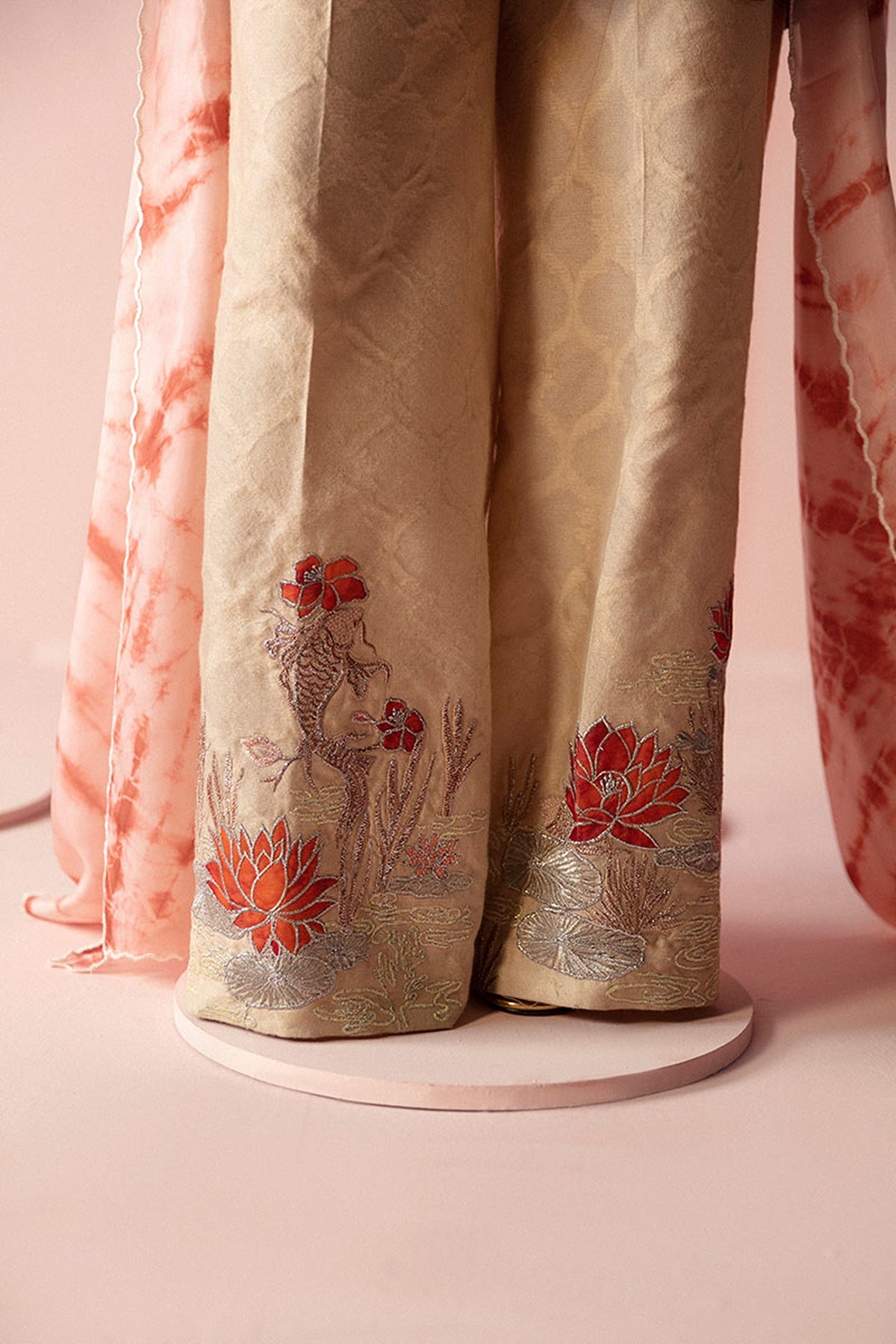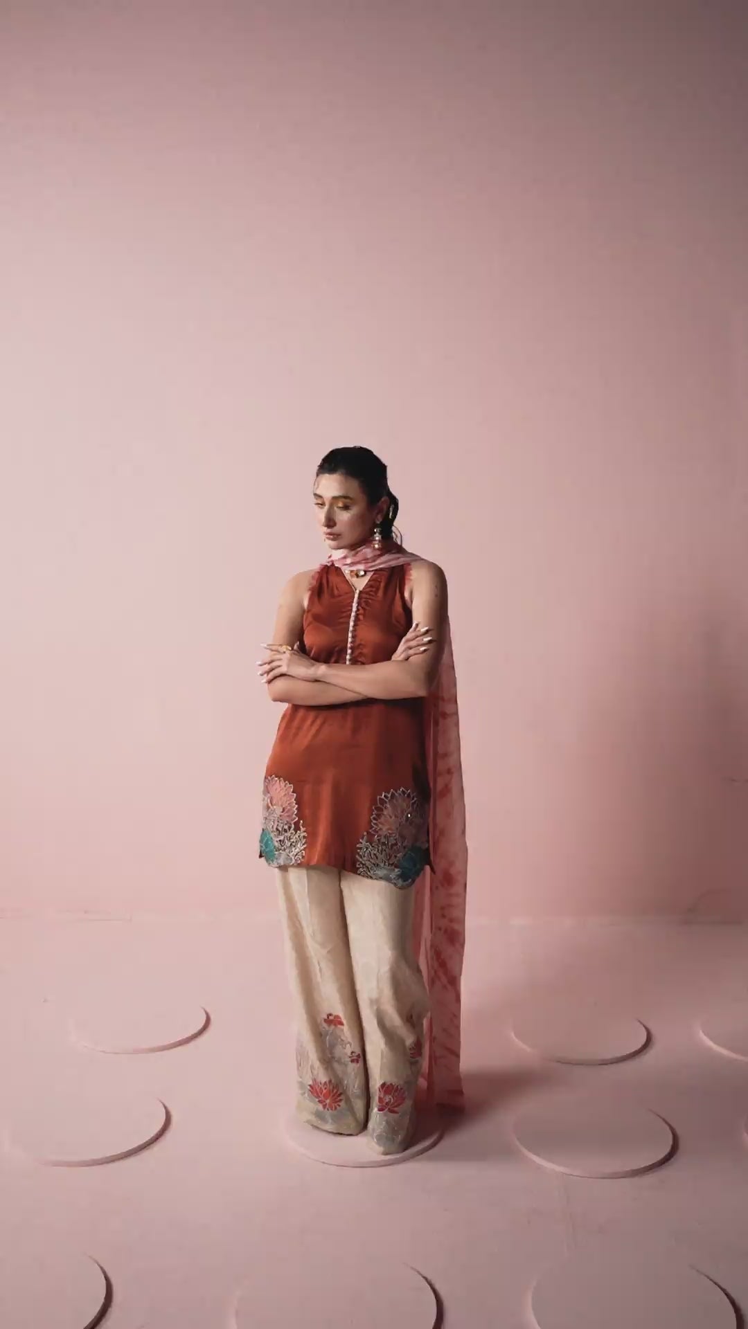 Revel in refined style with our "Fire Lily" ensemble in Rust. This V-neck halter shirt features frayed organza edging, contrast piping, and loop button details, perfectly paired with relaxed-fit trousers. The exquisitely patched and machine-embroidered floral motifs on the shirt edges, coupled with the intricate details on the embroidered trousers, make this outfit a standout choice for any occasion.